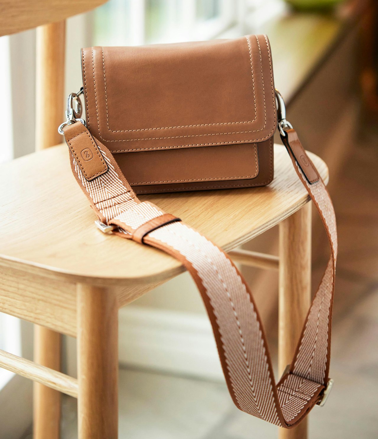 Wastani axelrem från Saddler kombinerar mönstrad webbing med detaljer i buffelläder för ett uttryck som känns både samtida och stilrent. Den präglade Saddler-logotypen och hårdvara i blank silverfärgad metall ger en exklusiv finish som lyfter helhetsintrycket på din väska.