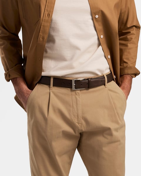 Saddler Odense Läderbälte 95cm är ett trendigt och stilrent herrbälte i vegetabiliskt garvat full grain-läder av högsta kvalitet. Med sin klassiska färg och ett elegant spänne i silverfinish blir det ett mångsidigt tillbehör som fungerar lika bra till jeans som till chinos och kostymbyxor. Bredden på 3,5 cm gör det till ett balanserat val för både vardag och mer formella tillfällen.