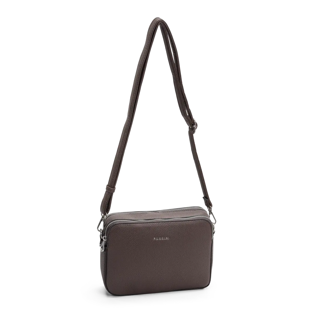 Denna crossoverväska från Puccini är ett utmärkt val för den stilmedvetna. Tillverkad i mjuk, veganvänlig skinnimitation, kombinerar den hållbarhet med en lyxig känsla. De silverfärgade metalldetaljerna förstärker det exklusiva intrycket och gör väskan till en elegant accessoar för alla tillfällen.