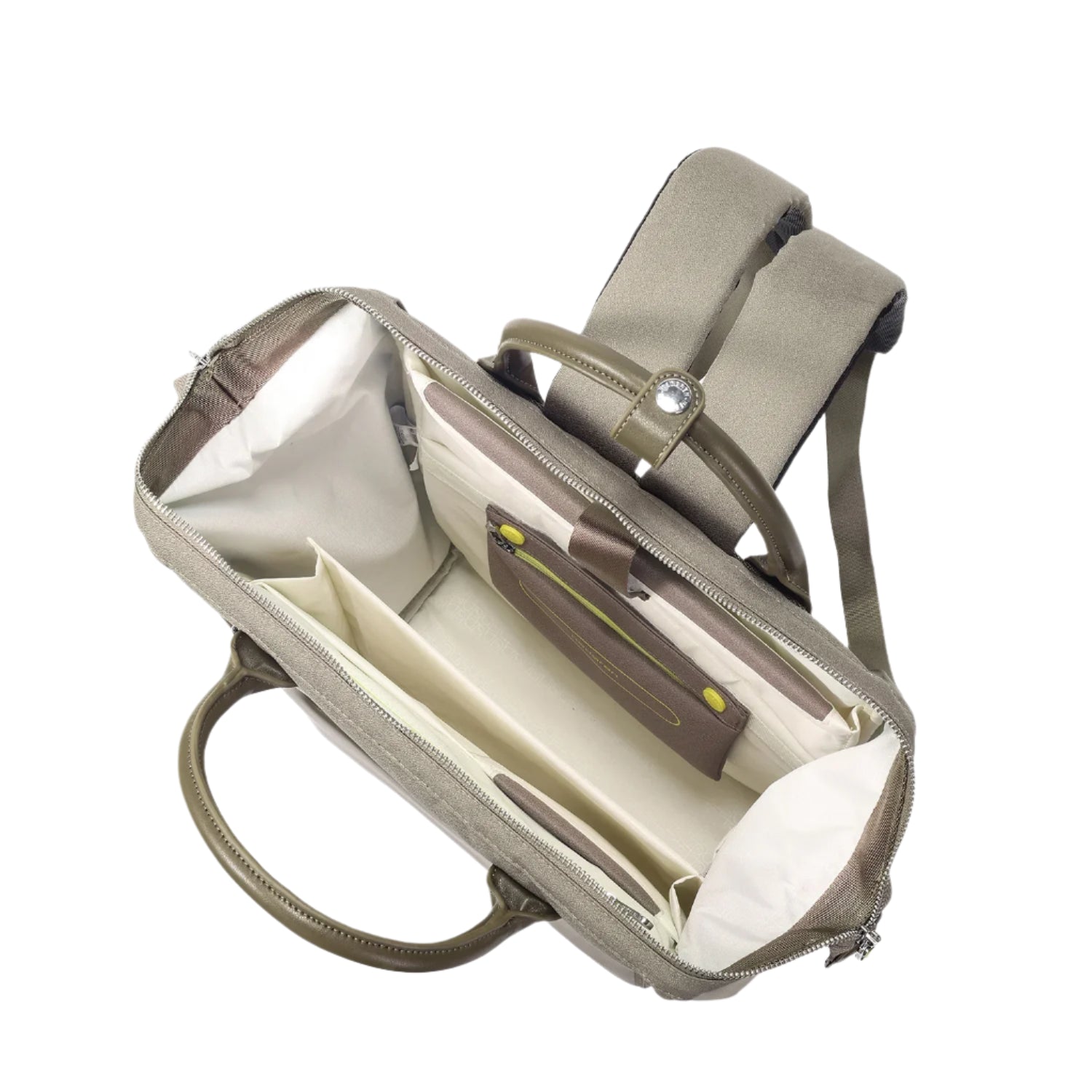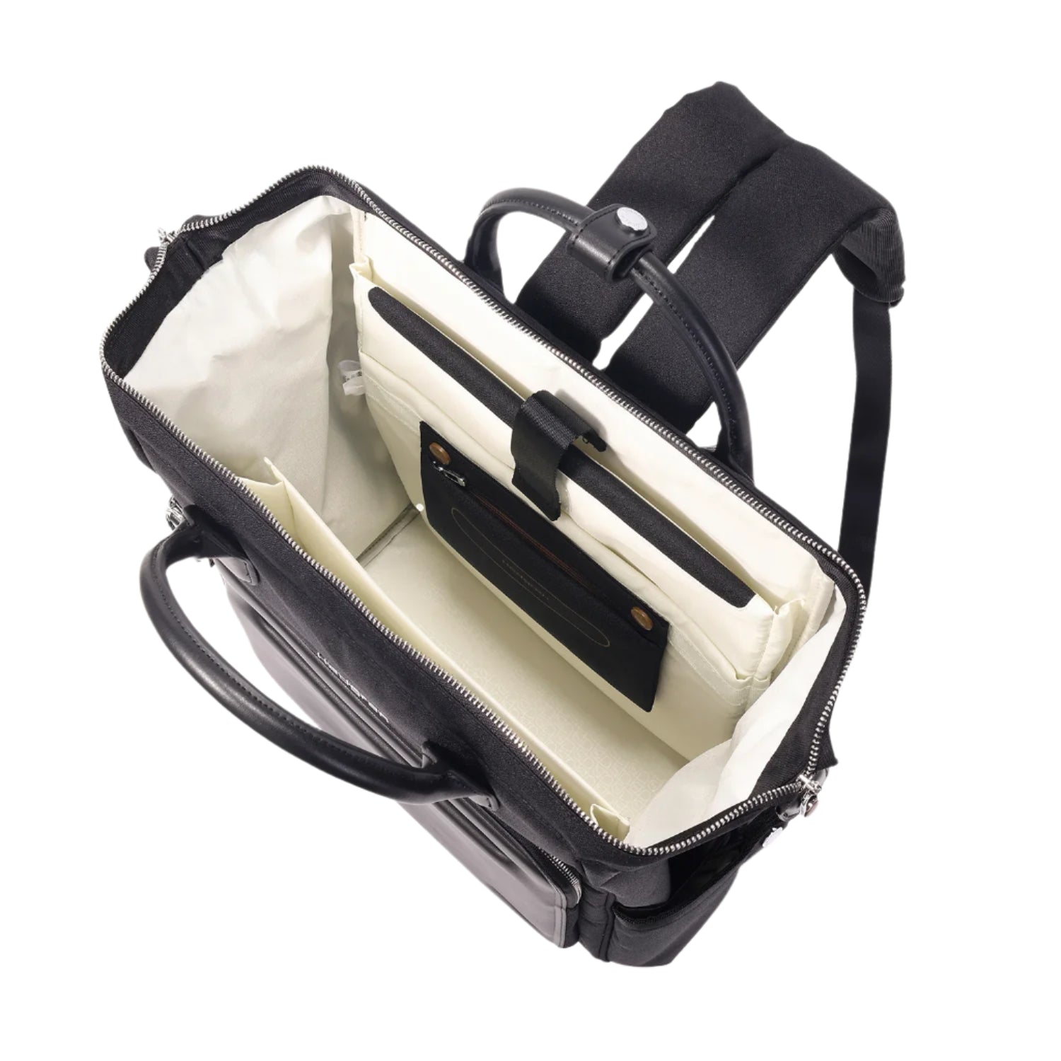 Moka L har avancerade organiseringsfunktioner som RFID-skyddade fickor för att blockera obehörig skimming av dina kort. Dessutom finns det volympappershållare, pennhållare och ytterligare vadderade fack för känsliga enheter. En löstagbar innerpåse med dragkedja och tryckknappar ger extra flexibilitet och struktur, vilket gör det enkelt att hålla ordning på dina tillhörigheter.