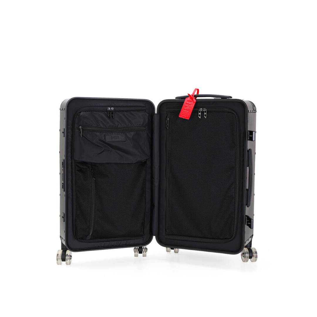 Invändigt erbjuder resväskan en genomtänkt förvaringslösning med två stora huvudfack, en dragkedjeficka samt två nätfickor med dragkedja. Den uppdelade strukturen gör det enkelt att organisera kläder, hygienartiklar och elektronik på ett överskådligt sätt. Den emaljerade metallogotypen på framsidan ger väskan ett elegant och exklusivt uttryck som förstärker Diesels karakteristiska design.
