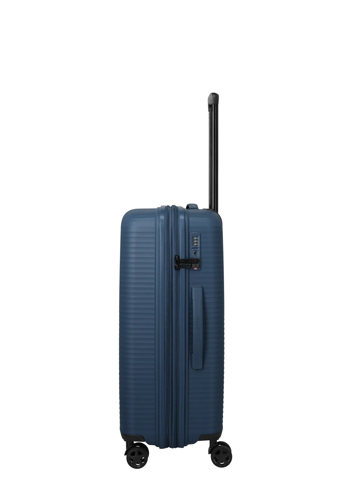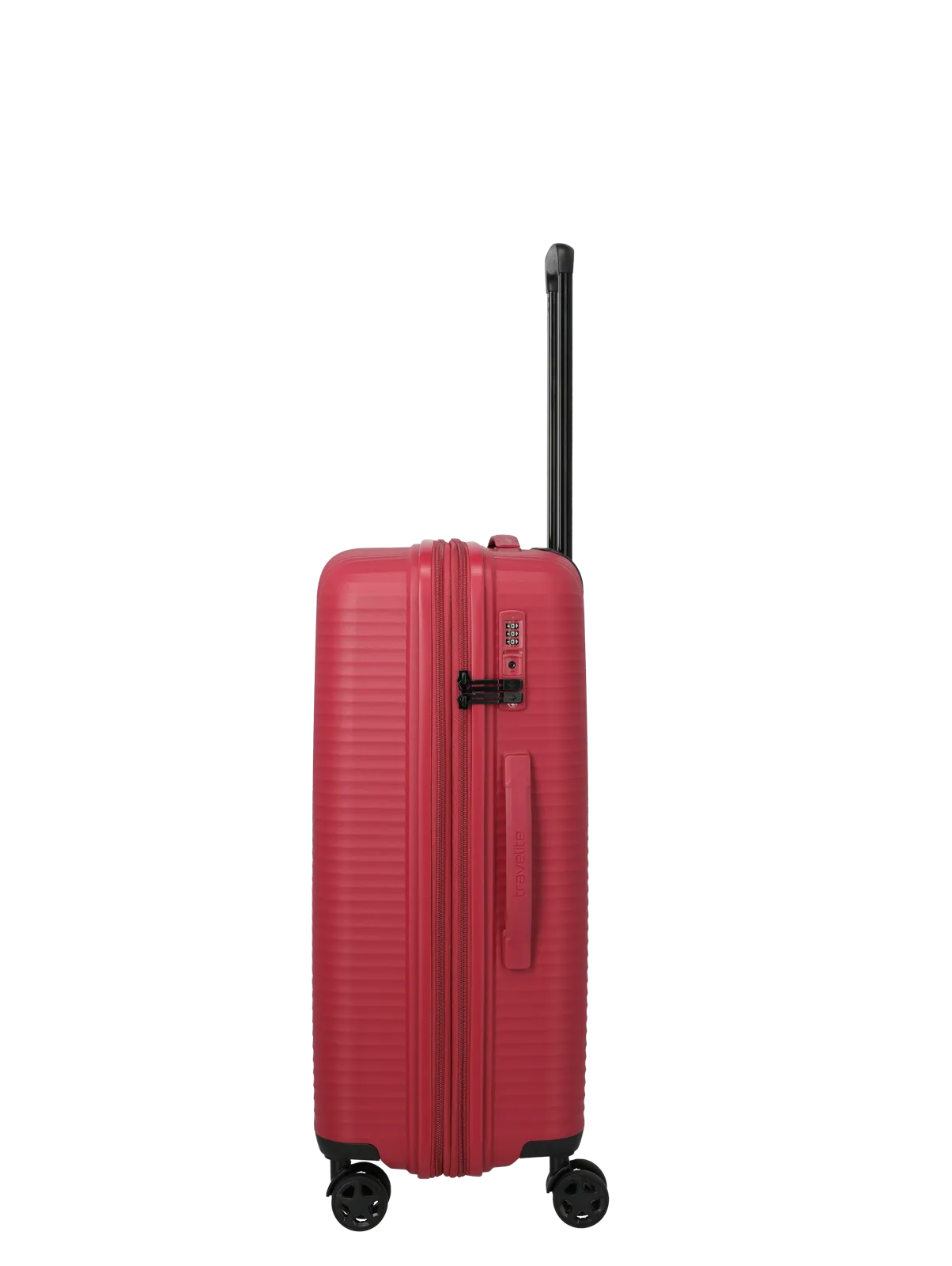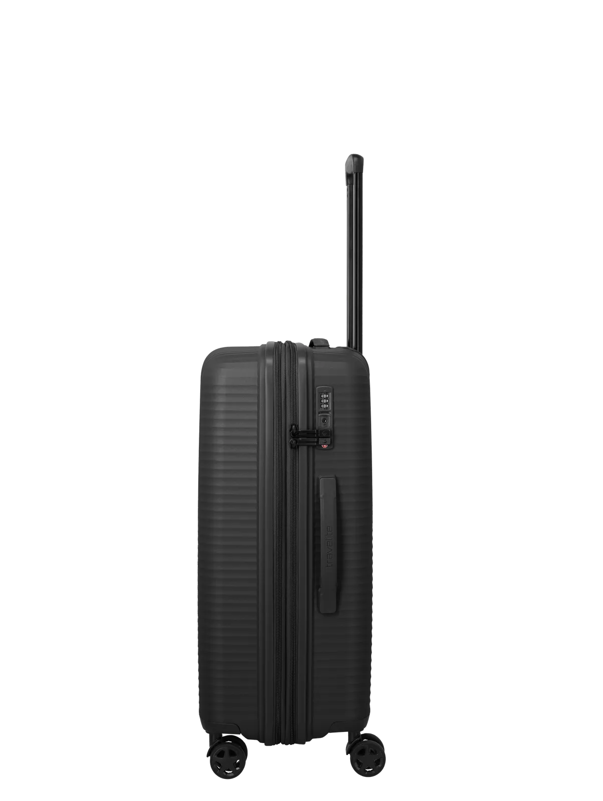 Travelite Air Stripe M är utrustad med ett infällt TSA-lås som gör resväskan anpassad för internationella flygresor. Fyra tysta dubbelhjul ger följsam och stabil rullning på olika underlag, medan det justerbara teleskophandtaget i lättmetall och det ergonomiska sidhandtaget bidrar till bekväm hantering i olika resesituationer.