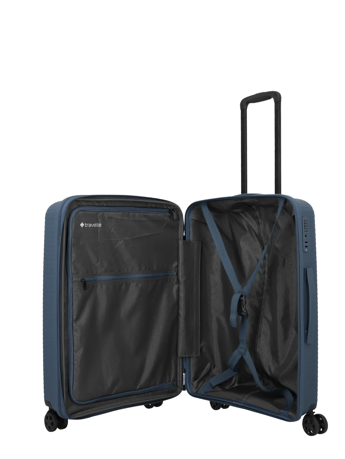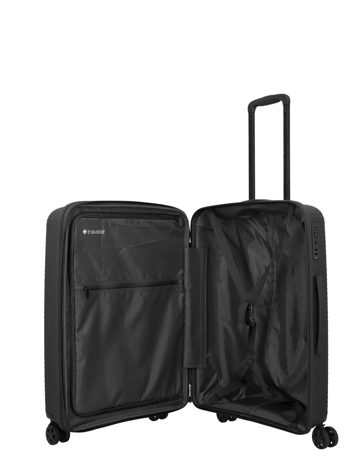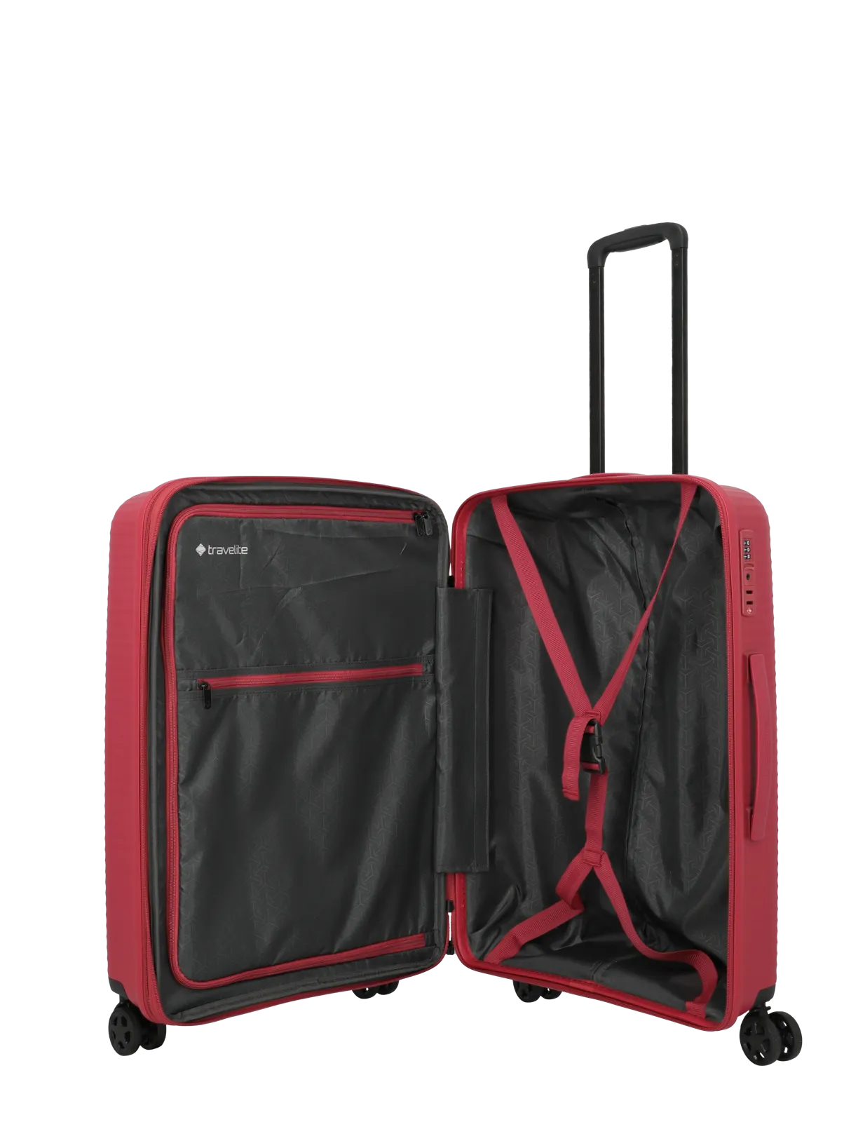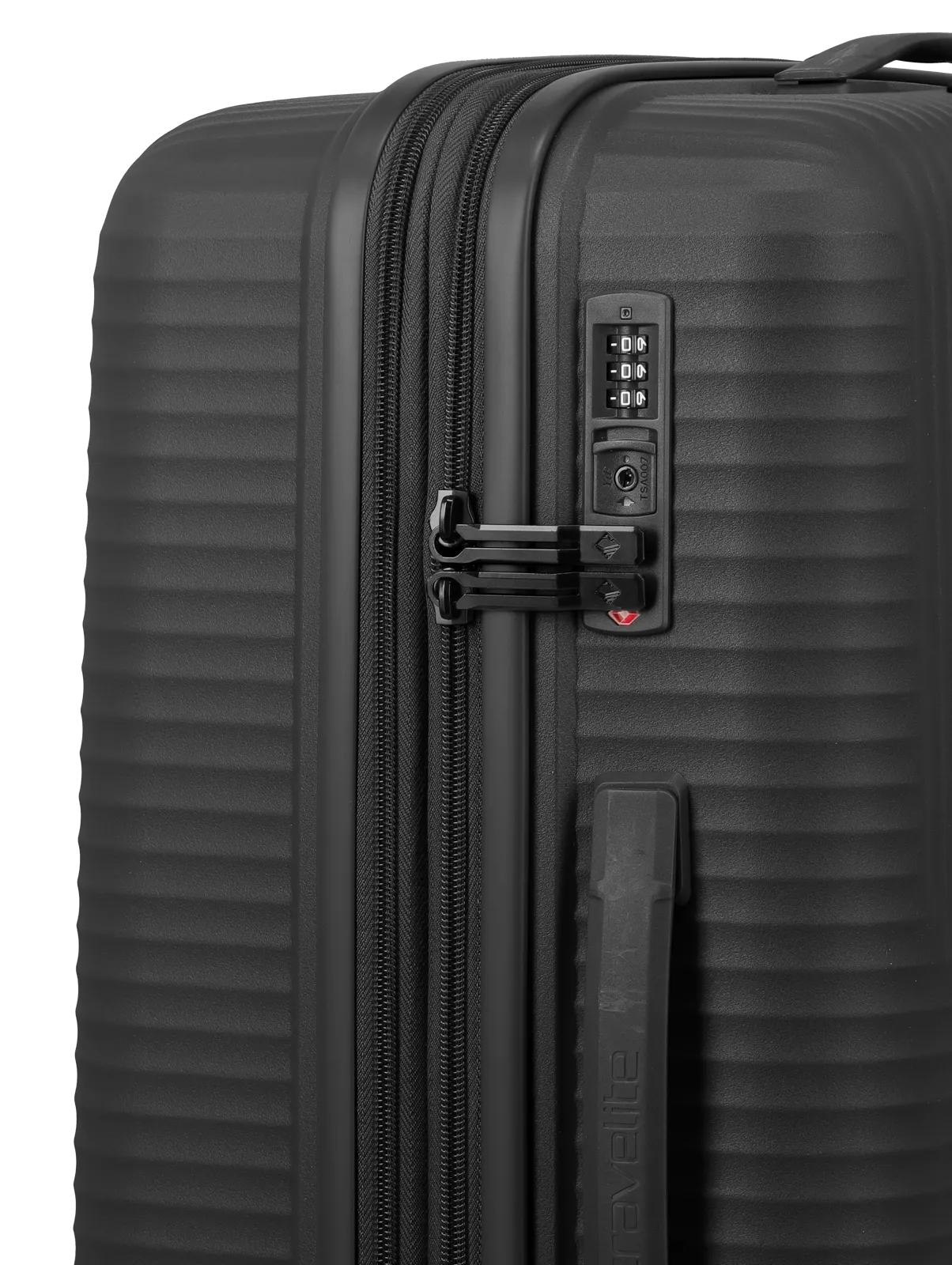 Travelite Air Stripe M är utrustad med ett infällt TSA-lås som gör resväskan anpassad för internationella flygresor. Fyra tysta dubbelhjul ger följsam och stabil rullning på olika underlag, medan det justerbara teleskophandtaget i lättmetall och det ergonomiska sidhandtaget bidrar till bekväm hantering i olika resesituationer.