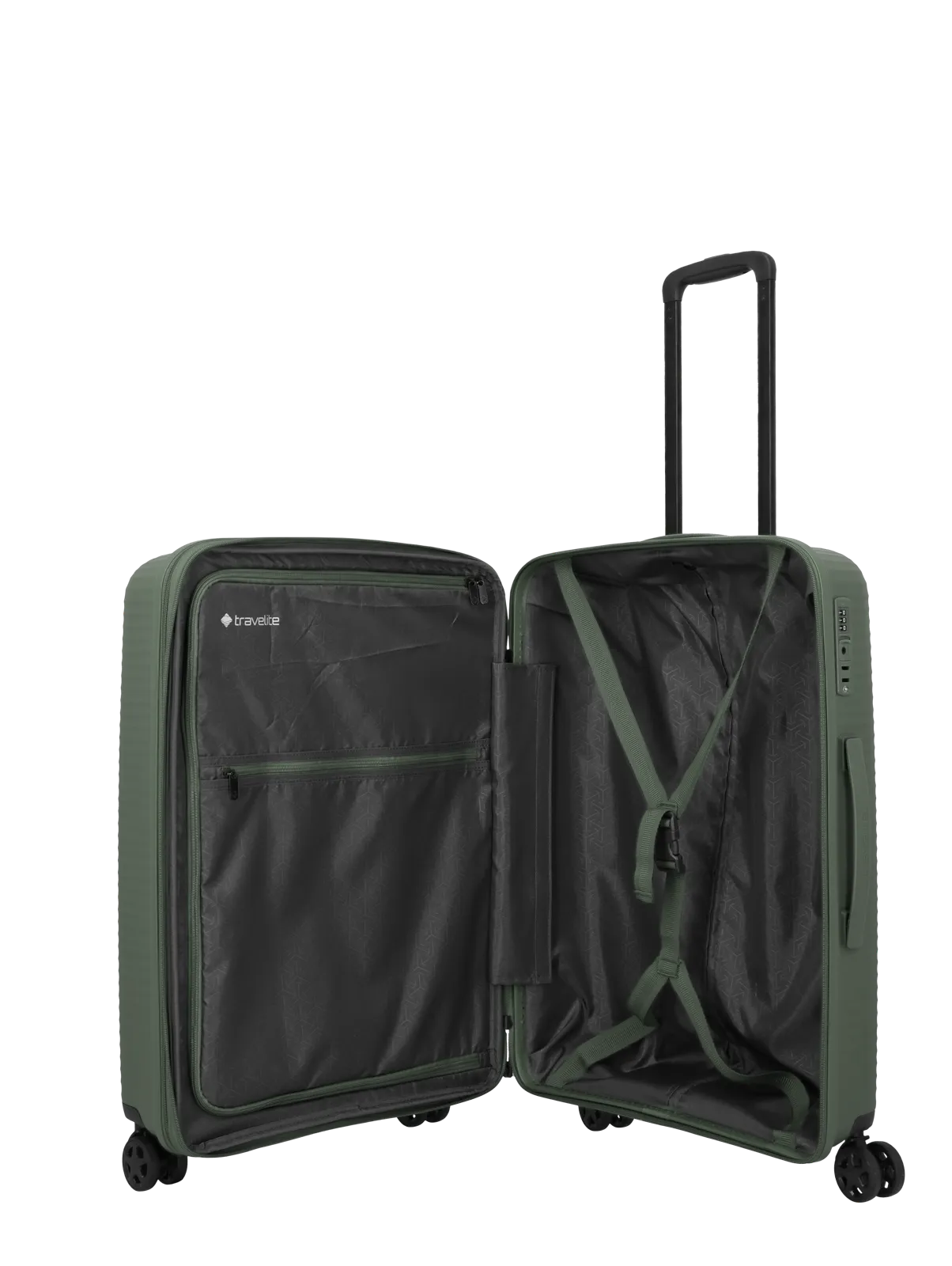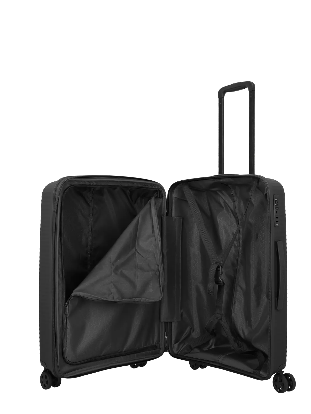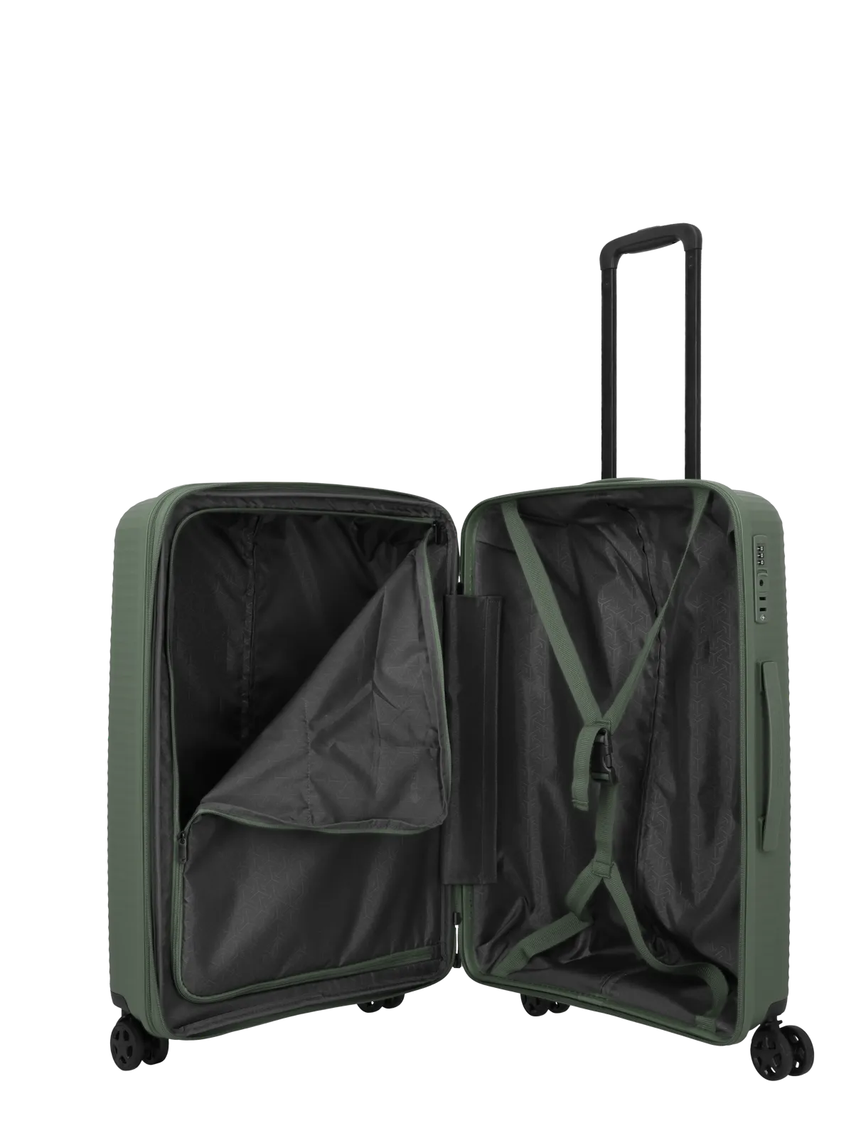 Interiören är utrustad med packväggar och justerbara packremmar som hjälper till att hålla innehållet säkert på plats under transport. Den separata tvättsektionen bidrar till bättre organisering genom att skilja olika typer av packning åt. Den genomtänkta uppdelningen ger god överblick och underlättar packning både vid avresa och hemresa.