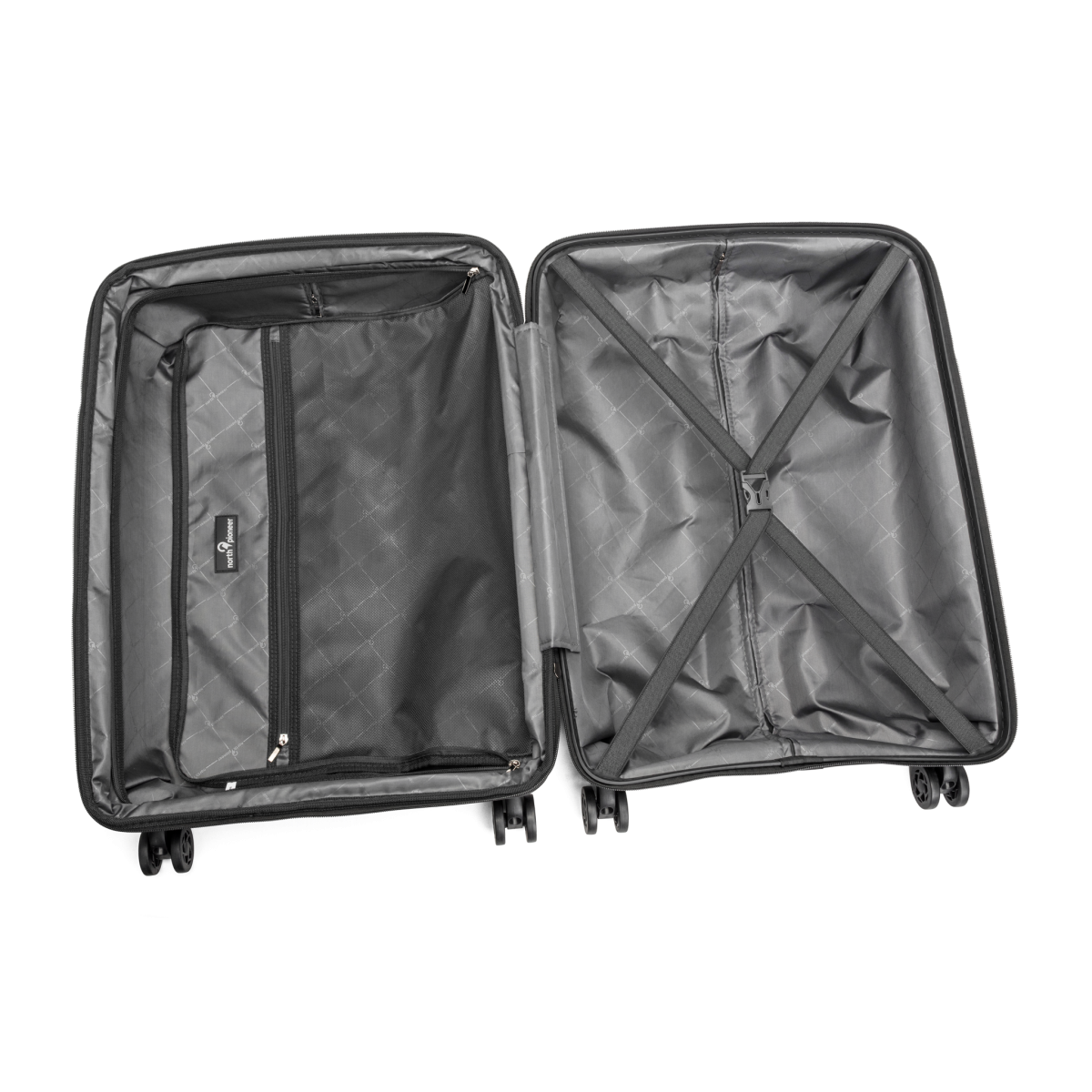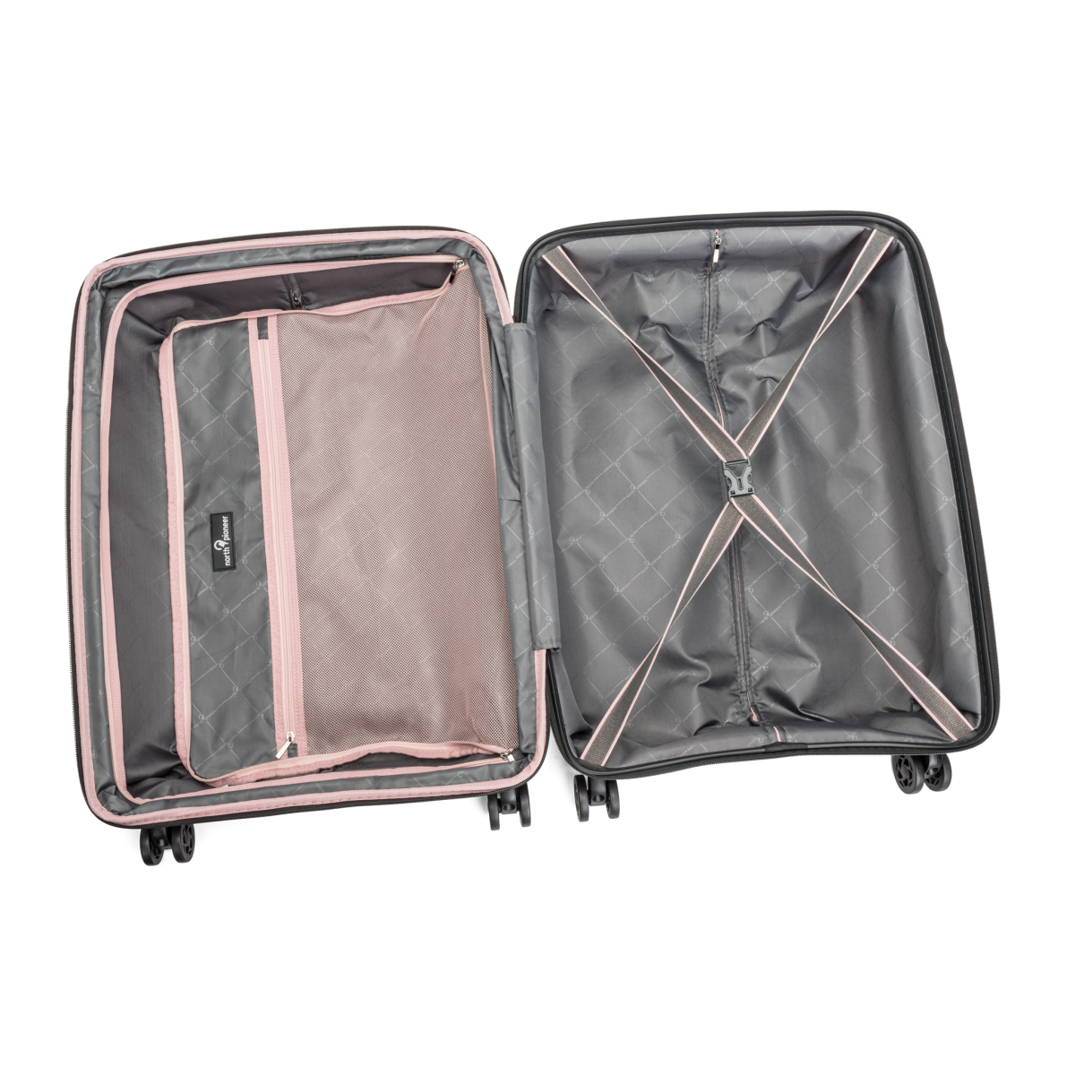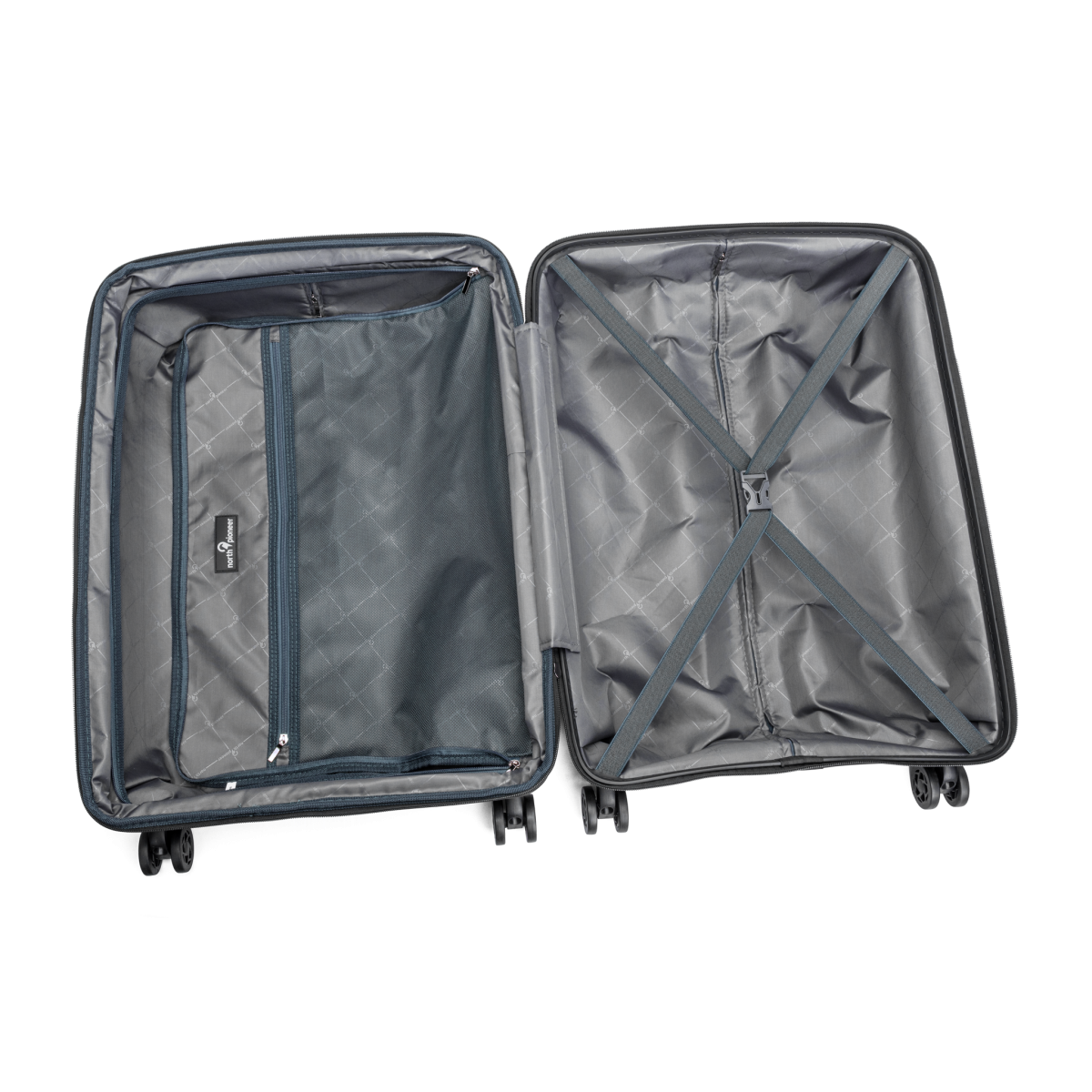 Med fyra tysta och stötdämpande hjul är resväskan enkel att manövrera, vilket minskar vibrationer under transport. Inuti väskan finns praktiska blixtlåsfickor och ett elastiskt kryssband som håller dina kläder på plats och underlättar en organiserad packning.