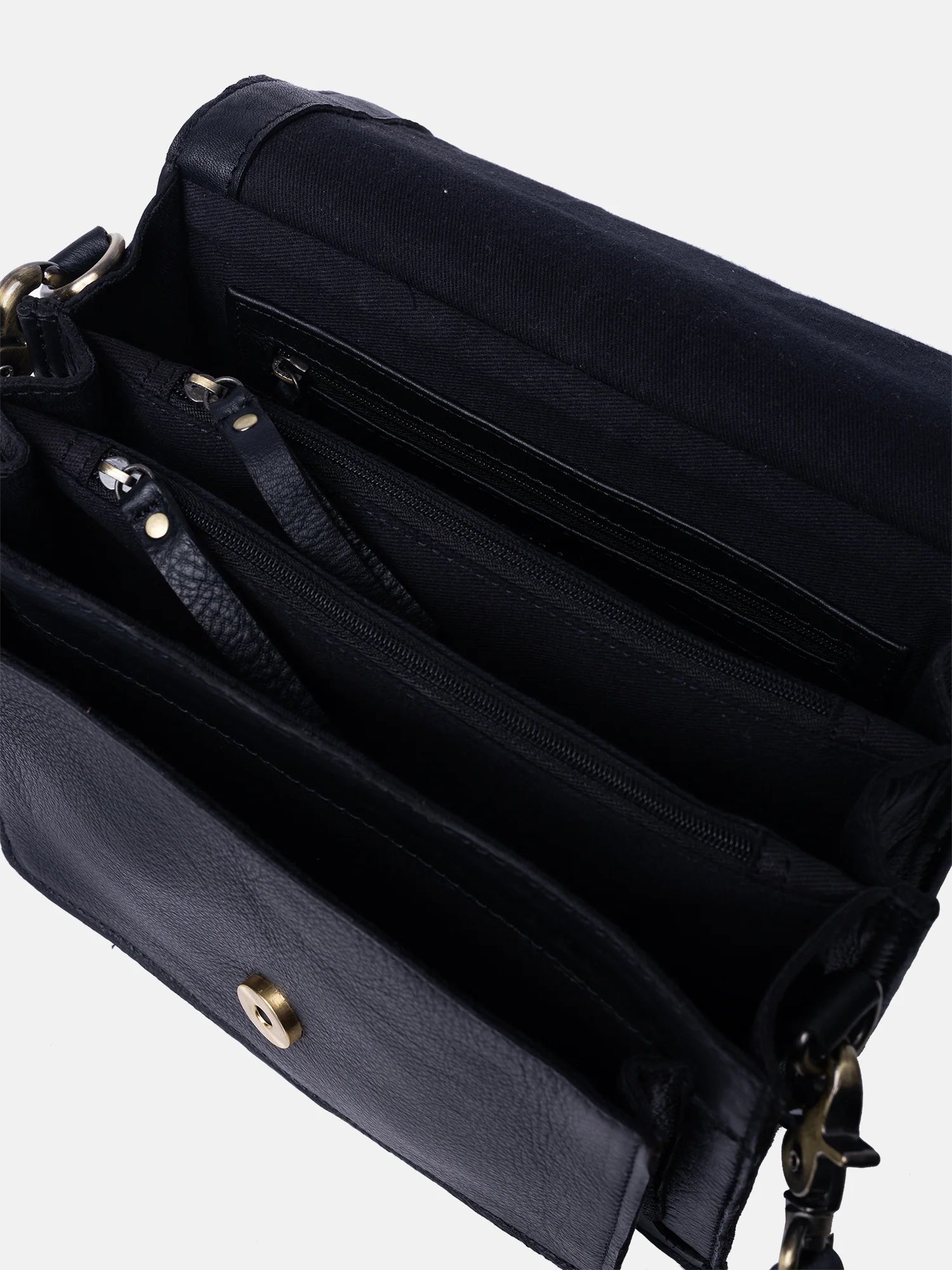 Väskan är utrustad med fyra öppna fack samt två sektioner med dragkedja, vilket ger goda möjligheter att organisera innehållet. Den strukturerade insidan gör det enkelt att hålla ordning på dina tillhörigheter. Stängningen med knapp och spänndetalj bidrar till både säkerhet och designmässig precision.