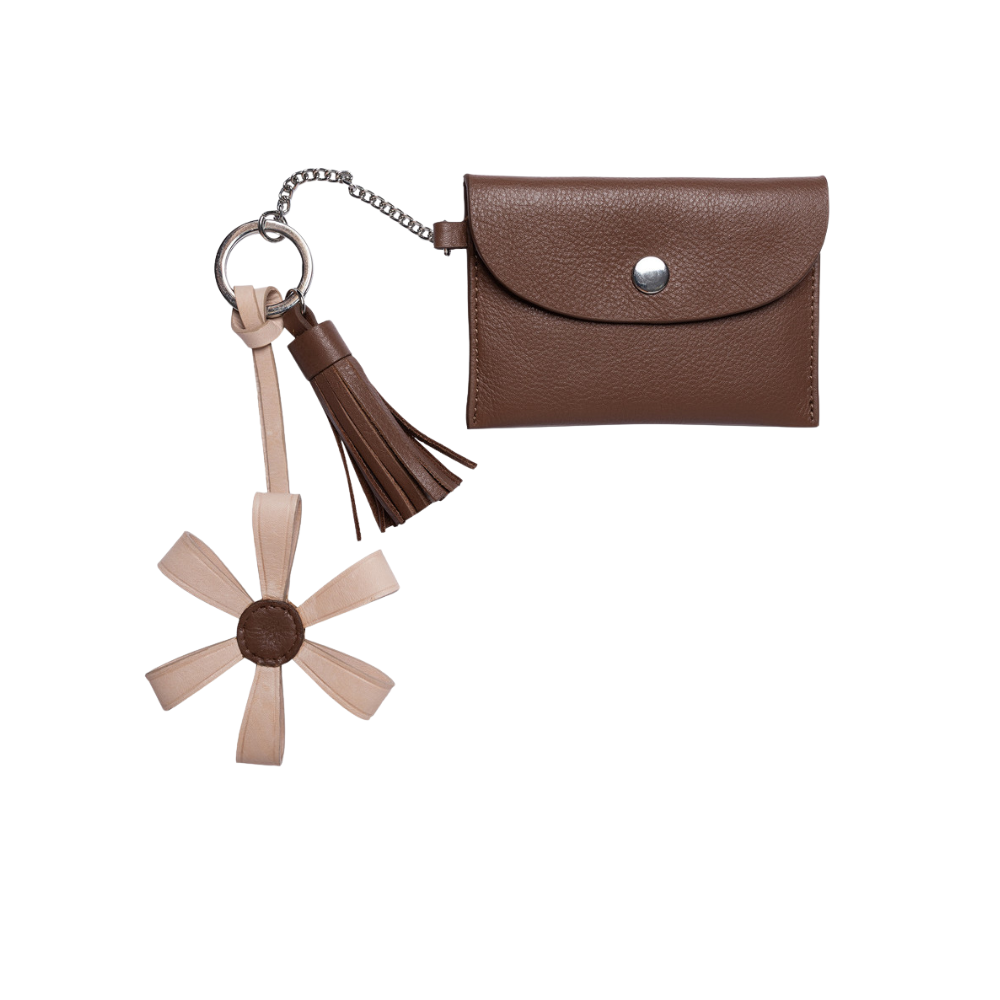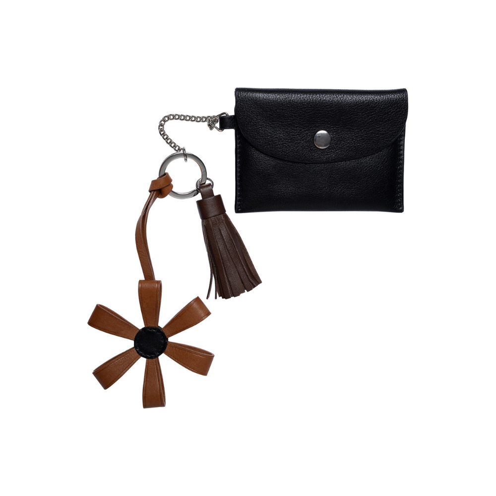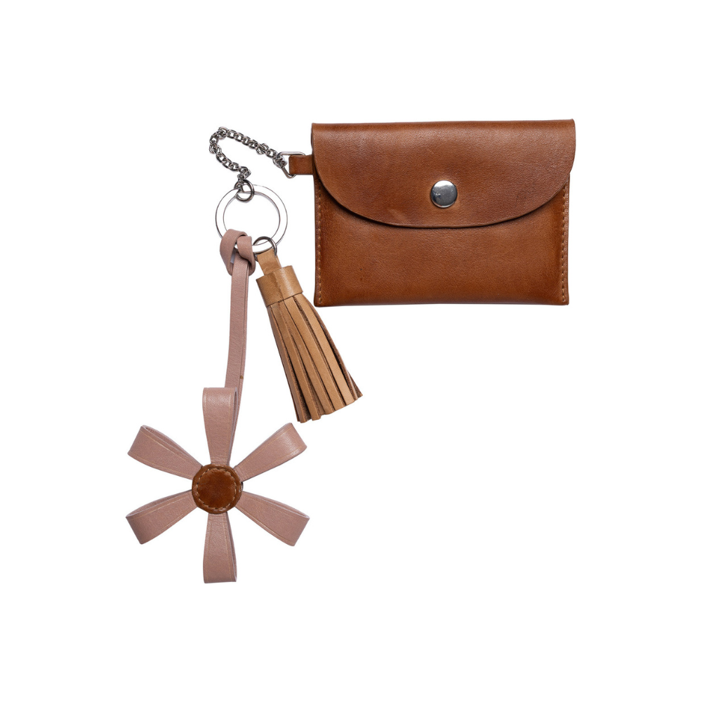 Designen pryds av en dekorativ tofs och en blomdetalj som ger nyckelringen ett personligt och feminint uttryck. Utöver detta finns en liten plånboksdel med tryckknappsstängning, vilket gör det möjligt att förvara mindre föremål på ett säkert sätt. Kombinationen av funktion och design gör RE:DESIGNED Nela till mer än bara en traditionell nyckelring.