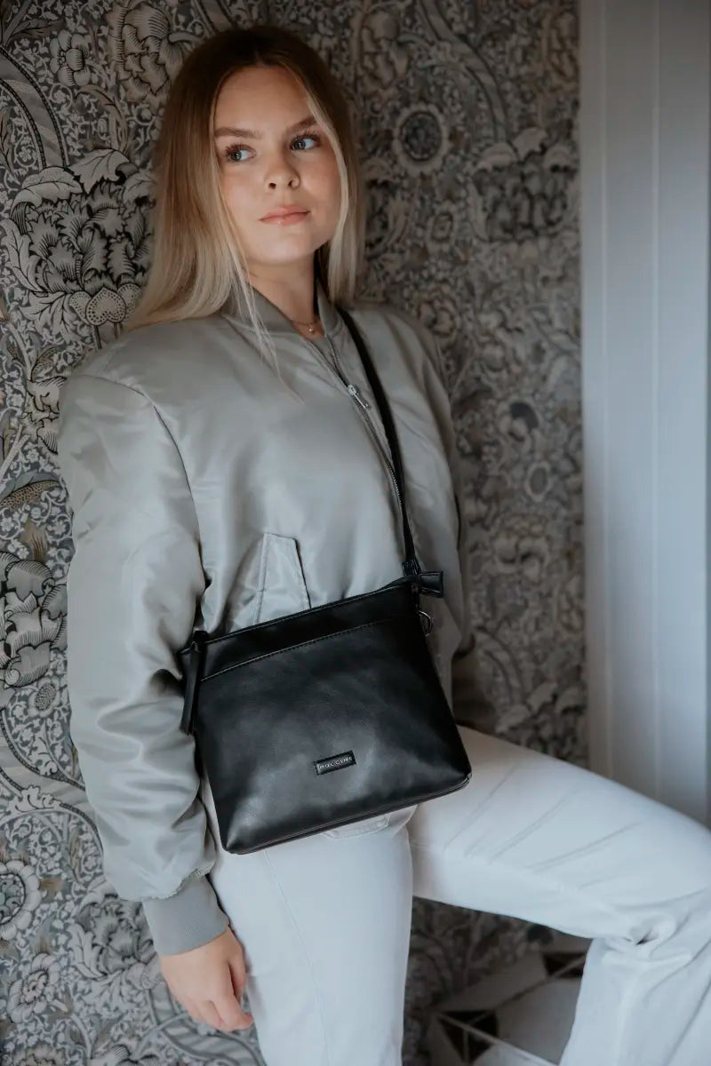 Puccini Melissa är en nätt och stilren axelväska i crossovermodell, tillverkad av mjuk och slät skinnimitation som ger en modern och elegant läderlook. Den avskalade formen gör modellen lätt att kombinera med både vardagskläder och mer dressade outfits. Den öppna fickan på framsidan med magnetlås ger väskan en subtil detalj som förstärker designen utan att ta över helhetsintrycket. De mörkgrå metalldetaljerna i gunmetal-finish kompletterar väskans minimalistiska framtoning och skapar ett harmoniskt uttryck.