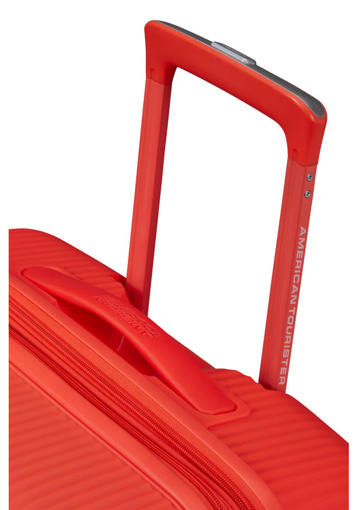 Soundbox är utrustad med ett justerbart teleskophandtag och bärhandtag på både ovansidan och sidan, vilket underlättar hanteringen. De fyra dubbelhjulen garanterar smidig manövrering, och det integrerade tresiffriga TSA-kodlåset ger extra säkerhet under resan.