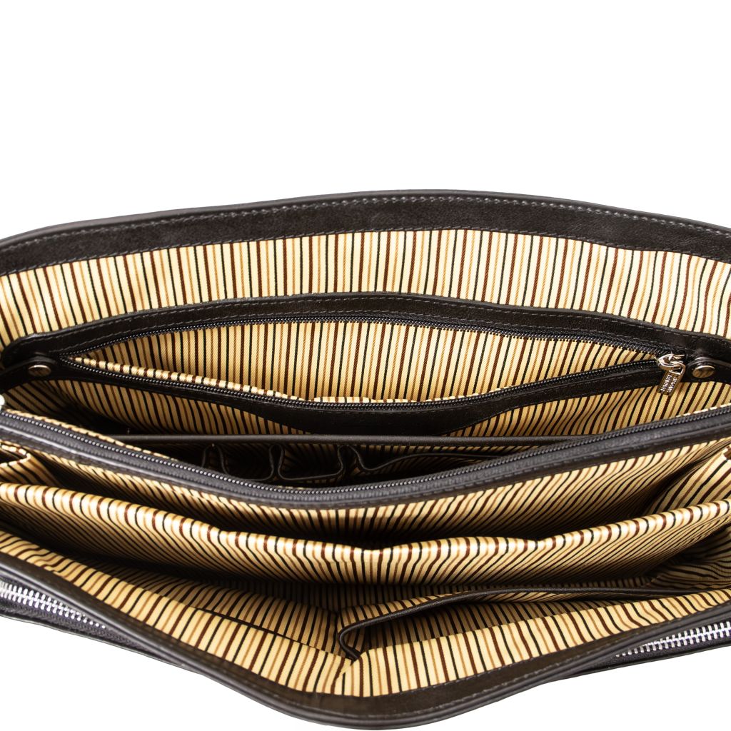 Insidan är fodrad med en kombination av bomull och svinläder, vilket skapar en elegant och hållbar miljö för förvaring. Väskan är uppdelad i fyra fack som ger gott om utrymme för dokument, mappar och personliga tillhörigheter. Här finns dessutom en invändig laptopficka samt ett centralt laptopfack med stötdämpande funktion för extra skydd. Ytterligare funktioner inkluderar en dragkedjeficka, två öppna fickor samt en praktisk pennhållare som underlättar organisering i vardagen.