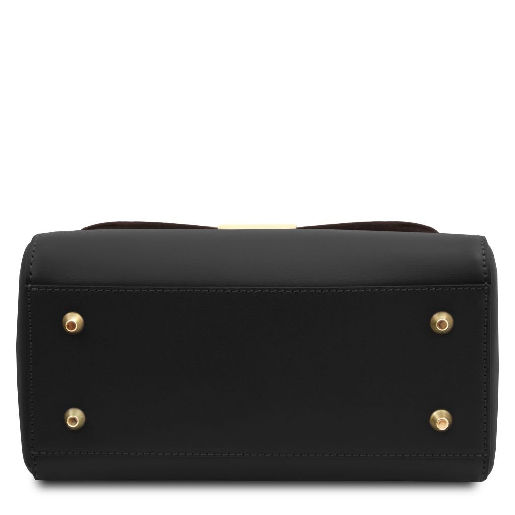 Armonia är utrustad med en avtagbar och justerbar axelrem i läder som ger flexibilitet i bärandet. Väskan kan användas som klassisk handväska eller bäras över axeln för extra bekvämlighet. Stängningen sker med ett metallvridlås som pryds av en graverad Tuscany Leather-logotyp, vilket ger en både säker och dekorativ detalj.