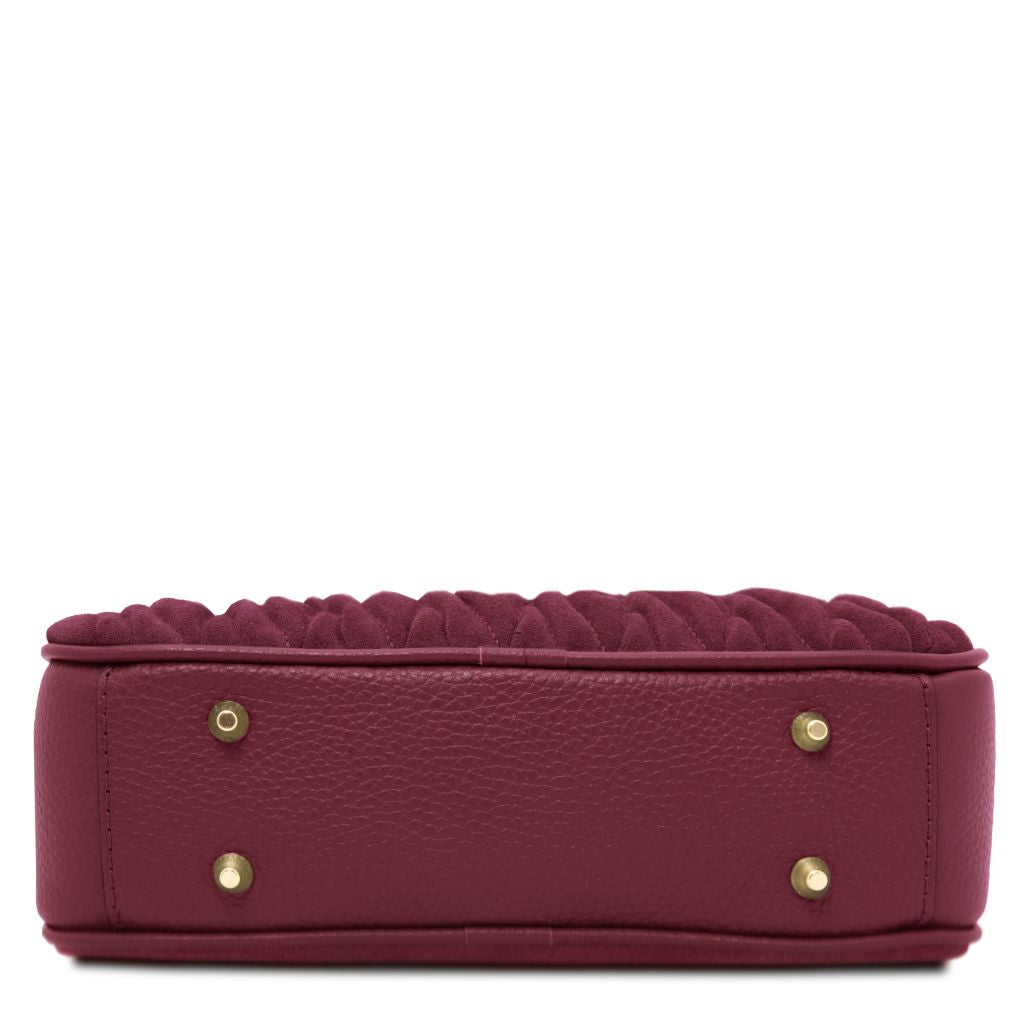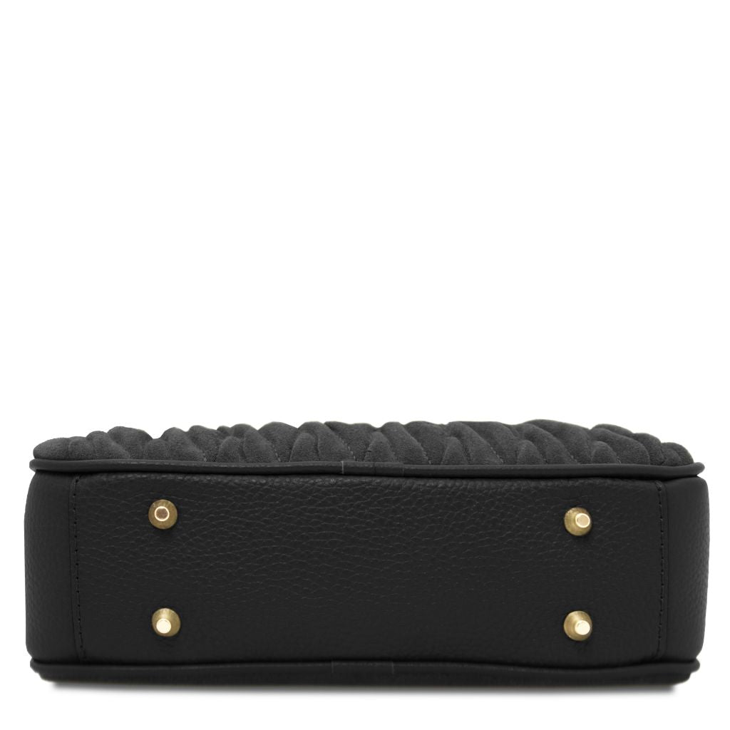 Tuscany Leather Chantilly är en sofistikerad handväska i en kombination av pebbled leather och mocka. Den halvstyva strukturen ger väskan en elegant form som håller sig över tid, medan de skyddande metallfötterna på botten både bidrar till hållbarhet och förhöjer den exklusiva känslan. Den diskreta TL-logotypen i metall och den guldfärgade hårdvaran förstärker väskans stilrena uttryck.