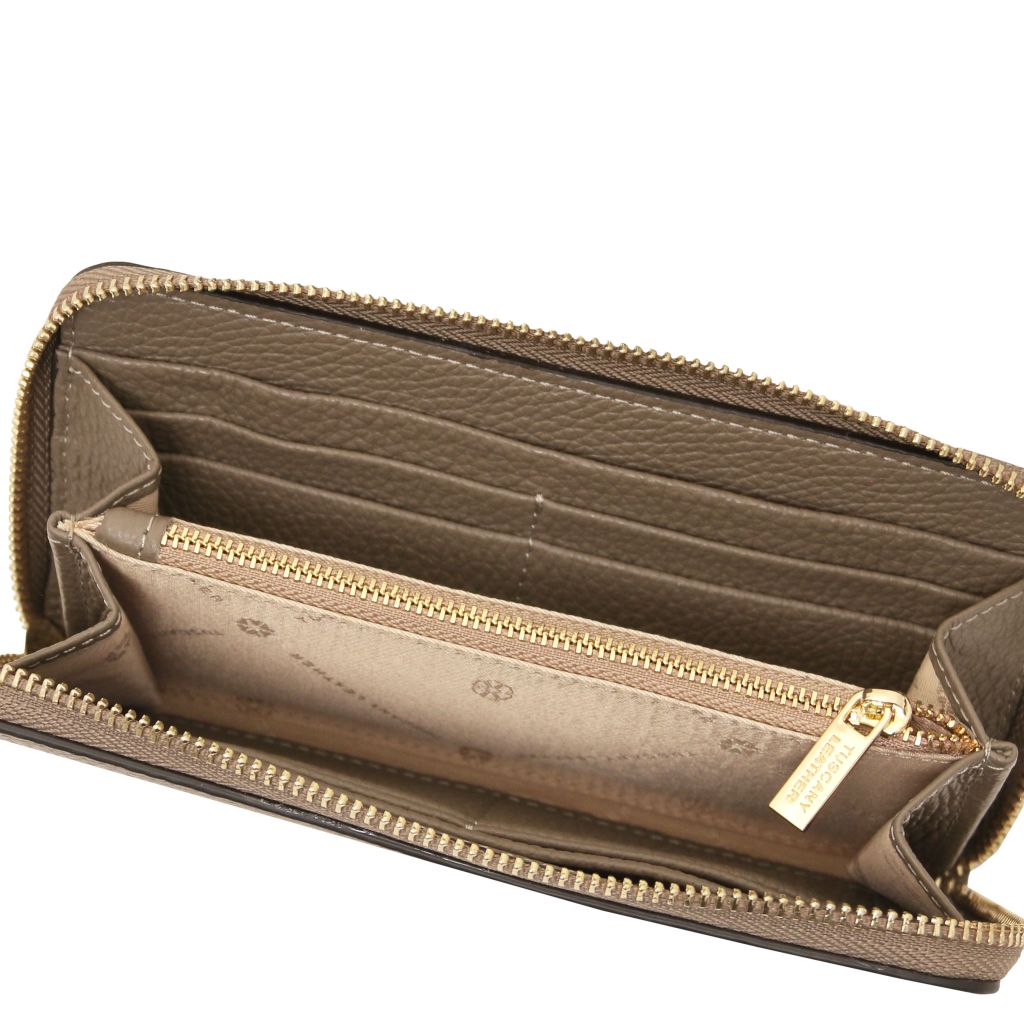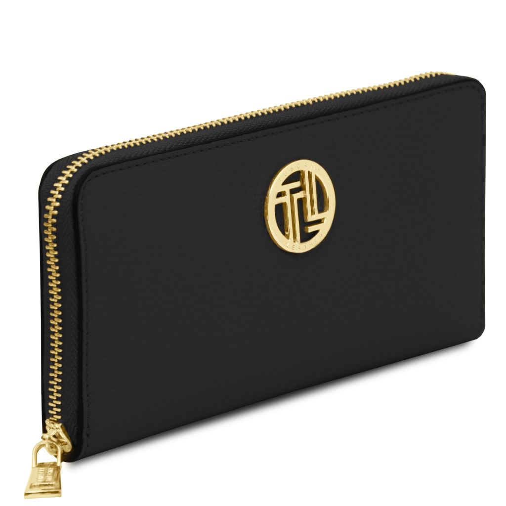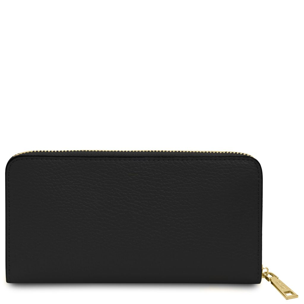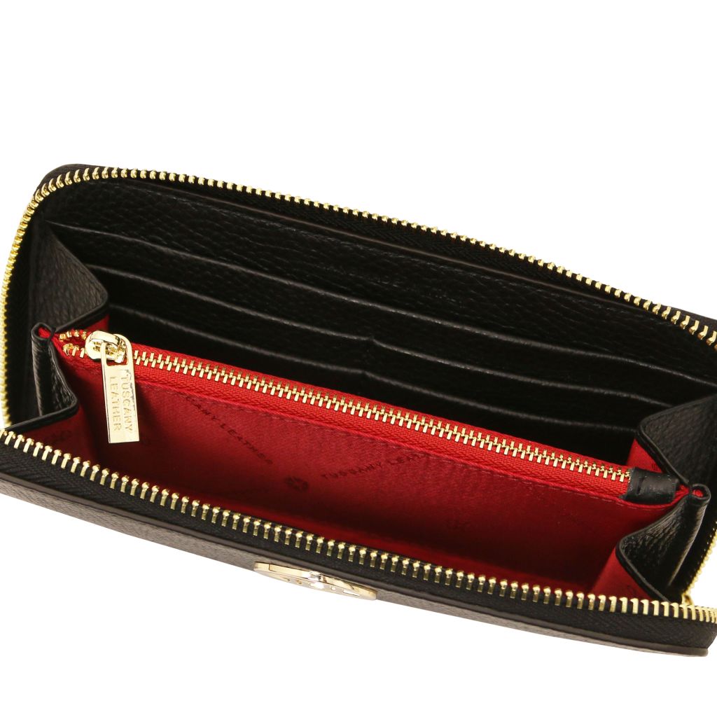 Stängningen sker med en dragkedja som löper runt tre sidor för säker förvaring och smidig åtkomst. Insidan är fodrad med slitstark polyester, och varje plånbok levereras i en raffinerad TL-box. En tidlös modell som passar lika bra till vardag som till fest.