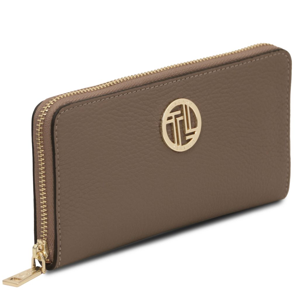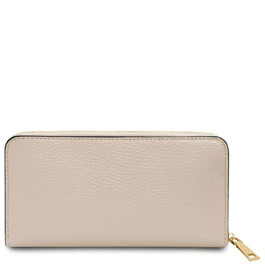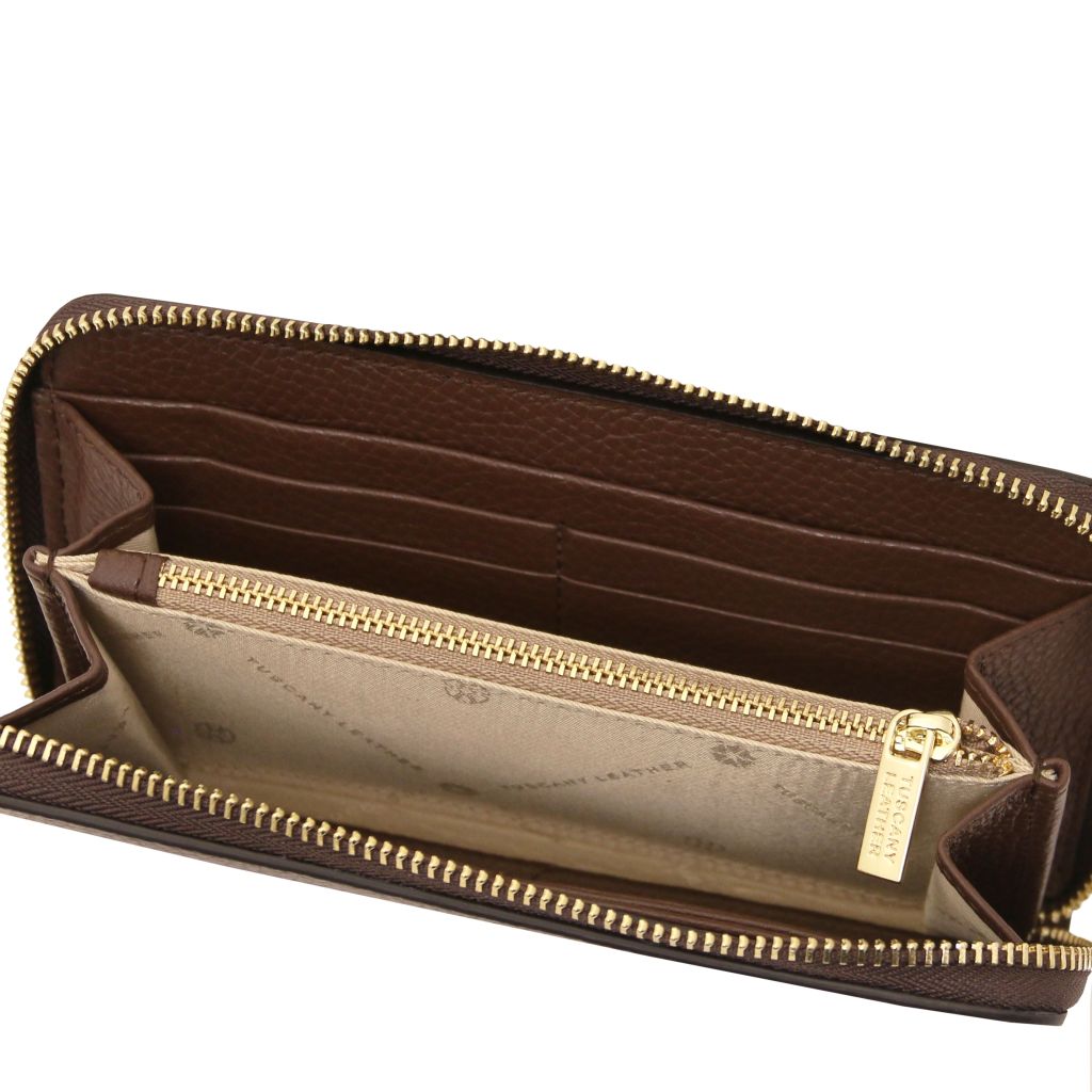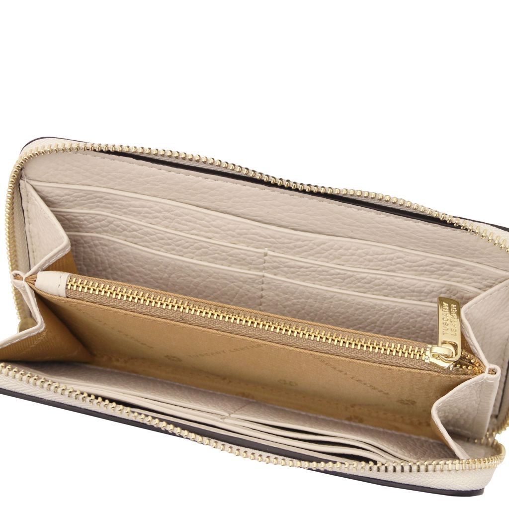 Stängningen sker med en dragkedja som löper runt tre sidor för säker förvaring och smidig åtkomst. Insidan är fodrad med slitstark polyester, och varje plånbok levereras i en raffinerad TL-box. En tidlös modell som passar lika bra till vardag som till fest.