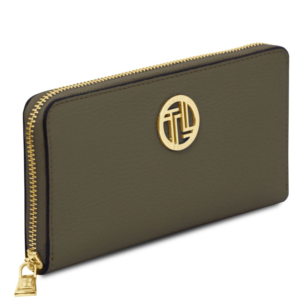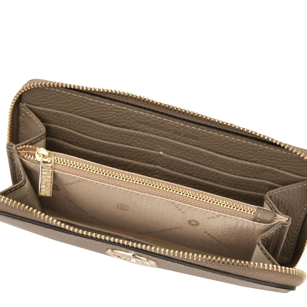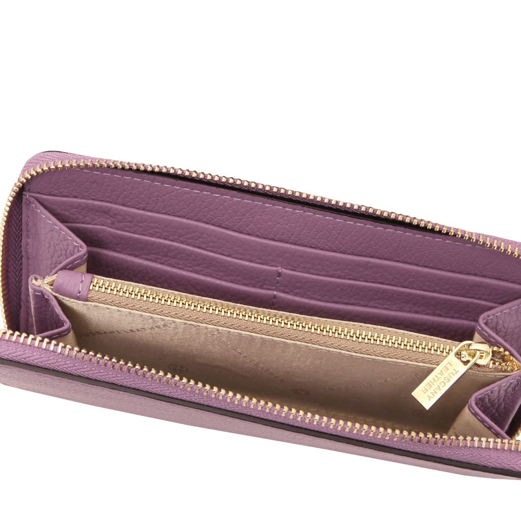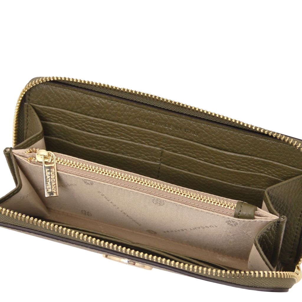 Stängningen sker med en dragkedja som löper runt tre sidor för säker förvaring och smidig åtkomst. Insidan är fodrad med slitstark polyester, och varje plånbok levereras i en raffinerad TL-box. En tidlös modell som passar lika bra till vardag som till fest.