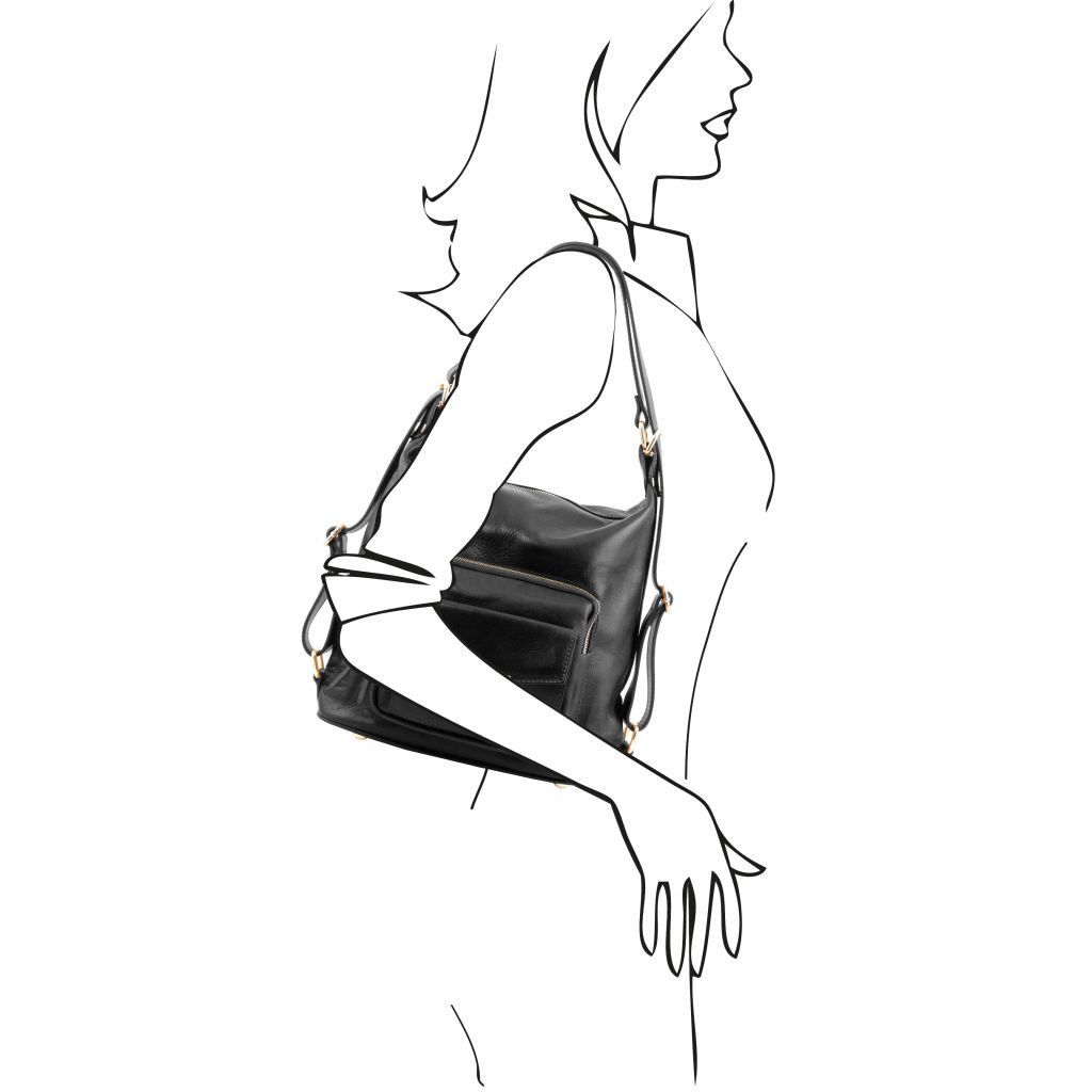 Väskan har justerbara axelremmar i läder som gör att den enkelt kan bäras som ryggsäck eller axelväska beroende på behov. Den stängs med dragkedja och har en frontficka samt en säker ficka på baksidan, vilket ger extra utrymme för saker du vill ha lättillgängliga. Tack vare sin flexibla konstruktion fungerar modellen lika bra för pendling som för fritid.