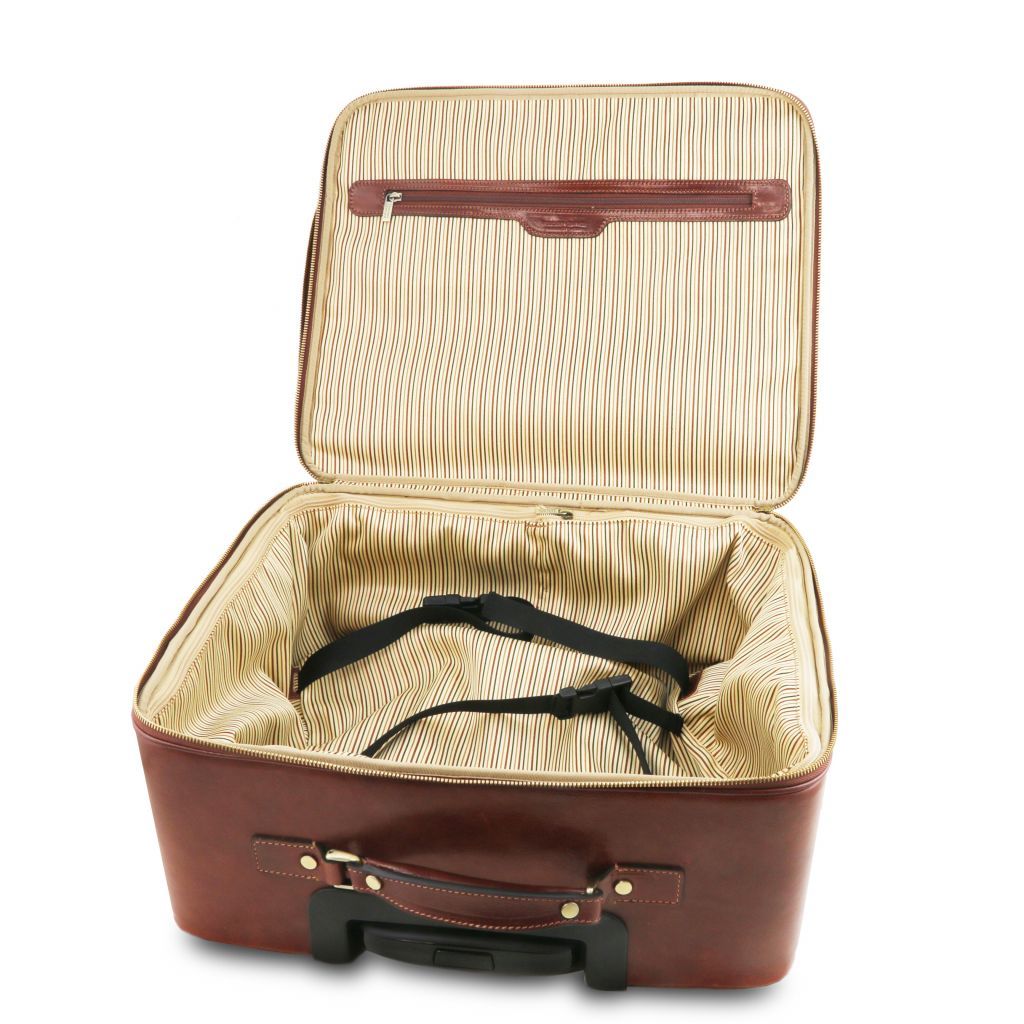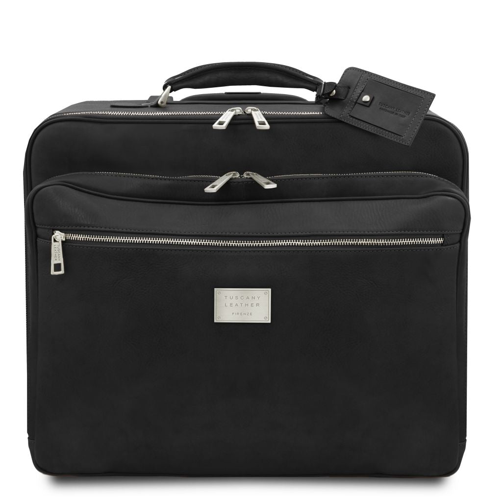 Tuscany Leather Varsavia är en exklusiv pilotväska i matt full grain vegetabilgarvat läder, handfärgat för att framhäva materialets naturliga skönhet. Den robusta och stabila strukturen gör att väskan behåller sin form även vid tung packning. På framsidan finns två fickor med stängning och på baksidan en praktisk ficka med dragkedja. Väskan är utrustad med ett diskret metallogo på framsidan och hårdvara i borstad mässing och silverton, vilket understryker den eleganta designen.
