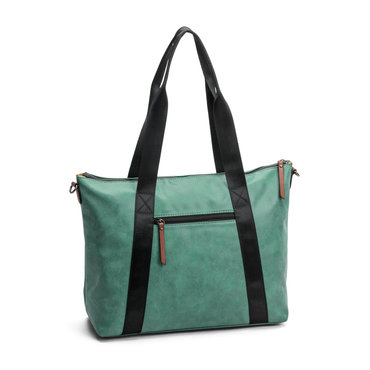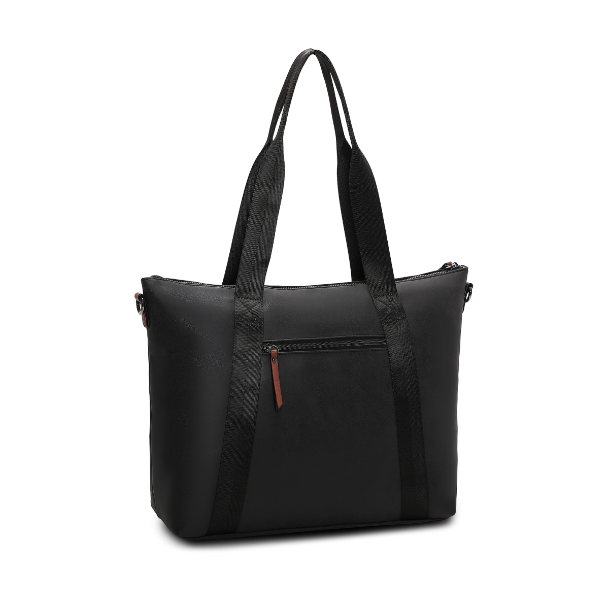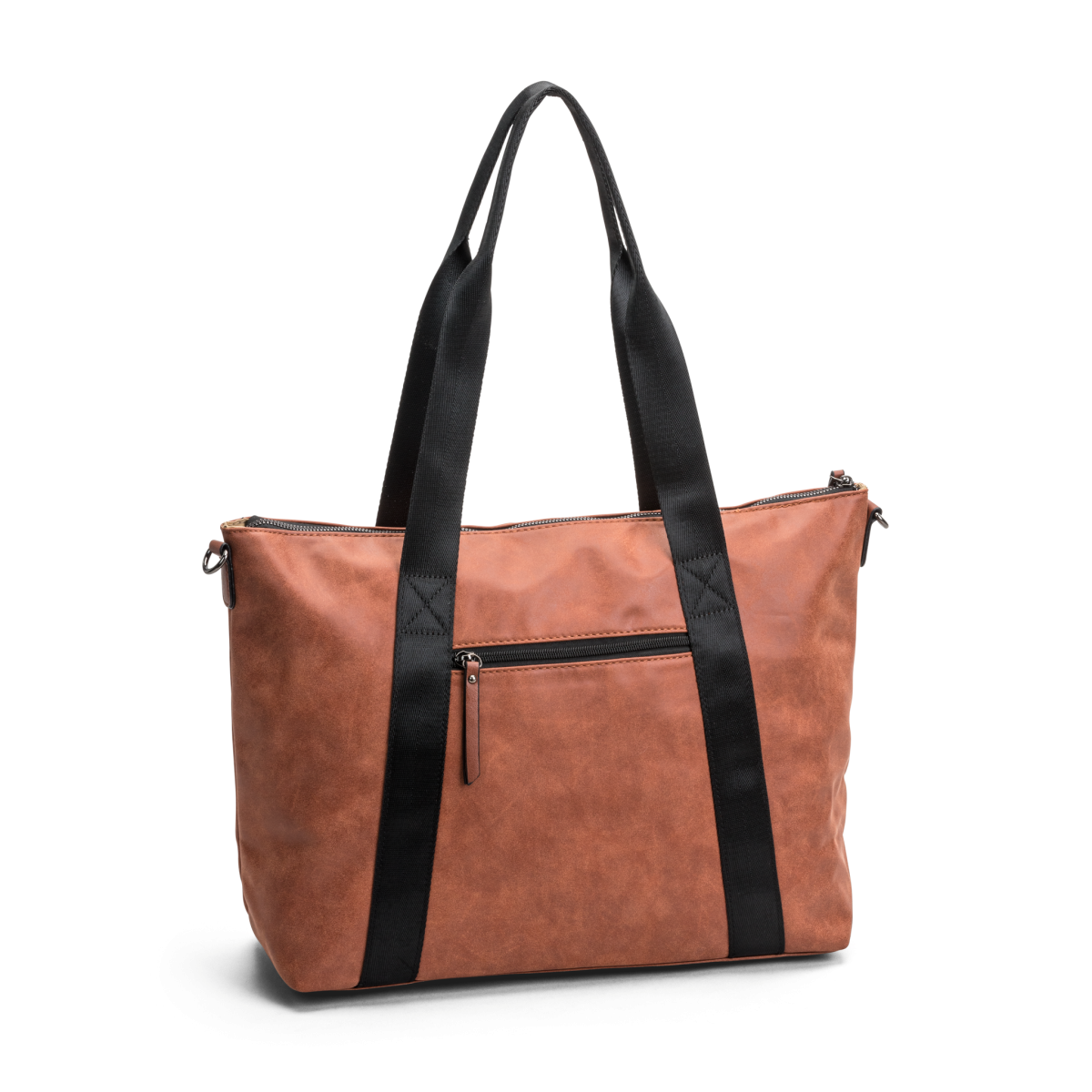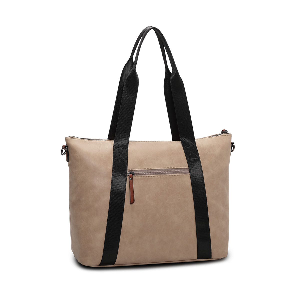 Denna tote-väska erbjuder ett generöst inre utrymme med tre praktiska sidofack, varav ett är utrustat med dragkedja för extra säkerhet. På baksidan finns ett blixtlåsförsett ytterfack, vilket ger enkel åtkomst till viktiga småsaker som nycklar och mobil. Med en avtagbar och justerbar axelrem kan väskan bäras både över axeln och som crossbody, vilket ger flexibel bärkomfort.