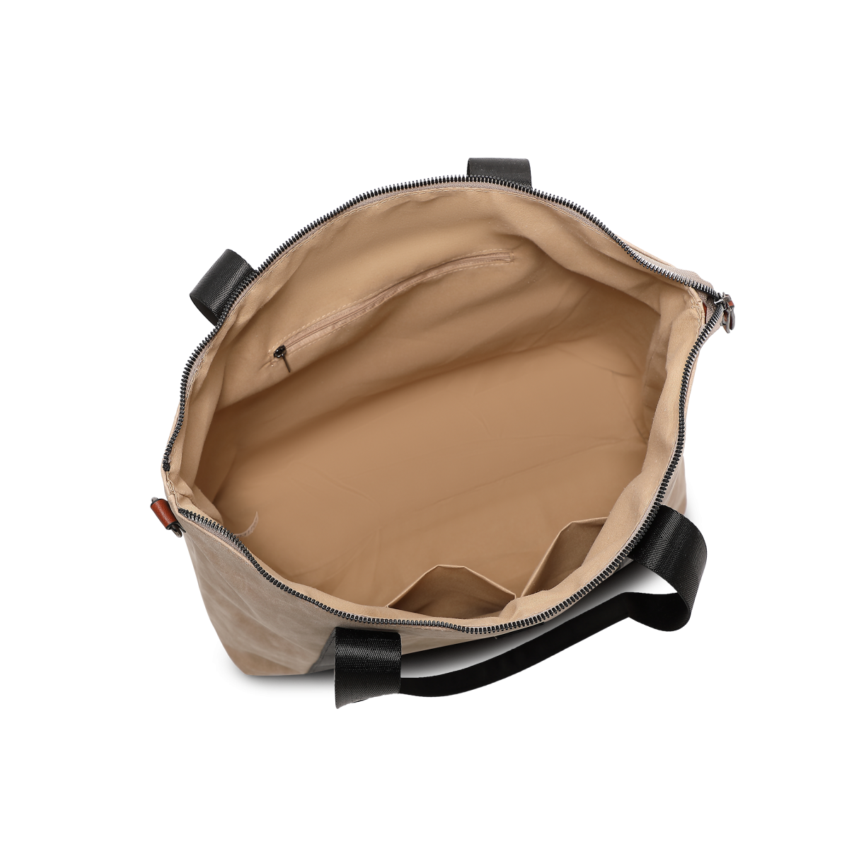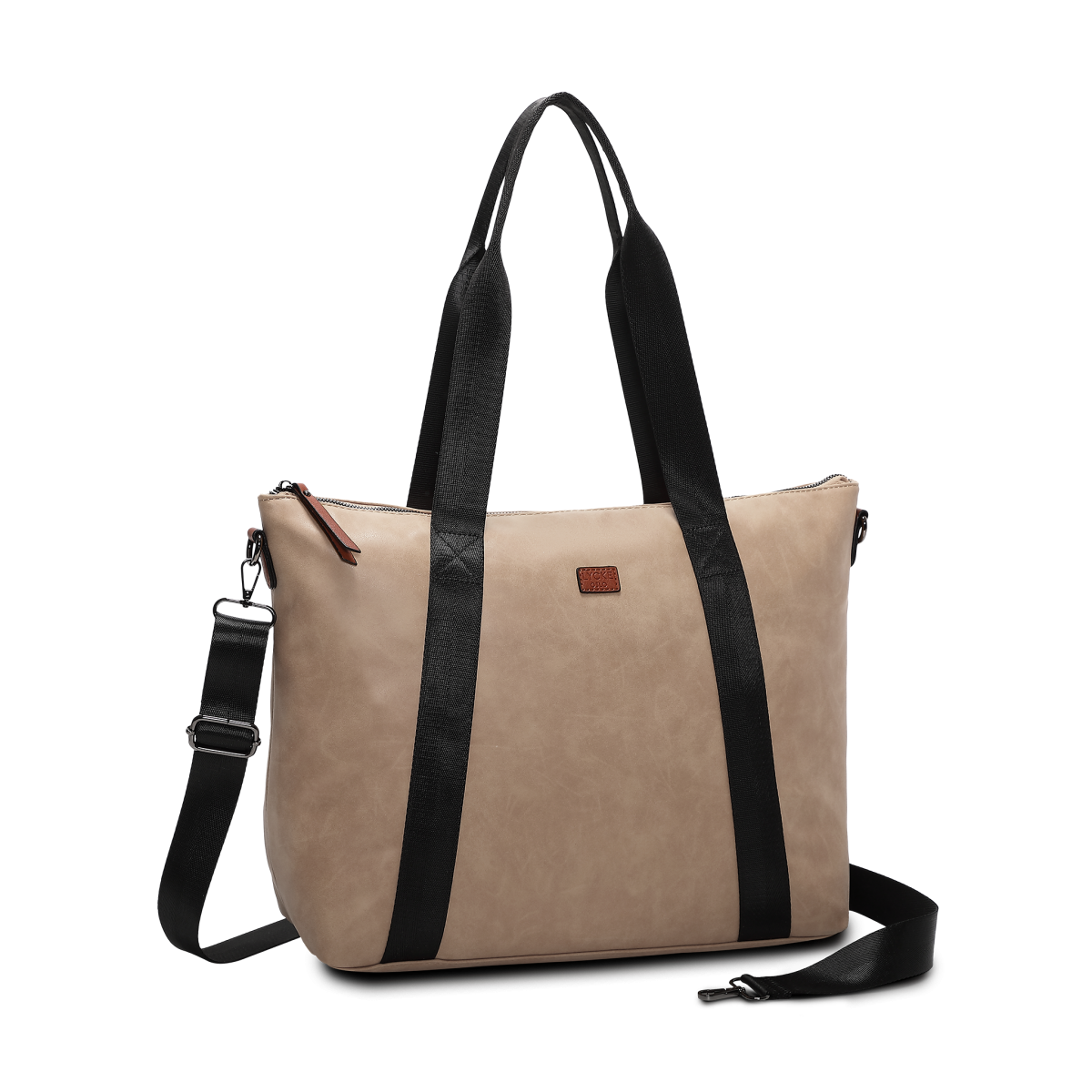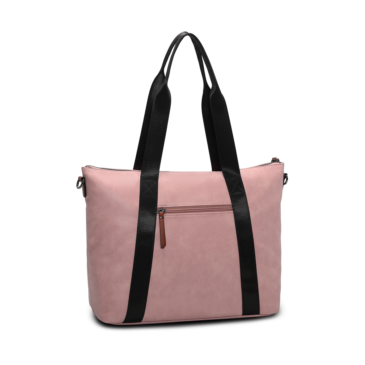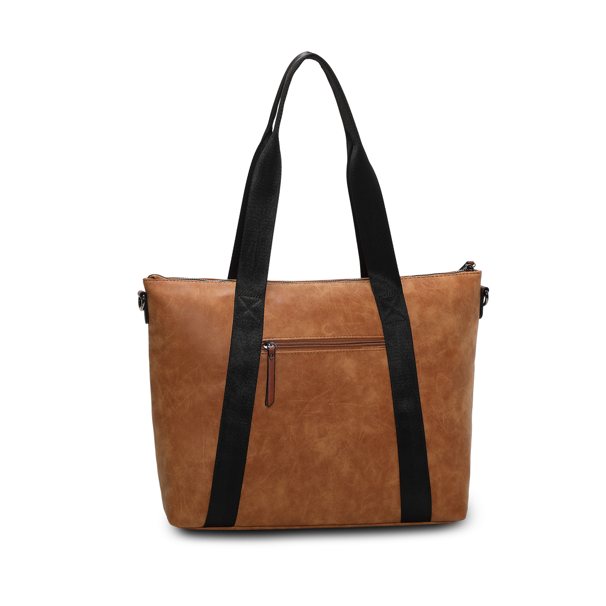 Denna tote-väska erbjuder ett generöst inre utrymme med tre praktiska sidofack, varav ett är utrustat med dragkedja för extra säkerhet. På baksidan finns ett blixtlåsförsett ytterfack, vilket ger enkel åtkomst till viktiga småsaker som nycklar och mobil. Med en avtagbar och justerbar axelrem kan väskan bäras både över axeln och som crossbody, vilket ger flexibel bärkomfort.