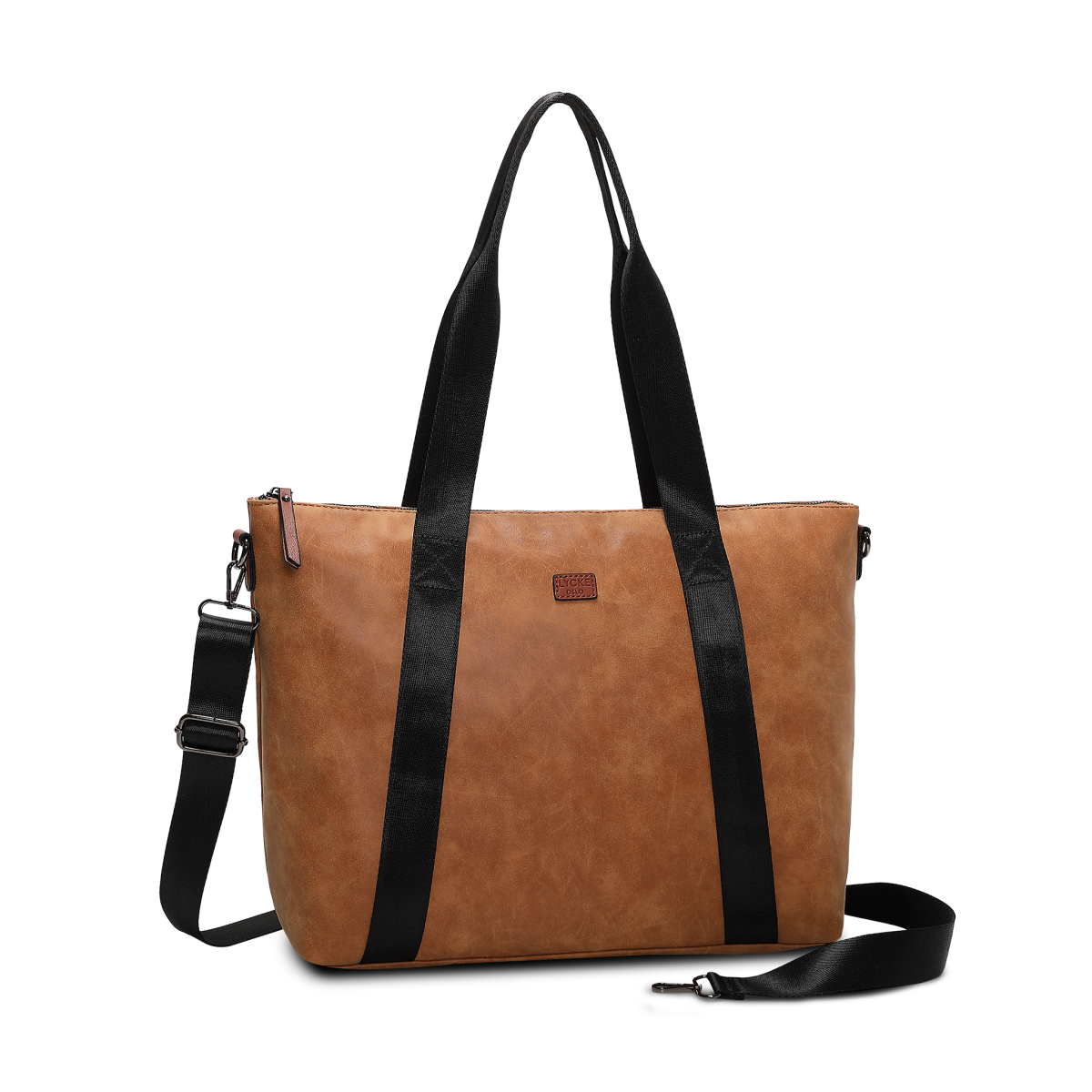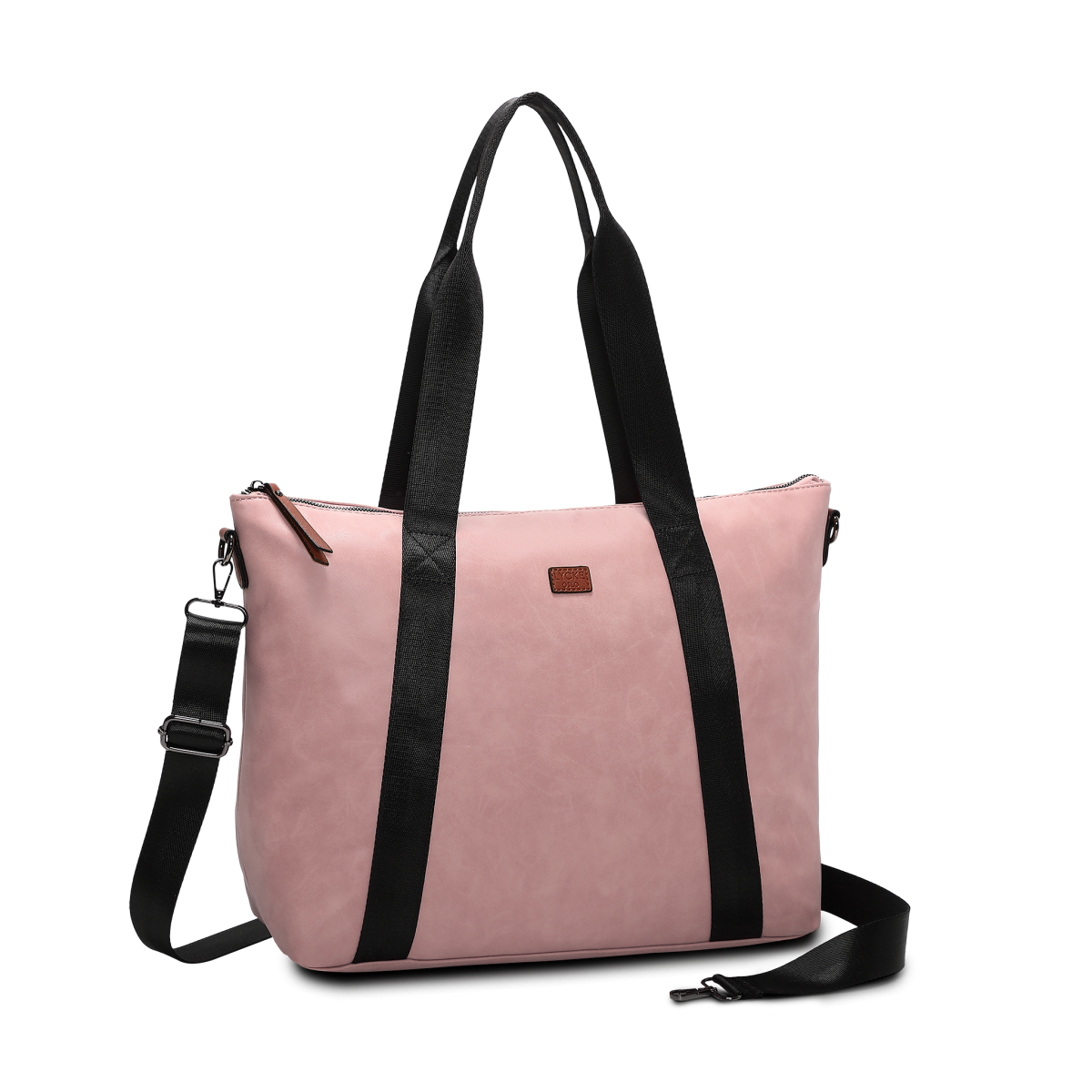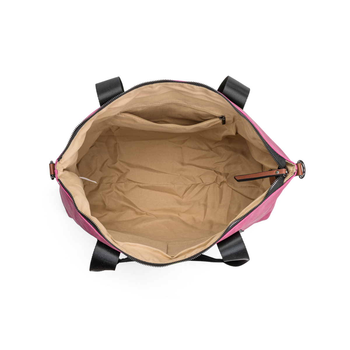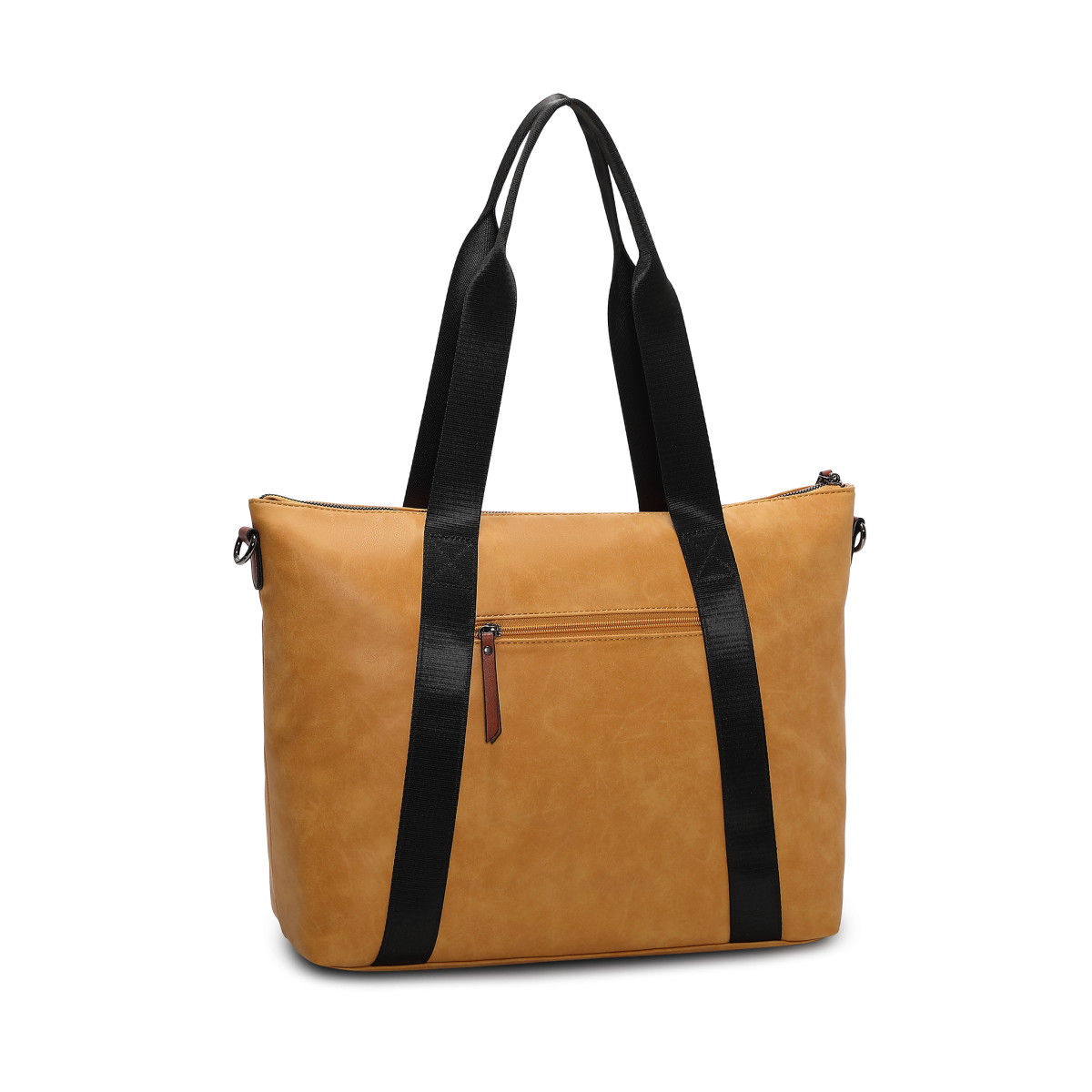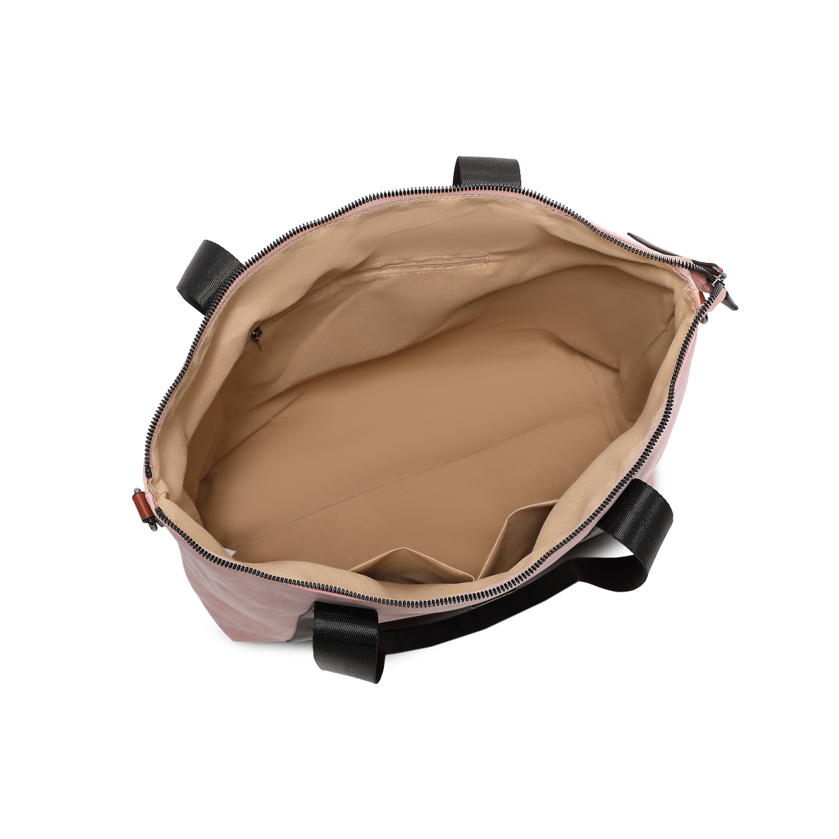 Denna tote-väska erbjuder ett generöst inre utrymme med tre praktiska sidofack, varav ett är utrustat med dragkedja för extra säkerhet. På baksidan finns ett blixtlåsförsett ytterfack, vilket ger enkel åtkomst till viktiga småsaker som nycklar och mobil. Med en avtagbar och justerbar axelrem kan väskan bäras både över axeln och som crossbody, vilket ger flexibel bärkomfort.