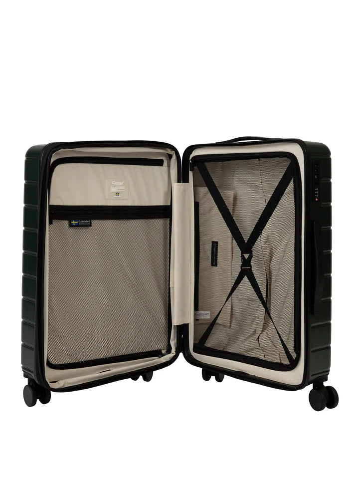 Invändigt är Cavalet Brantevik helfodrad och utrustad med praktiska packband som håller kläder och tillhörigheter på plats. Den smarta avdelaren gör packningen enkel och överskådlig och hjälper till att separera olika typer av innehåll. Den justerbara volymen ger extra flexibilitet vid packning och gör väskan anpassningsbar efter resans längd. Med sin genomtänkta interiör, generösa packutrymme och 10 års fabrikationsgaranti är denna mellanstora resväska ett funktionellt och hållbart val för frekventa resenärer.