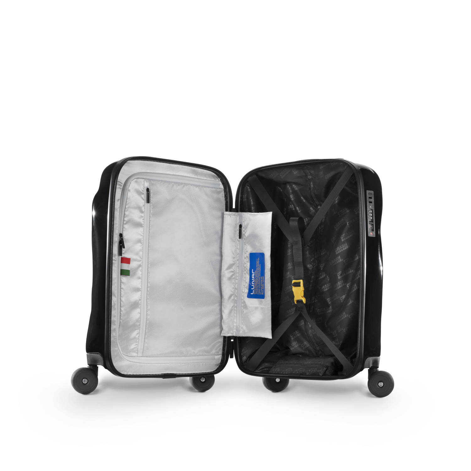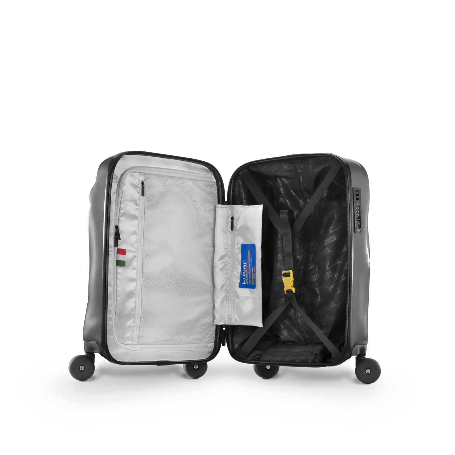 Invändigt erbjuder Lunar-kollektionen ett silverfärgat foder med flera smarta fickor och flexibla utrymmen. Detta gör det enkelt att organisera dina tillhörigheter, oavsett om du packar för en formell tillställning eller en avslappnad semester. Denna kabinväska är perfekt för alla typer av resor.