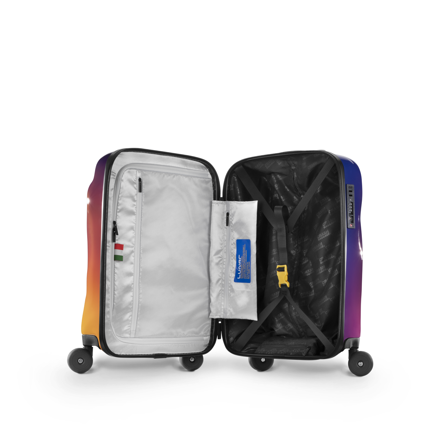 Lunar behåller det ikoniska buckliga polykarbonatskalet som Crash Baggage är kända för. Den nya kollektionen finns i fem färger inspirerade av månlandskap: Sunset, Galaxy, Orion, Infinity Black och Silver Moon. Varje färg har stämningsfulla gradienteffekter som gör varje väska unik och iögonfallande.