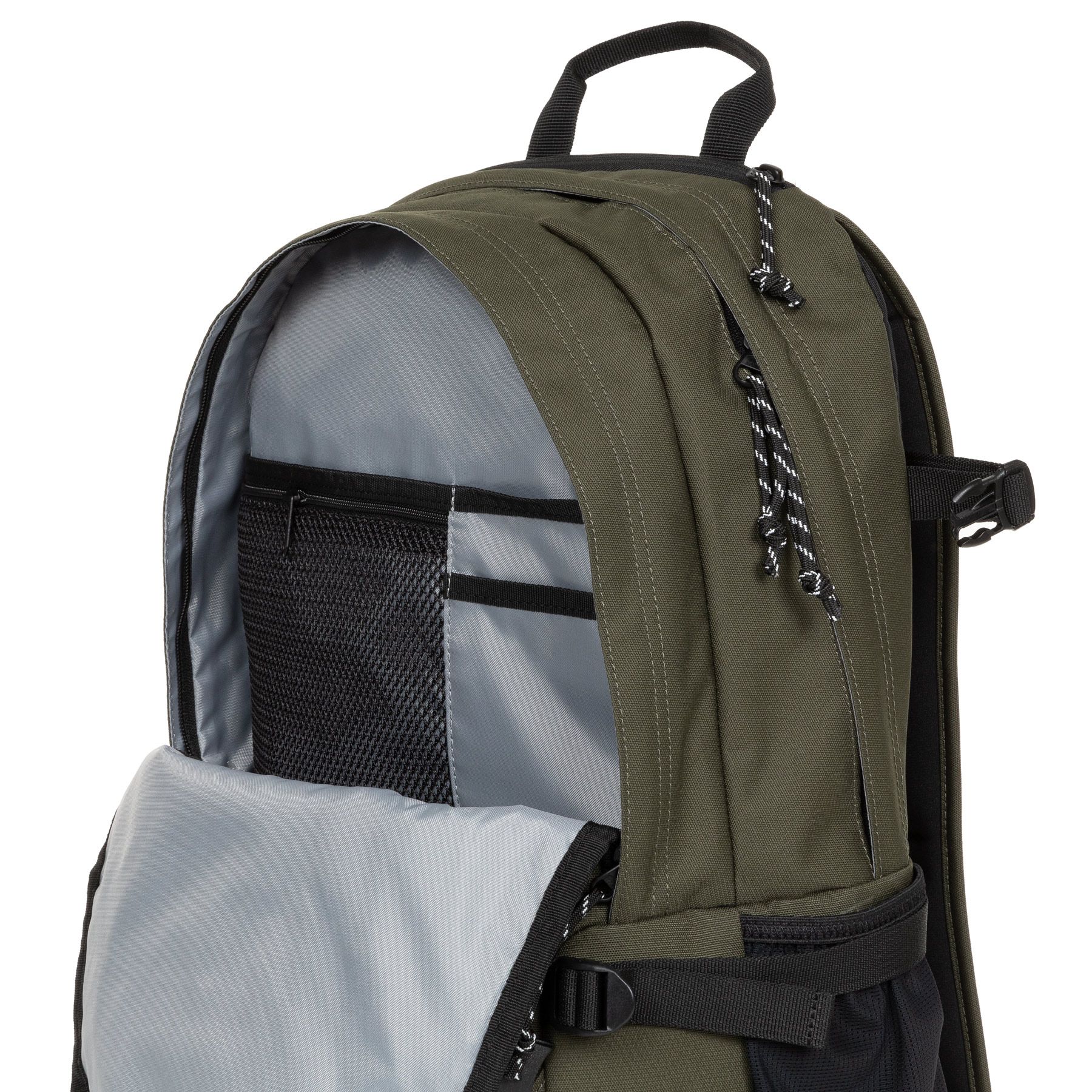 Eastpak Getter Pro är en funktionell ryggsäck som kombinerar en urban silhuett med friluftsinspirerad design. Med justerbara remmar på framsidan kan du enkelt fästa din skateboard och ta dig smidigt mellan stad och natur.