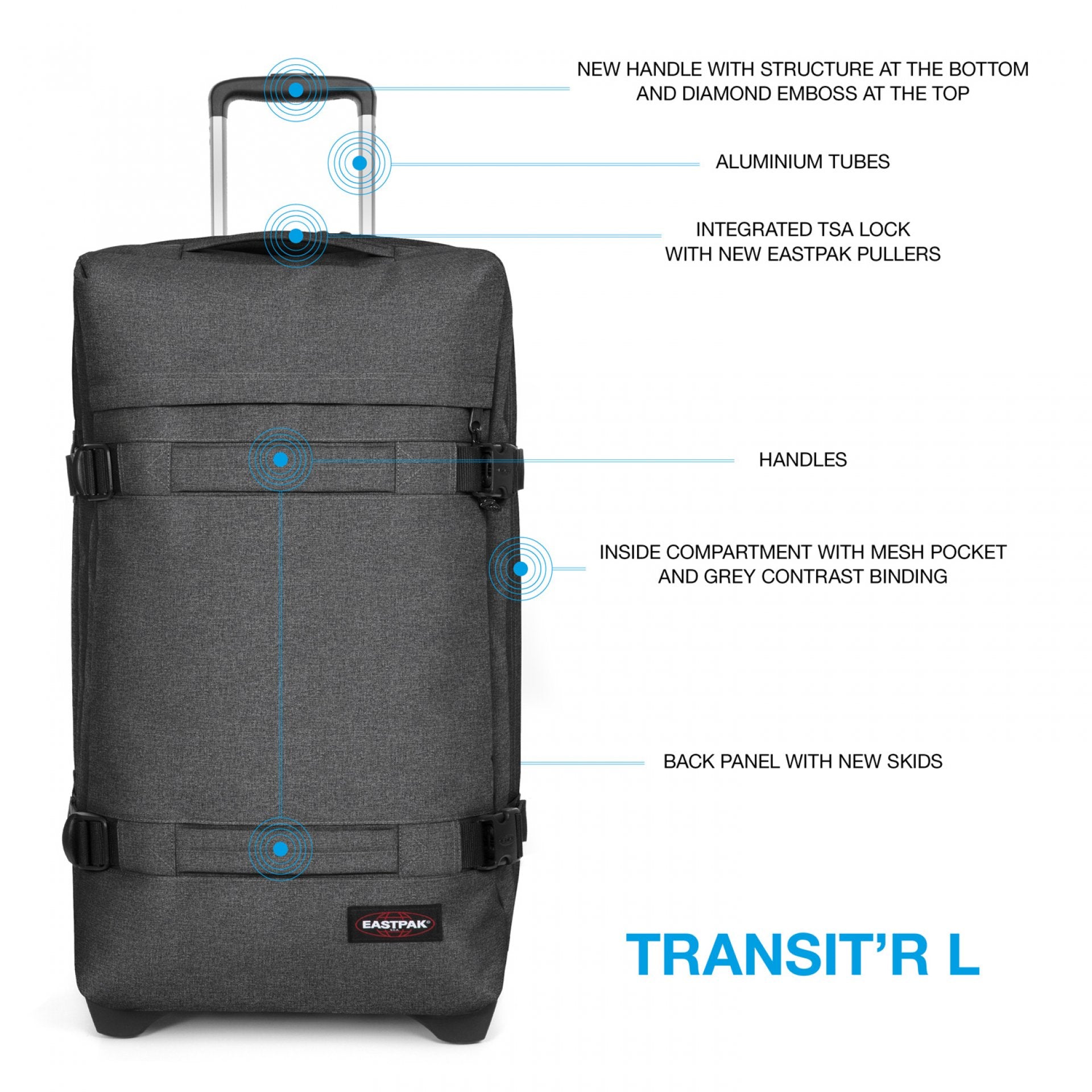 Eastpak Transit’r L är en stor och rymlig resväska som kombinerar stil med funktion. Perfekt för långresor där du behöver ordning, skydd och gott om plats för allt du vill ha med dig.