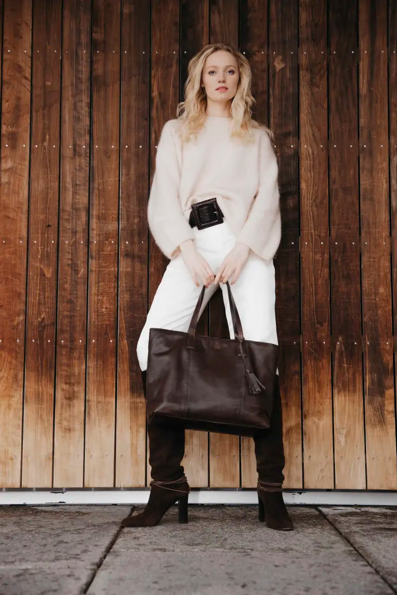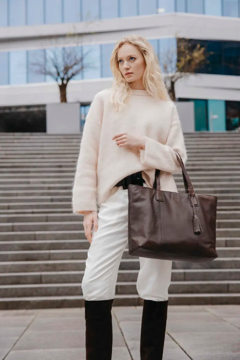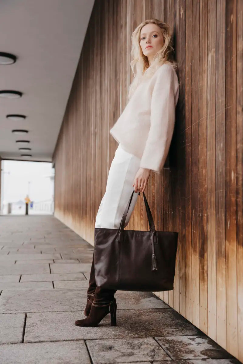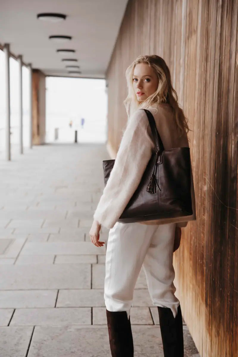 Fynda nuHouse of Nordic Amsterdam Toteväska 39cm är den perfekta väskan för dig som vill kombinera stil, funktion och kvalitet. Tillverkad i mjukt skinn med ett klassiskt uttryck och en avtagbar tofs med dekorativa nitar, ger den ett elegant men ändå avslappnat intryck. En tidlös design som fungerar lika bra till jobbet som till vardagens alla äventyr.