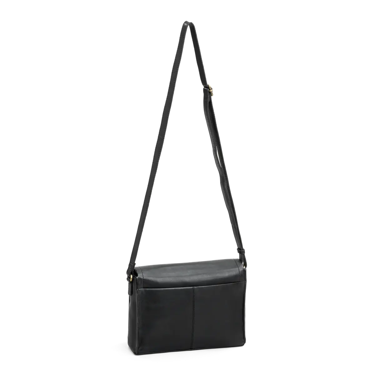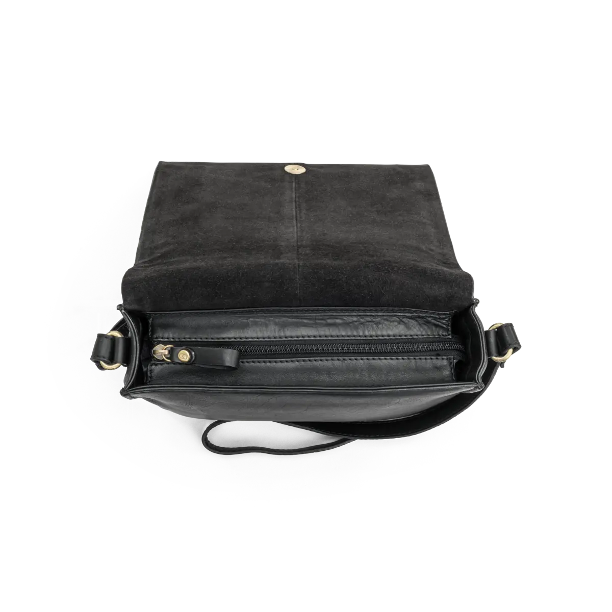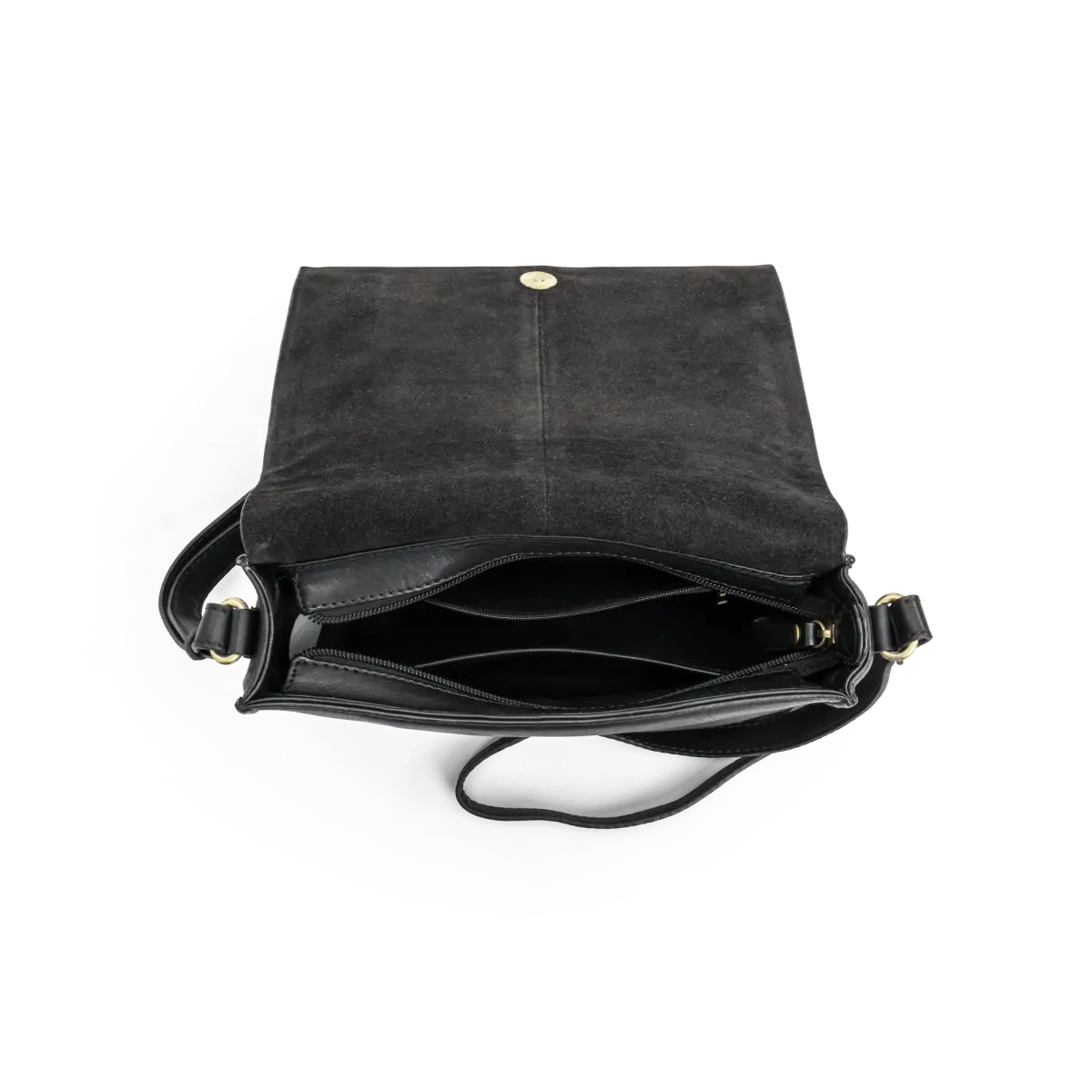 Väskan har en dragkedja under klaffen som skyddar innehållet på ett diskret sätt, samt en bakficka med dold magnetknapp för snabb åtkomst. Invändigt finns en praktisk ficka med dragkedja för nycklar, kort eller andra småsaker. Den vadderade bottnen gör att väskan står stadigt och håller formen över tid.