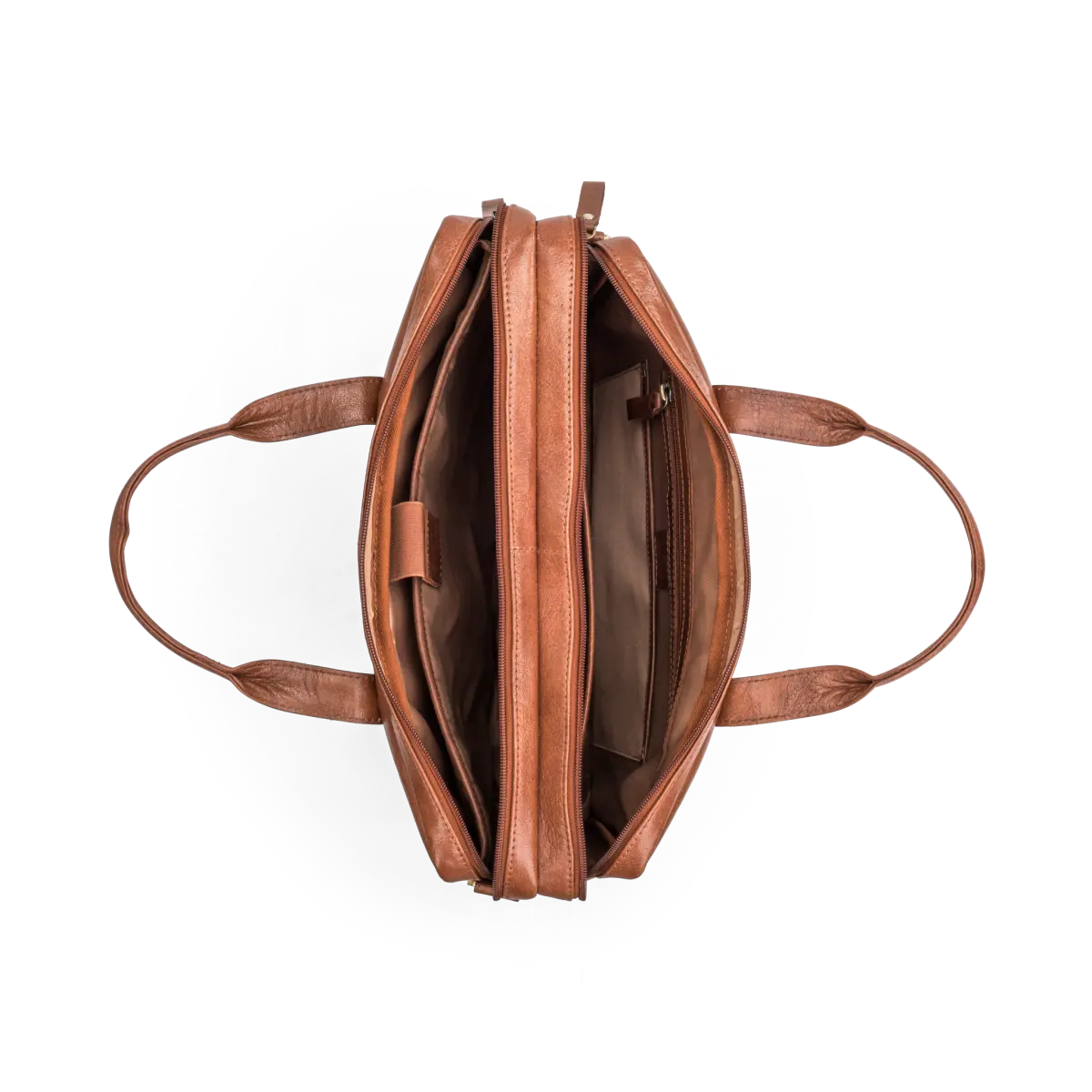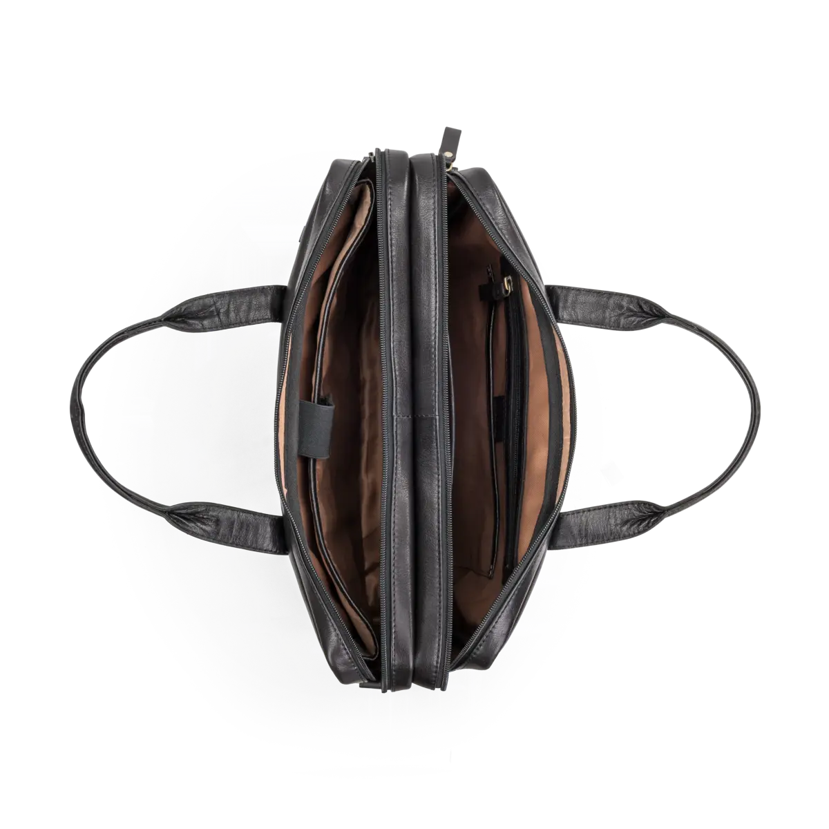 Väskan har två huvudfack som gör det enkelt att hålla ordning på dator, dokument och tillbehör. Det bakre facket är vadderat för att skydda din 14-tums laptop, medan det främre facket har en smart dragkedjeficka och en större öppen ficka för kablar, block och tillbehör. Den genomtänkta inredningen gör väskan till ett perfekt val för arbete, möten och resor.