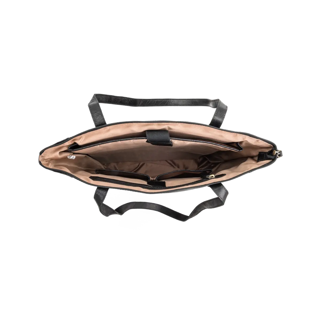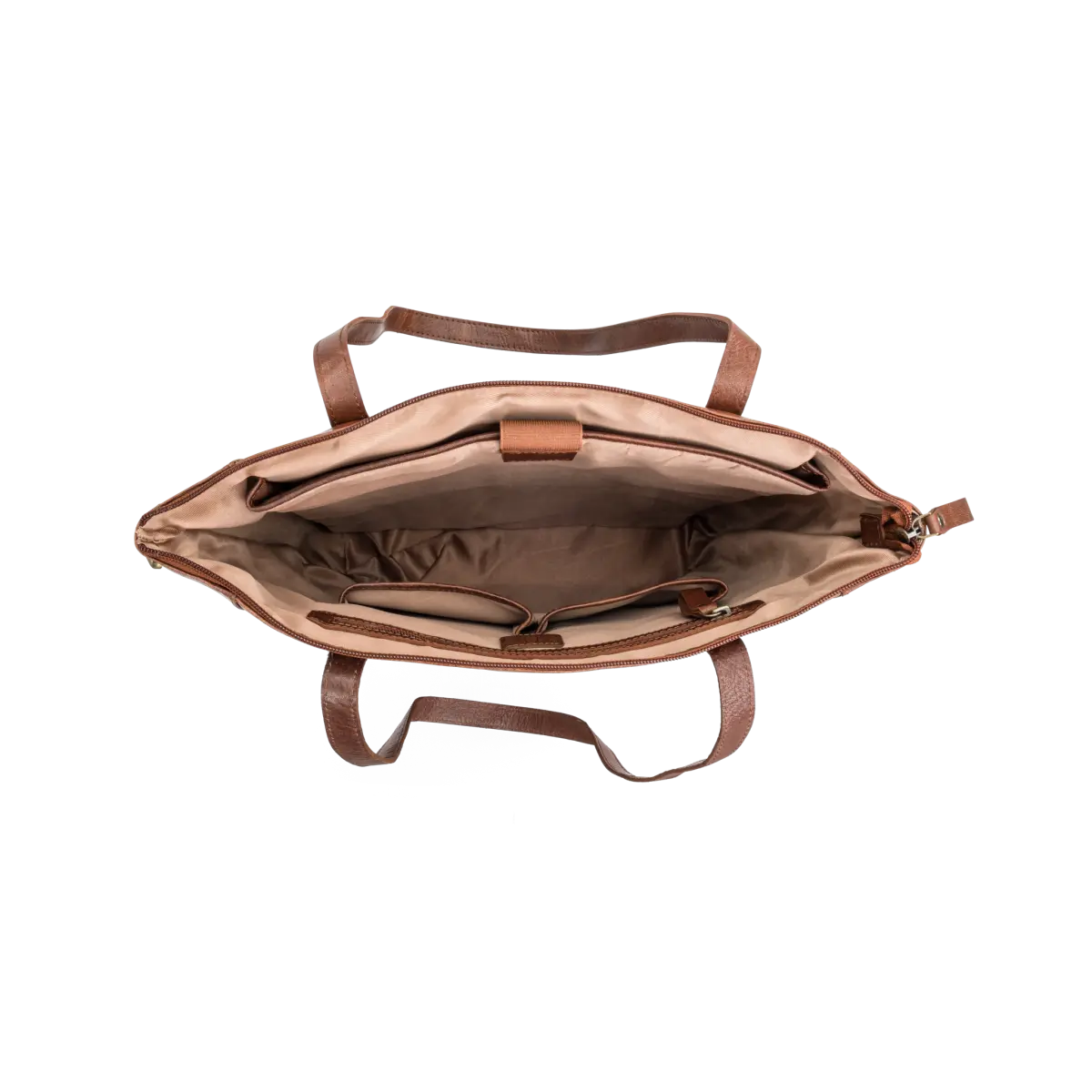 Väskan har en innerficka i skinn med dragkedja som håller dina värdesaker säkra. De långa axelremmarna gör att väskan sitter bekvämt, även över jackan. En extra justerbar axelrem medföljer för flexibilitet, vilket gör den enkel att bära både till kontoret och på fritiden. De antikborstade metalldetaljerna bidrar till ett exklusivt intryck och lång hållbarhet.
