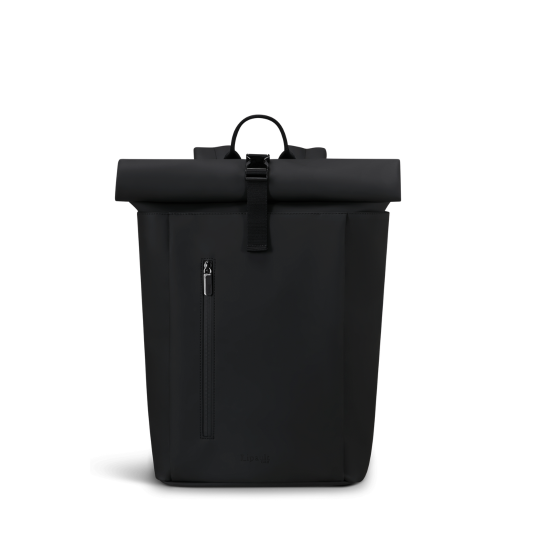 Lost In Berlin Rolltop Ryggsäck 40cm har en matt, gummiliknande PU/polyester-ytfinish (52 % PU / 48 % polyester) med “peach skin”-känsla som är reptålig och vattenavvisande – idealisk för urbana miljöer. Den monokroma designen inkluderar omvända dragkedjor med matta metall- och silikonpullers, två framfickor (varav en dold), två sidofickor och ett bakre hemligt fack).
