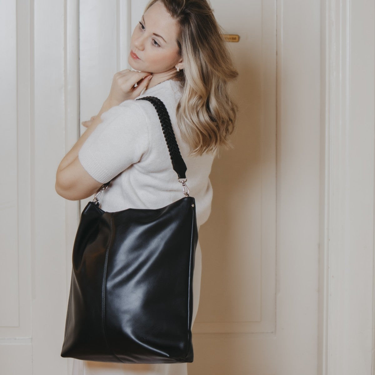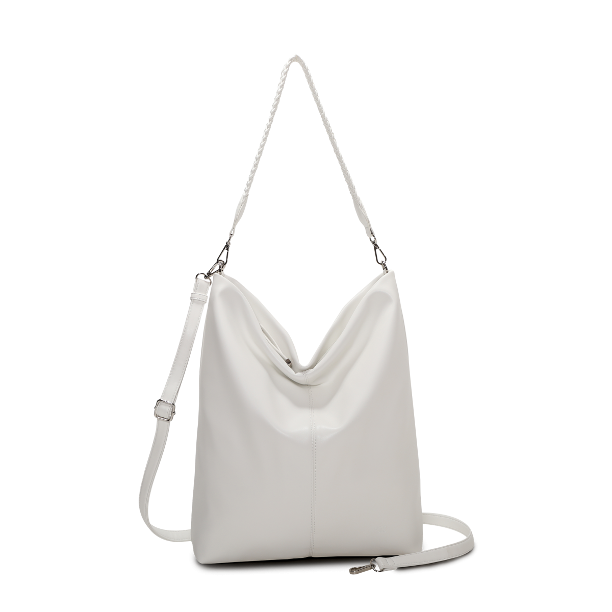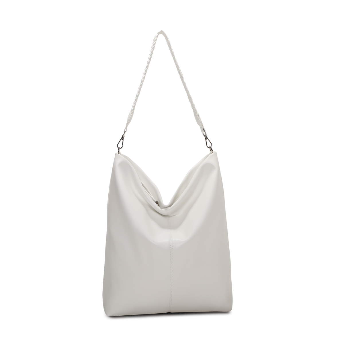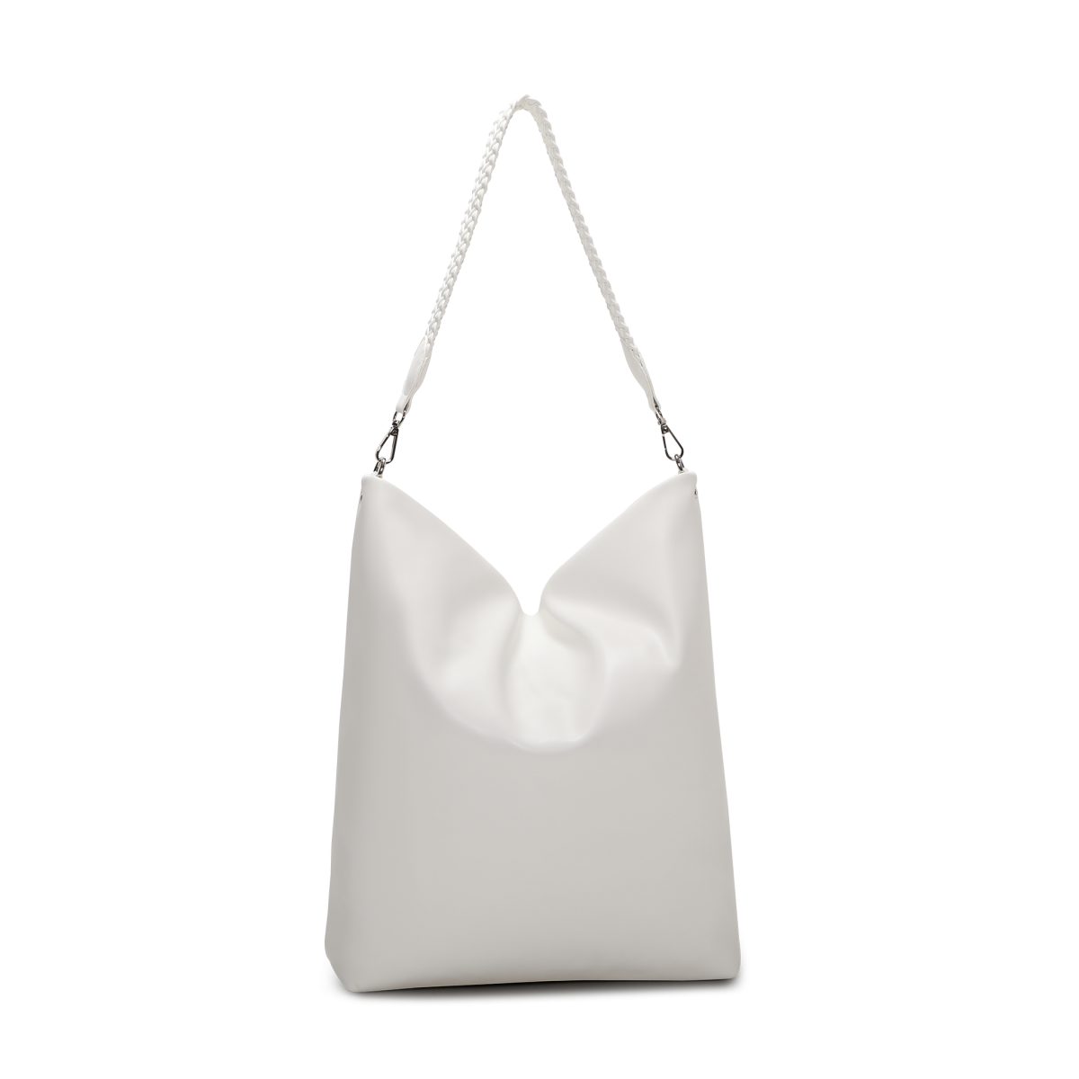 Väskan erbjuder flera bärmöjligheter tack vare den flätade korta axelremmen och den långa avtagbara remmen. Du kan bära den i handen, på axeln eller som crossbody. De silverfärgade metalldetaljerna och den dekorativa blixtlåsdragaren ger en modern finish som kompletterar den övergripande eleganta designen.