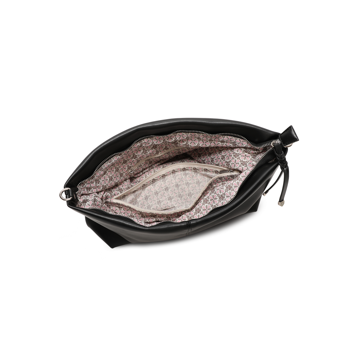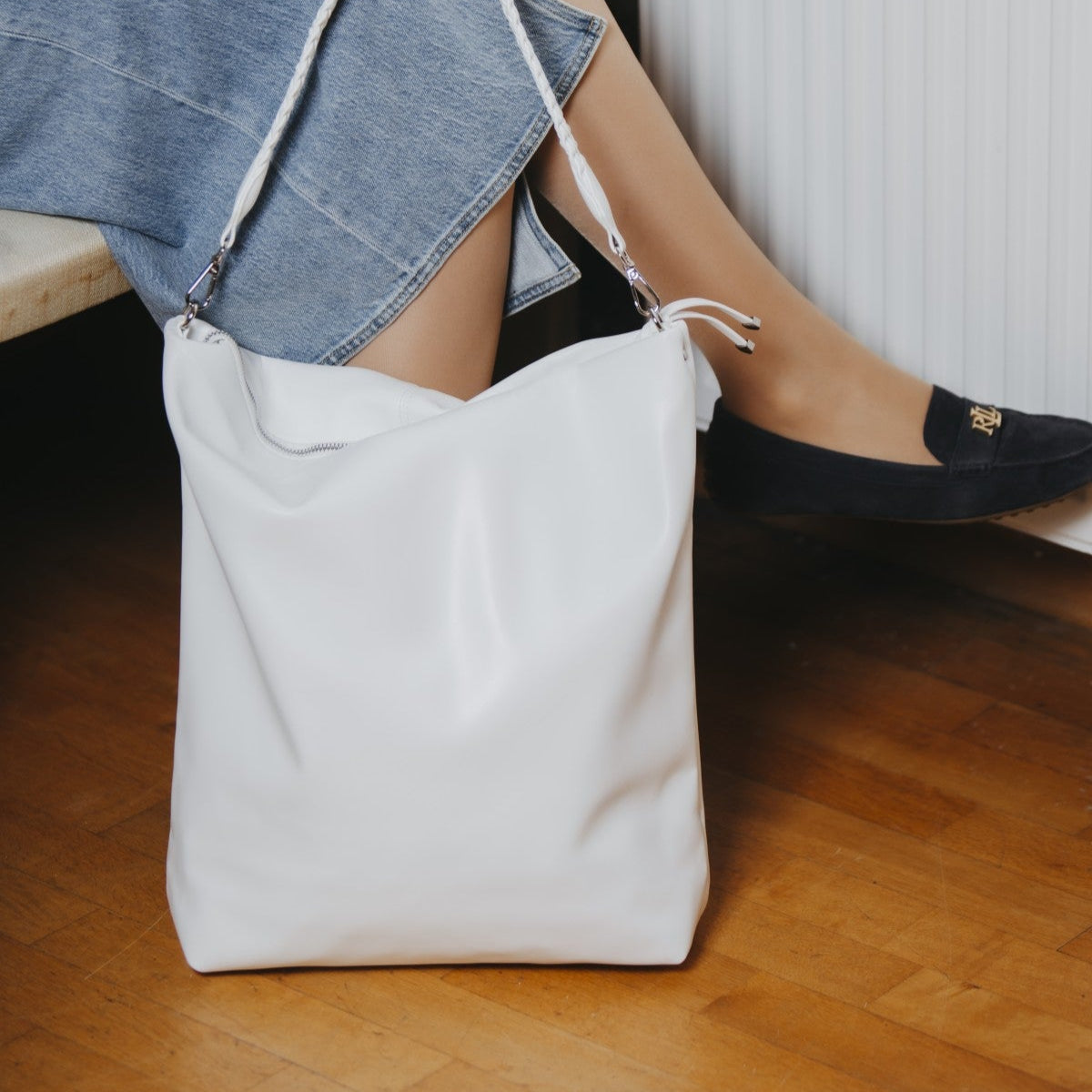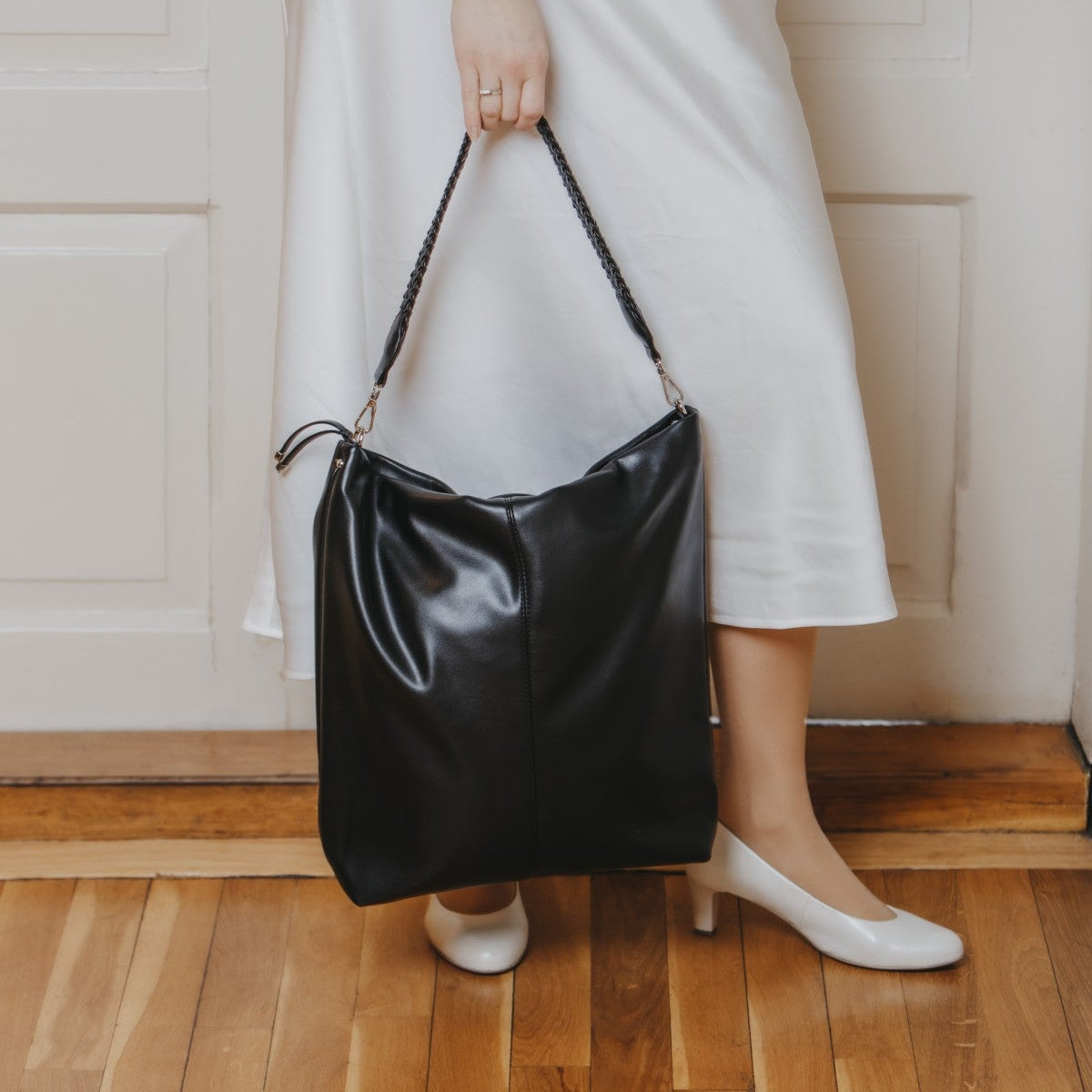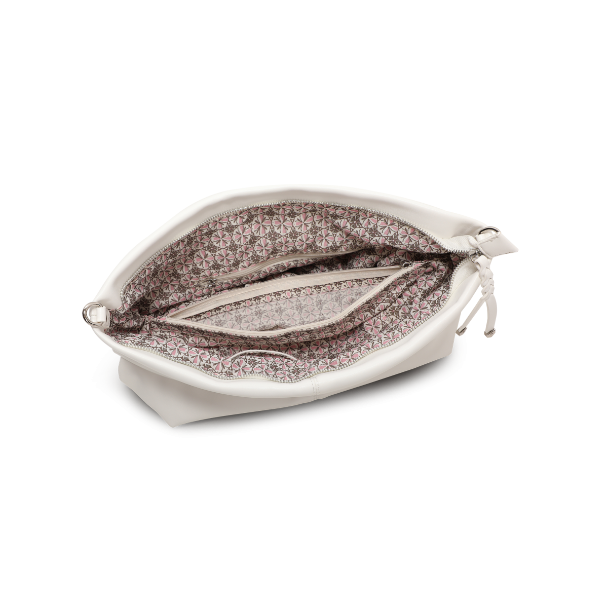 Väskan erbjuder flera bärmöjligheter tack vare den flätade korta axelremmen och den långa avtagbara remmen. Du kan bära den i handen, på axeln eller som crossbody. De silverfärgade metalldetaljerna och den dekorativa blixtlåsdragaren ger en modern finish som kompletterar den övergripande eleganta designen.