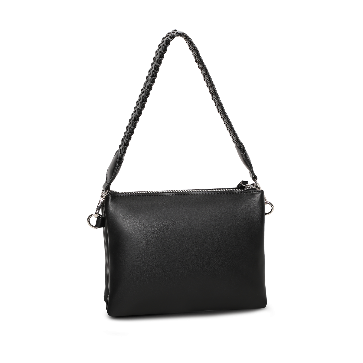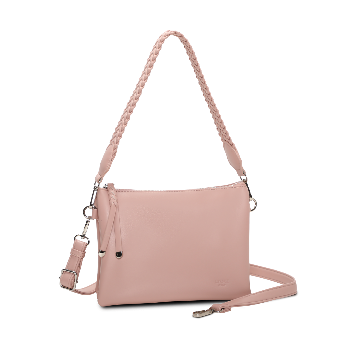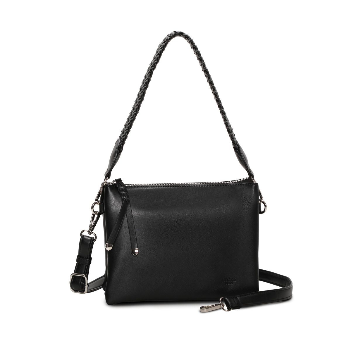 Väskan har tre huvudfack, vilket gör det enkelt att hålla ordning på dina tillhörigheter. Mittenfacket är utrustat med en dragkedja för extra säkerhet. Den flätade korta remmen ger en unik touch, medan den avtagbara och justerbara remmen erbjuder full flexibilitet i användningen.