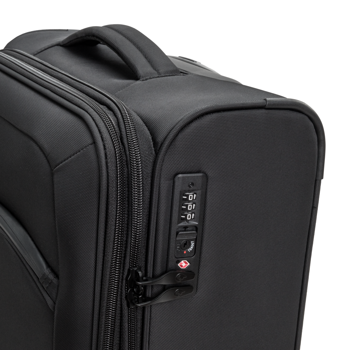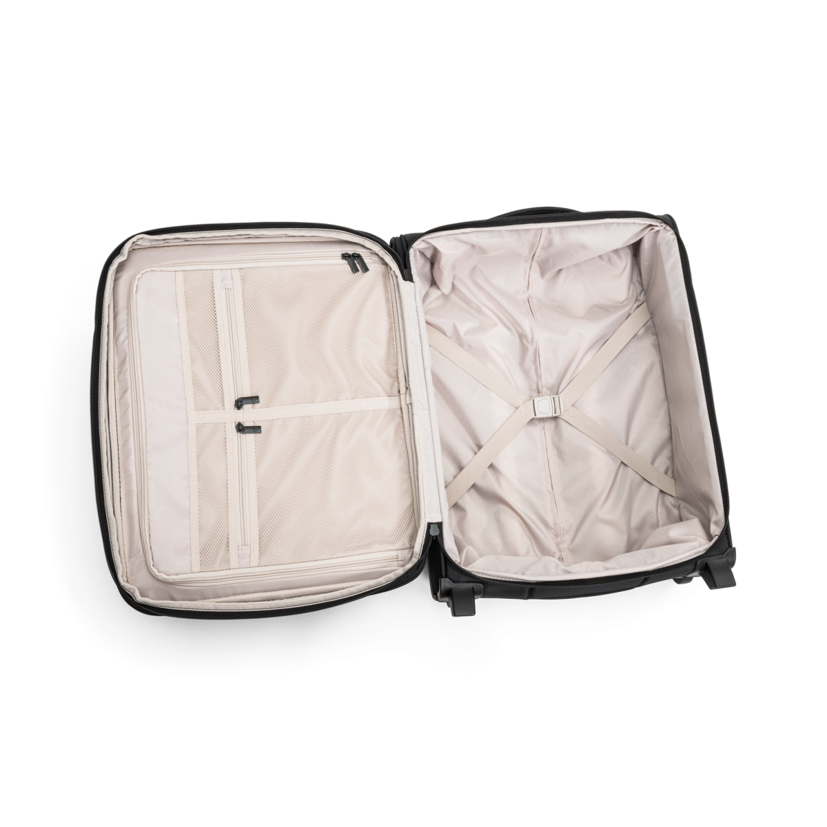 Väskan rullar stabilt på två robusta hjul och styrs smidigt med ett lätt aluminiumhandtag. Den har en expanderbar kapacitet, vilket ger extra utrymme när det behövs. Ett integrerat TSA-godkänt kombinationslås säkerställer att dina tillhörigheter är skyddade under internationella resor. Invändigt är väskan fodrad med återvunnet material, vilket gör den till ett mer hållbart val.