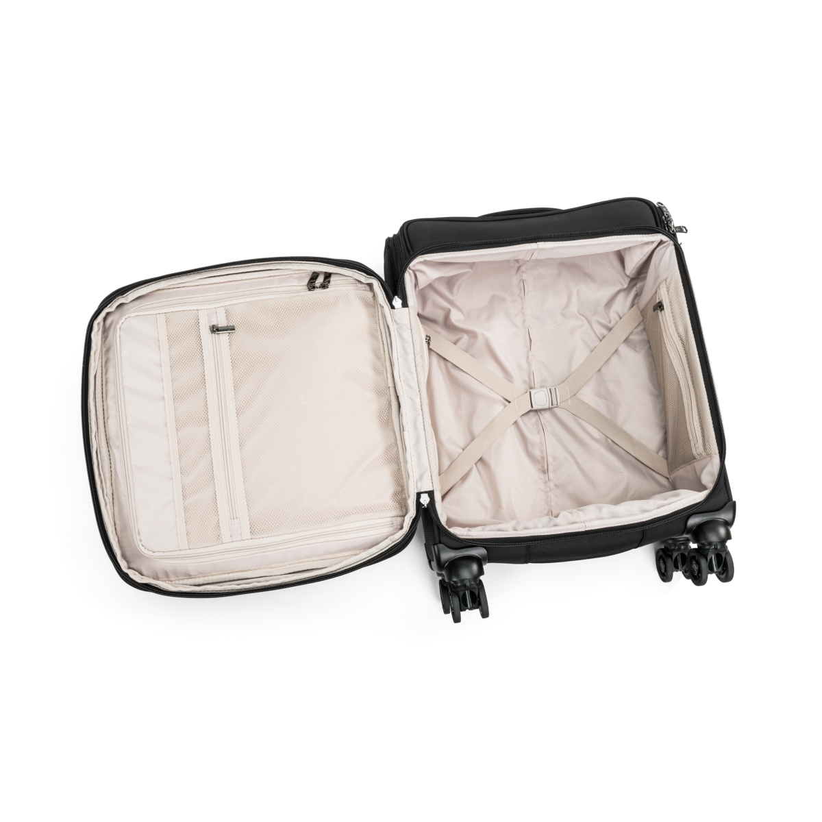 För att skydda dina tillhörigheter har väskan ett TSA-godkänt kombinationslås och en låsbar dragkedja. Invändigt finns en ljus, stilren beige inredning tillverkad av återvunnet tyg, komplett med smarta fack och organisering för en stressfri resa. Denna kabinväska är perfekt som handbagage på de flesta flygbolag.
