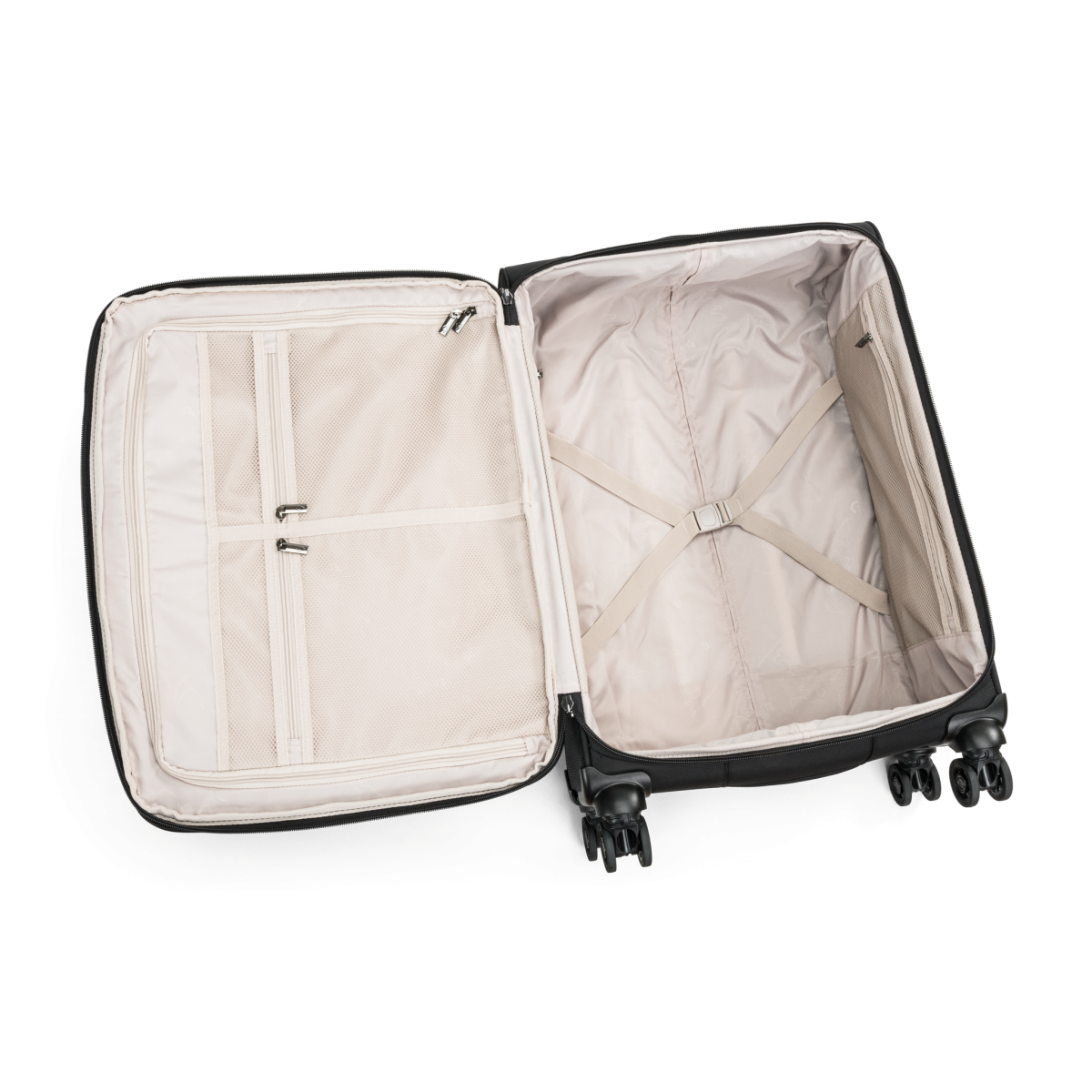 Invändigt erbjuder väskan en stilren beige inredning tillverkad av återvunnet tyg. Med smarta fack och strukturerad organisering blir packningen både enkel och effektiv. Lounge Premium Medium är den perfekta resväskan för veckolånga äventyr där kapacitet och stil är avgörande.