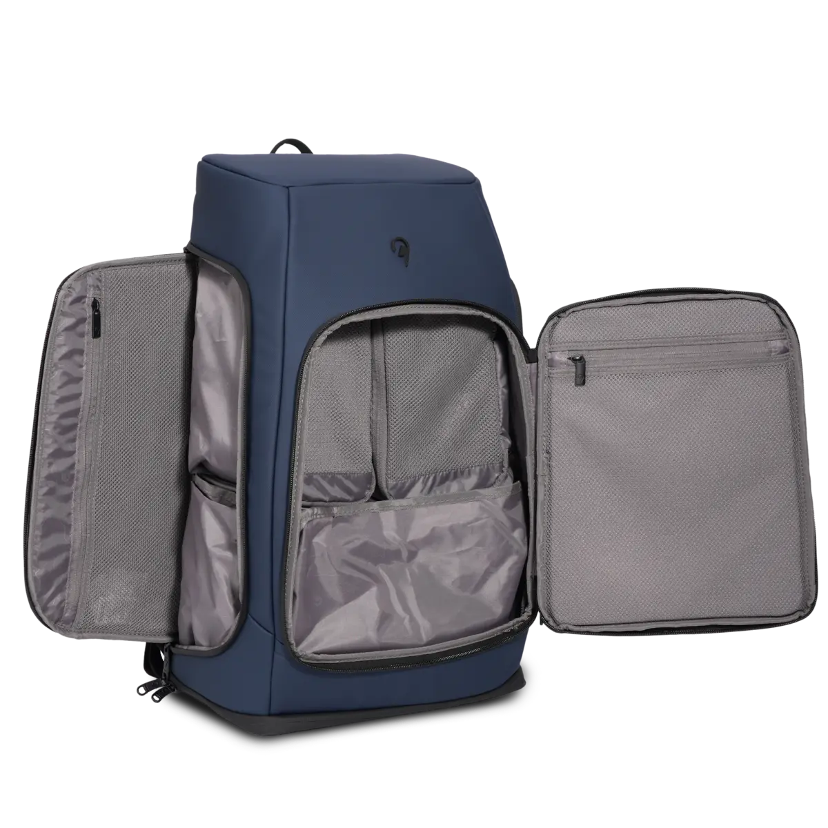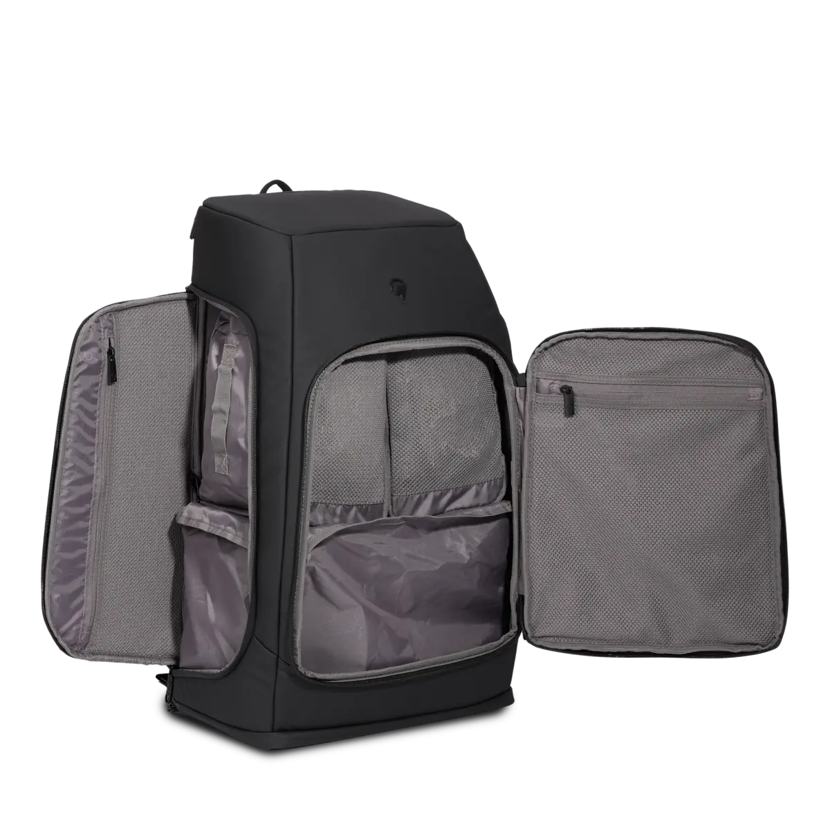 Insidan öppnas på ett resväskeinspirerat sätt med bred öppning och sidopaneler, vilket ger en tydlig överblick över hela packningen. Invändiga meshfickor hjälper dig att separera kläder och tillbehör, och det ingår packkuber som syns på bilden, vilket gör organiseringen ännu enklare. Ryggsäcken har dessutom ett vadderat fack för laptop eller surfplatta som skyddar tekniken under transport. Runt midjan finns ett justerbart spänne som ger extra stabilitet när du bär tungt eller rör dig mycket.