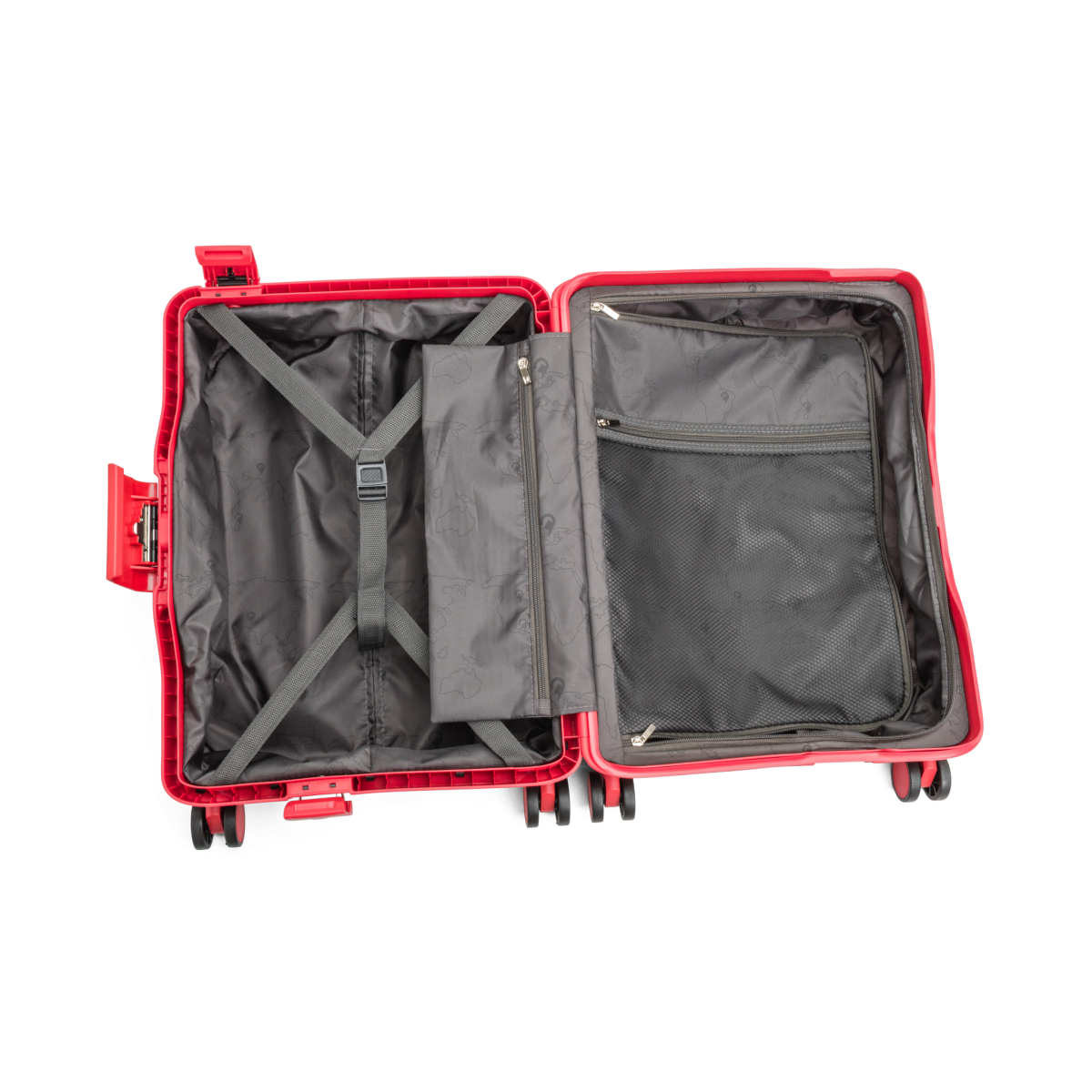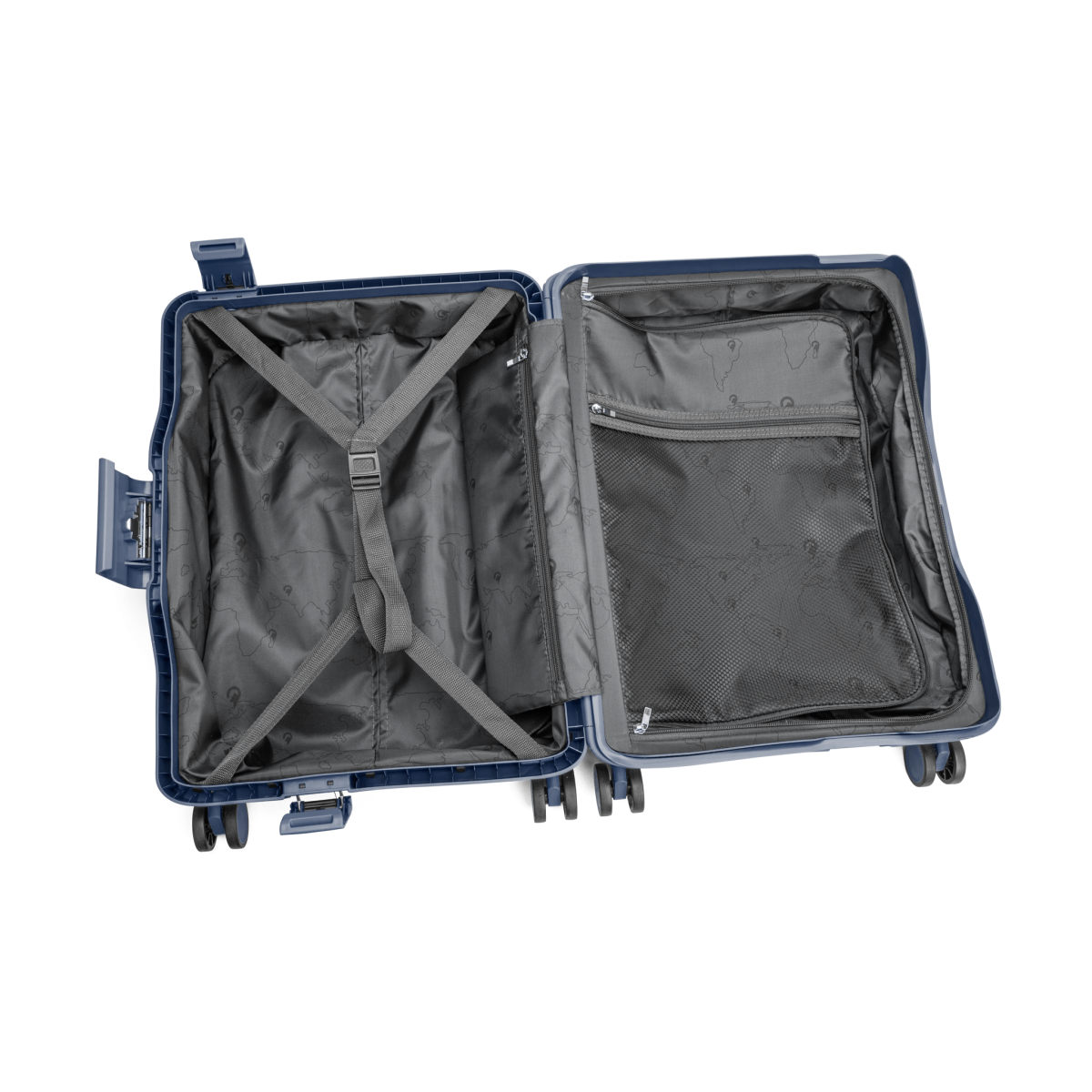Insidan av varje väska är designad med praktiska blixtlåsfickor och ett elastiskt korsband som håller packningen på plats under hela resan. Denna genomtänkta inredning gör det enkelt att organisera och säkra dina tillhörigheter, vilket ger en bekymmersfri reseupplevelse.