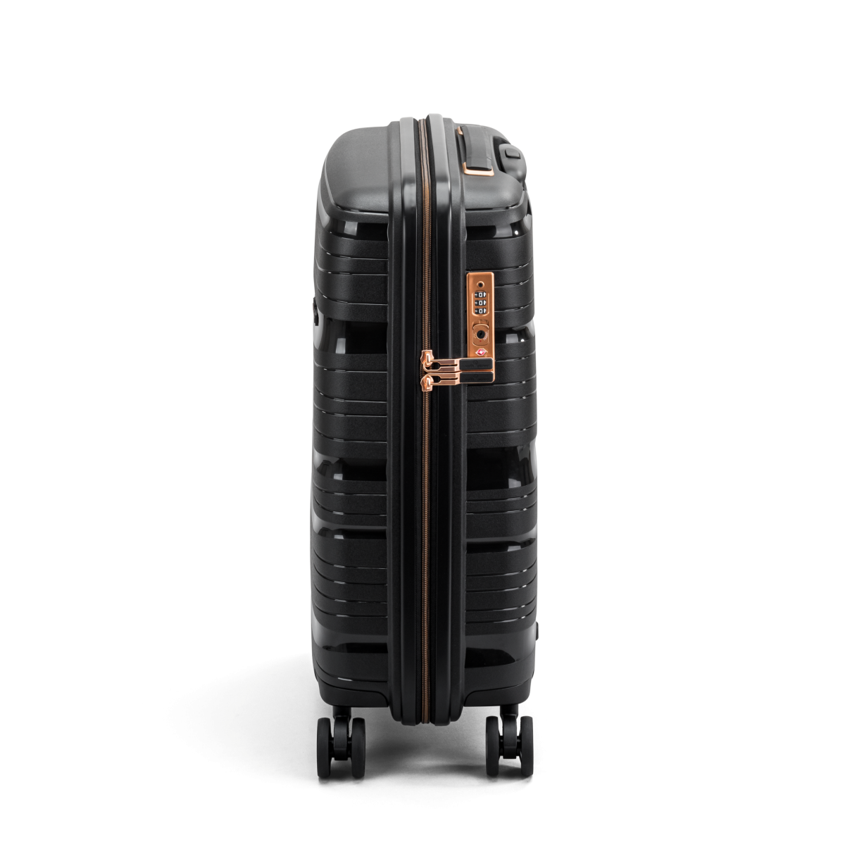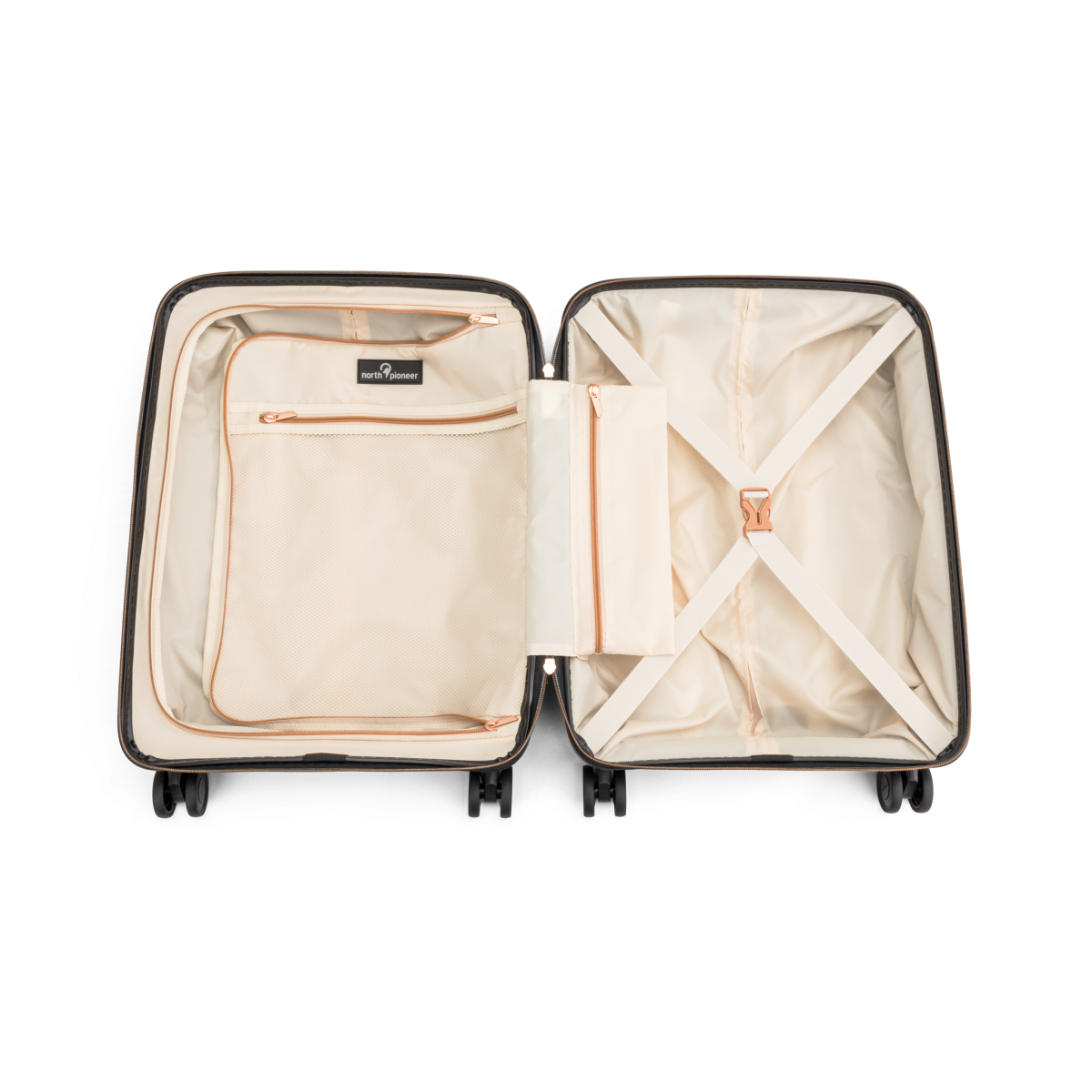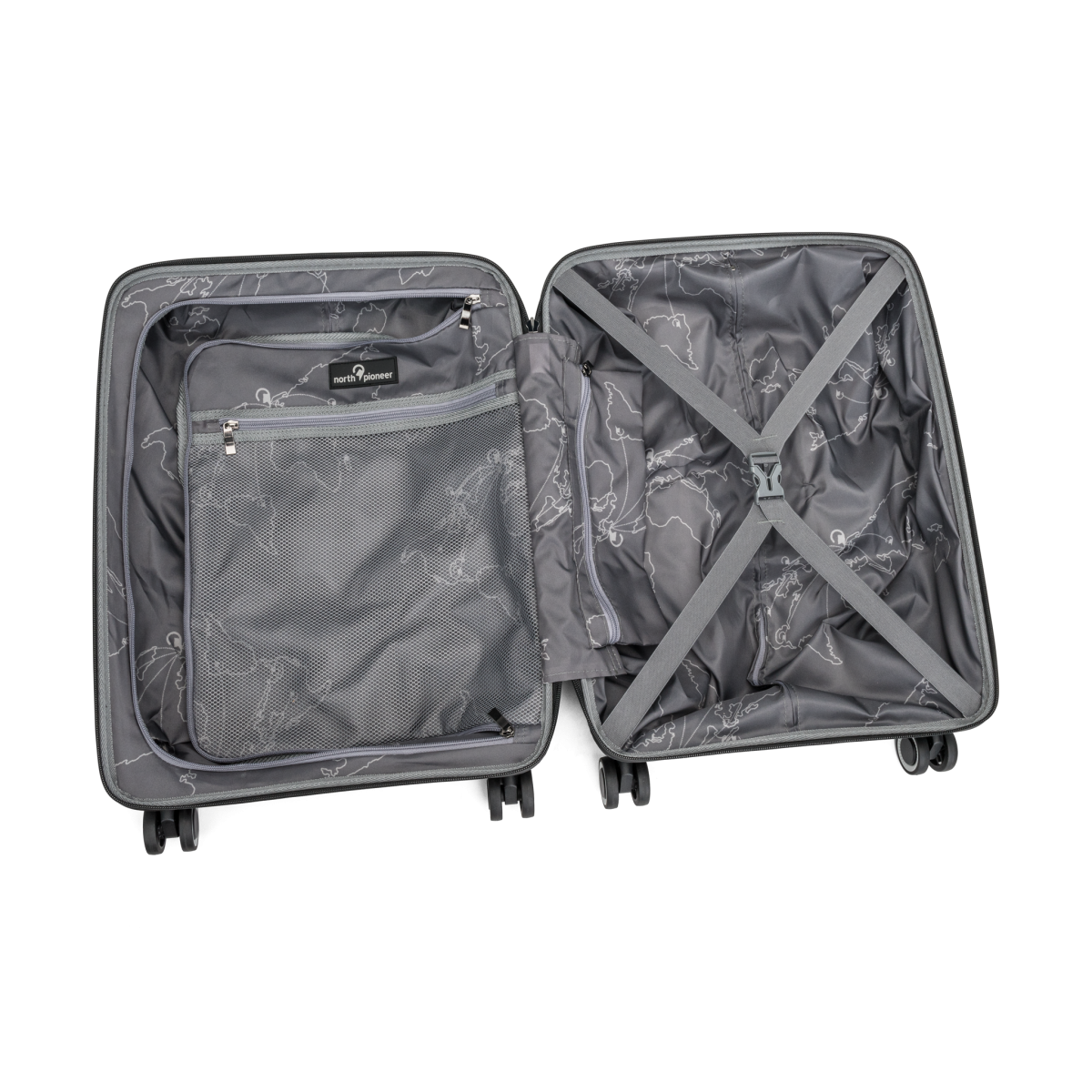 Varje väska är utrustad med fyra dubbelhjul som ger 360° rotation för optimal rörlighet, oavsett underlag. Den smarta inredningen med blixtlåsfickor och elastiska korsband hjälper dig att organisera packningen och hålla allt på plats under resan.