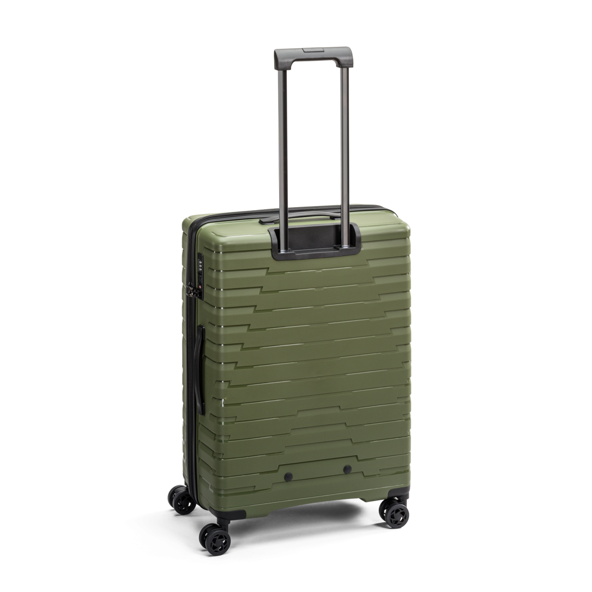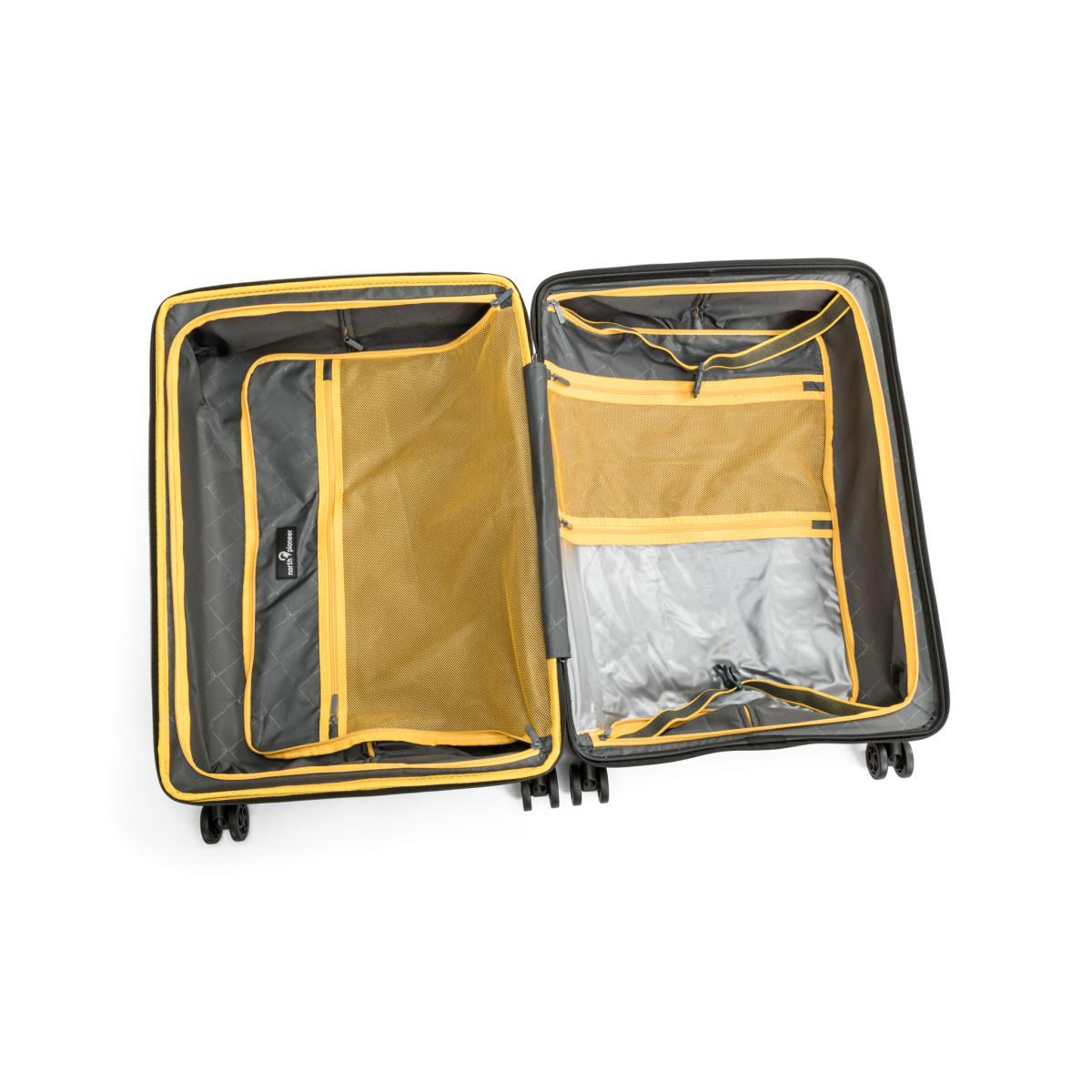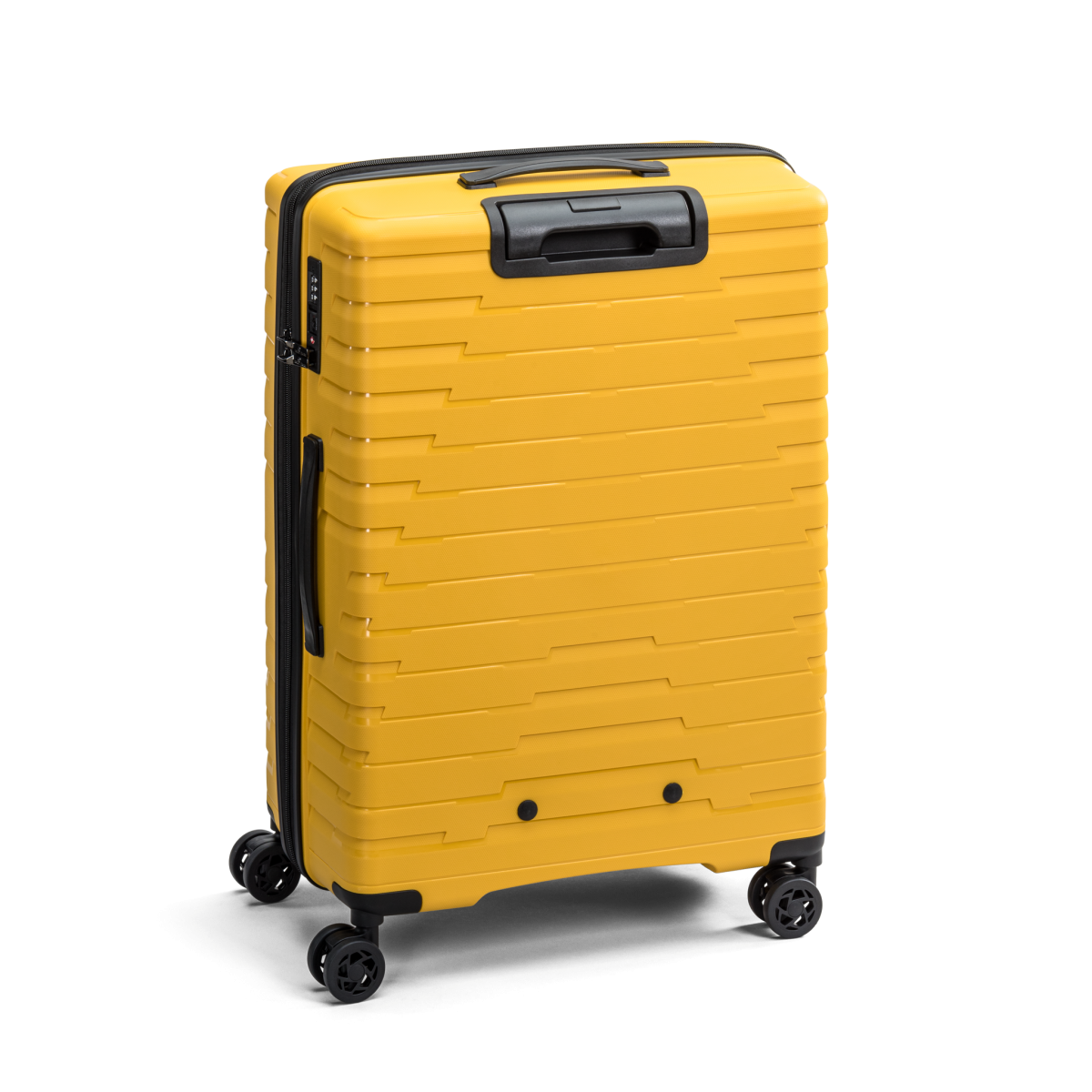 Fyra fjädrande 360°-hjul gör väskan lätt att manövrera i alla riktningar, medan ett teleskophandtag i aluminium ger stabil och bekväm hantering. Den reparerbara designen innebär att hjul, handtag och lås kan bytas ut vid behov, vilket förlänger väskans livslängd och gör den till en hållbar investering.