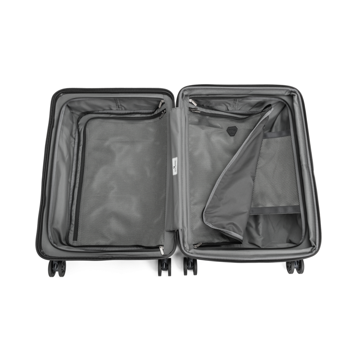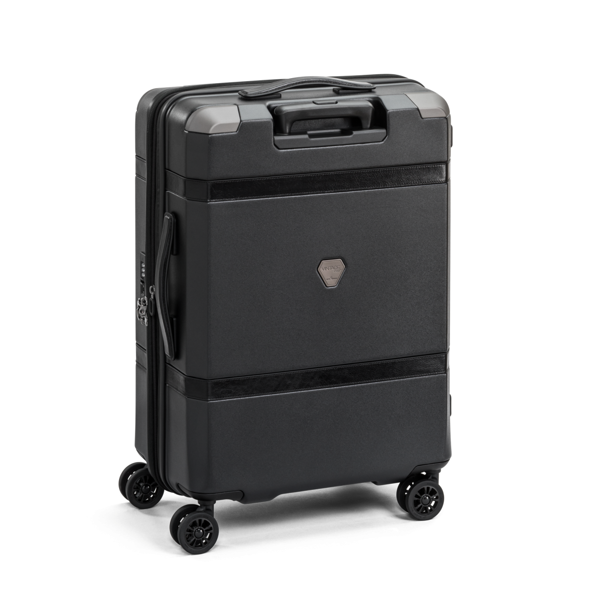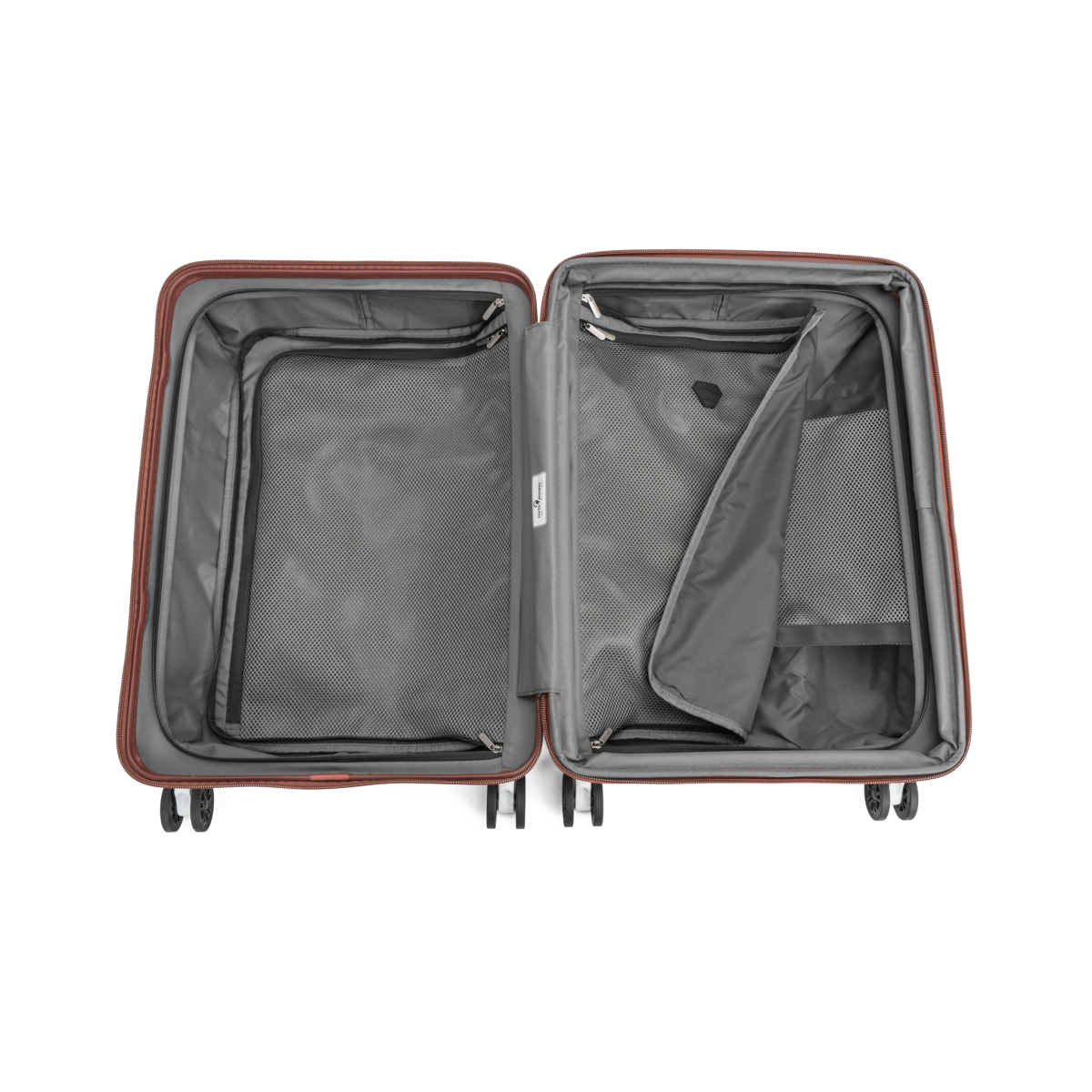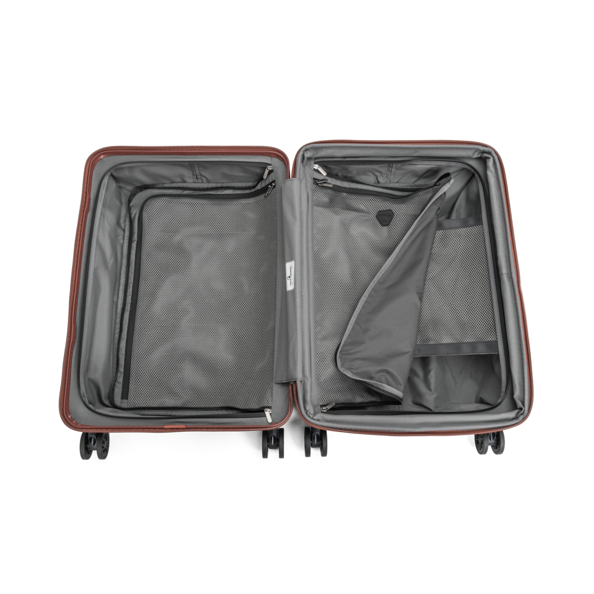 Invändigt erbjuder väskan en rymlig layout med kompressionspaneler, elastiska packband och avdelare, vilket underlättar organiserad packning. Det lyxiga peachskinnfodret ger en extra touch av elegans. Ett handtag i karbon-look på ovansidan adderar ytterligare en stilfull detalj till denna redan exklusiva resväska.