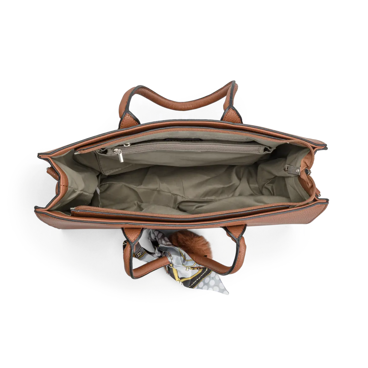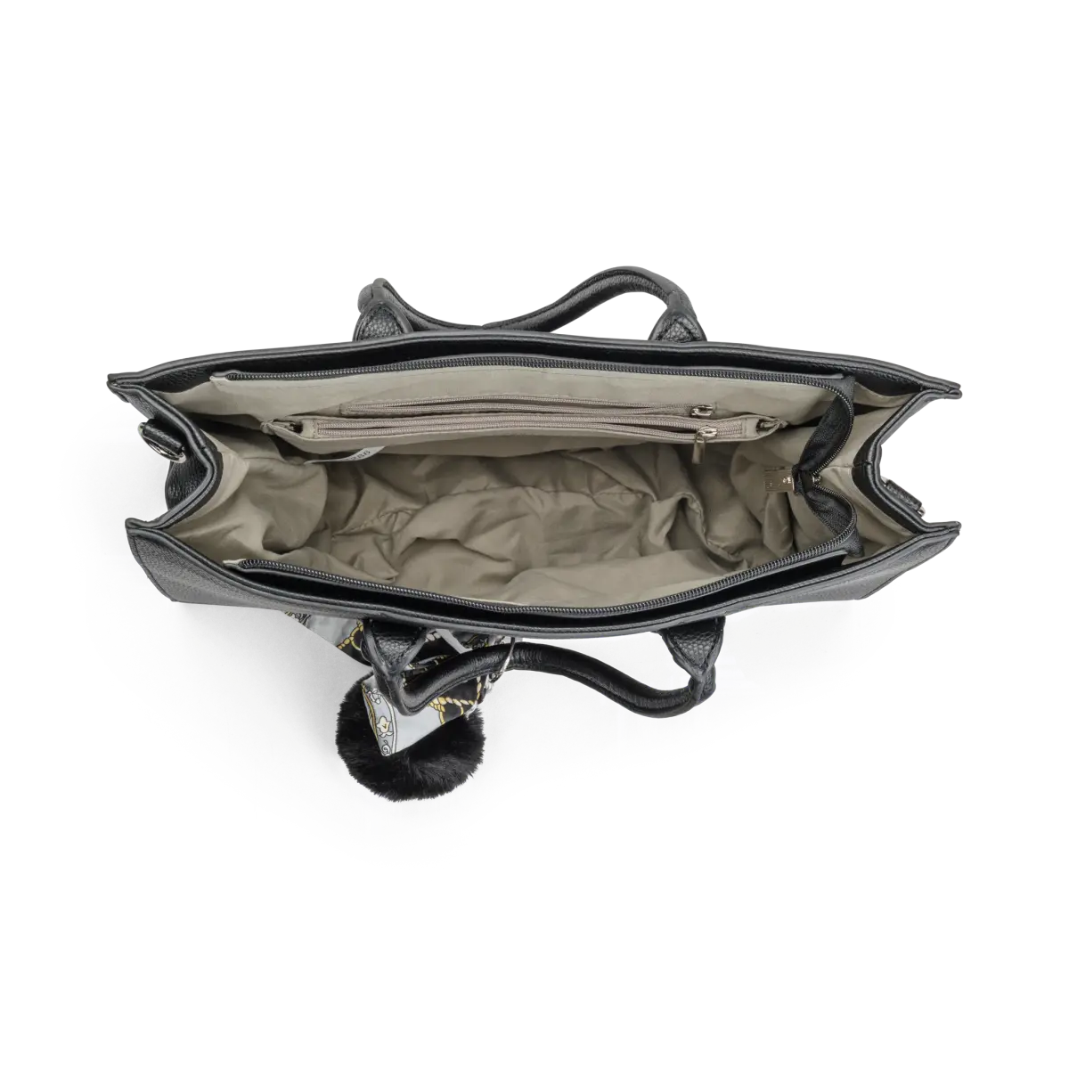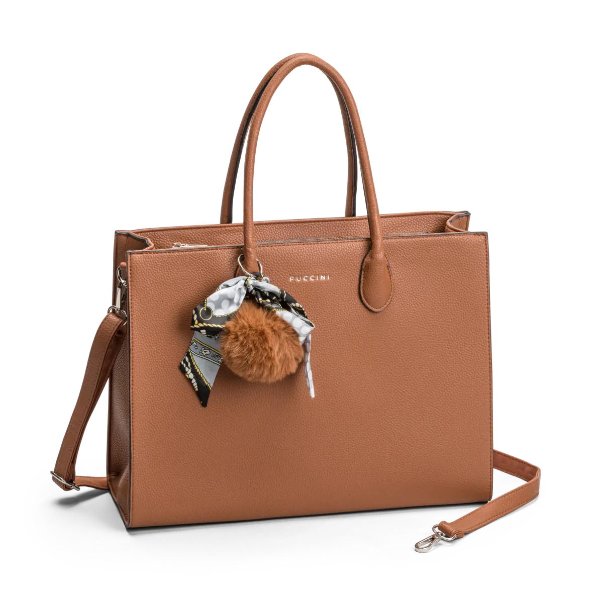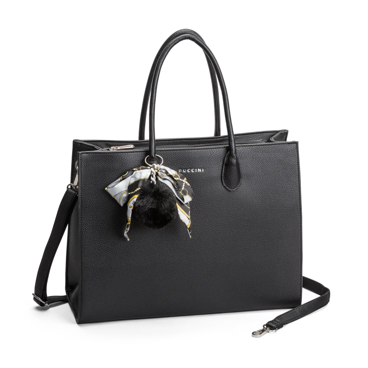 Puccini Anna Toteväska 39 cm är en stilig och stadig handväska i klassisk kassemodell. Den är tillverkad av mjuk och slitstark skinnimitation som ger en lyxig känsla utan att kompromissa med hållbarheten. De silverfärgade metalldetaljerna och den dekorativa tofsen med miniscarf sätter en elegant ton som gör väskan till ett riktigt blickfång oavsett tillfälle.