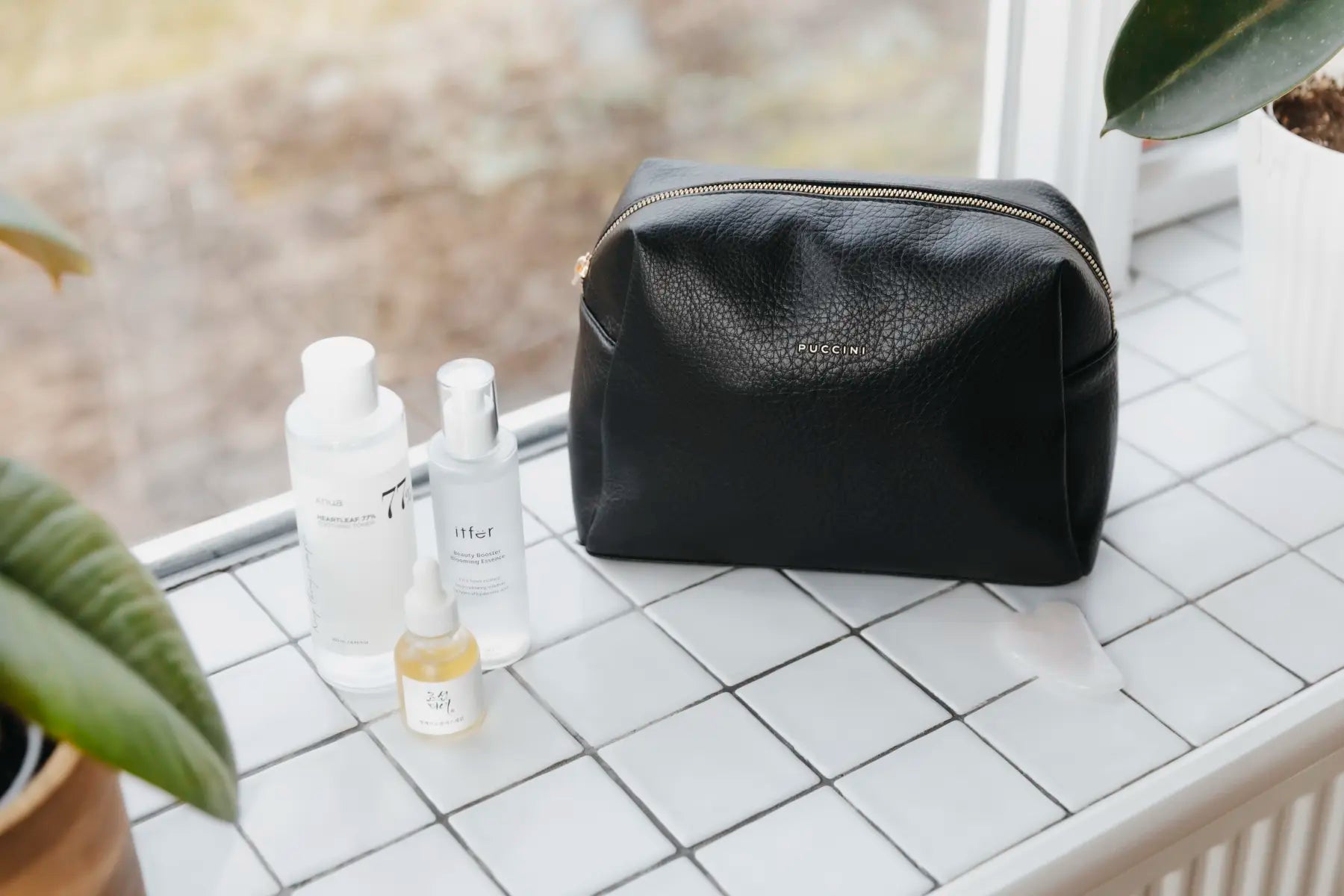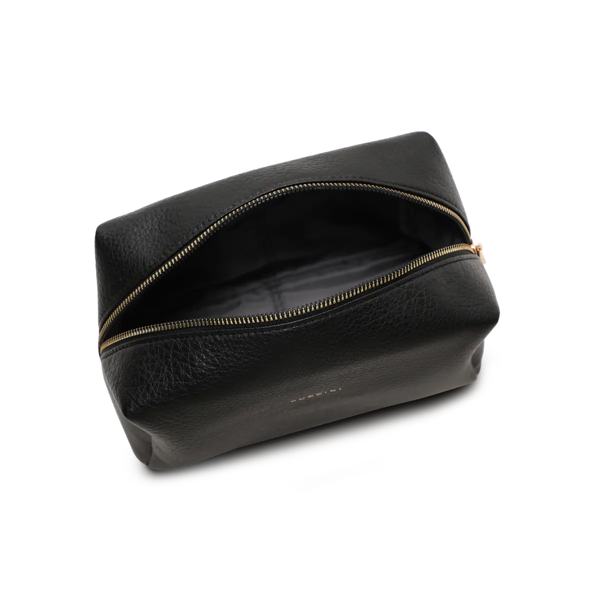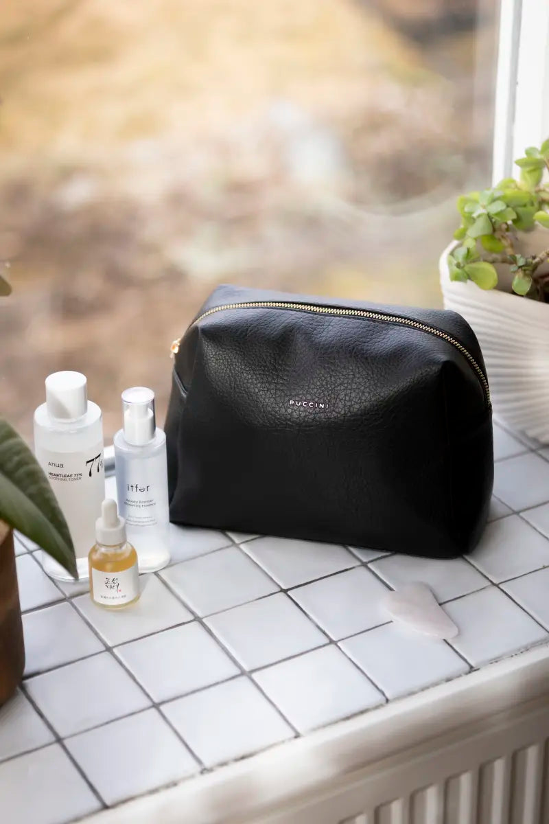 Puccini Disa är en necessär som förenar smart förvaring med en tidlös och elegant design. Den är tillverkad i mjuk, veganvänlig skinnimitation och pryds av guldfärgade metalldetaljer. Detta gör den till ett perfekt val både för hemmabruk och resor. Den stilrena ytan och de smakfulla detaljerna gör necessären till en uppskattad accessoar.