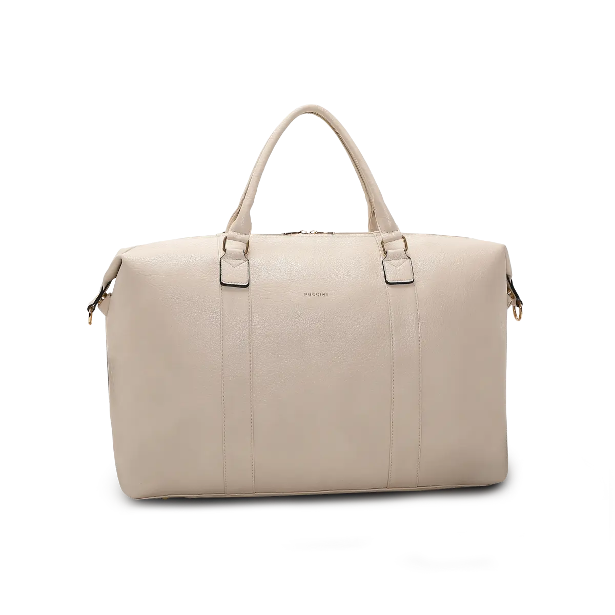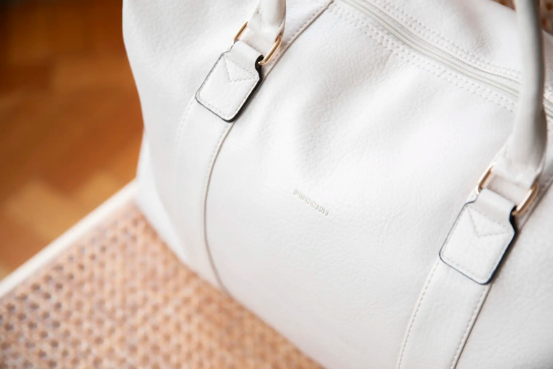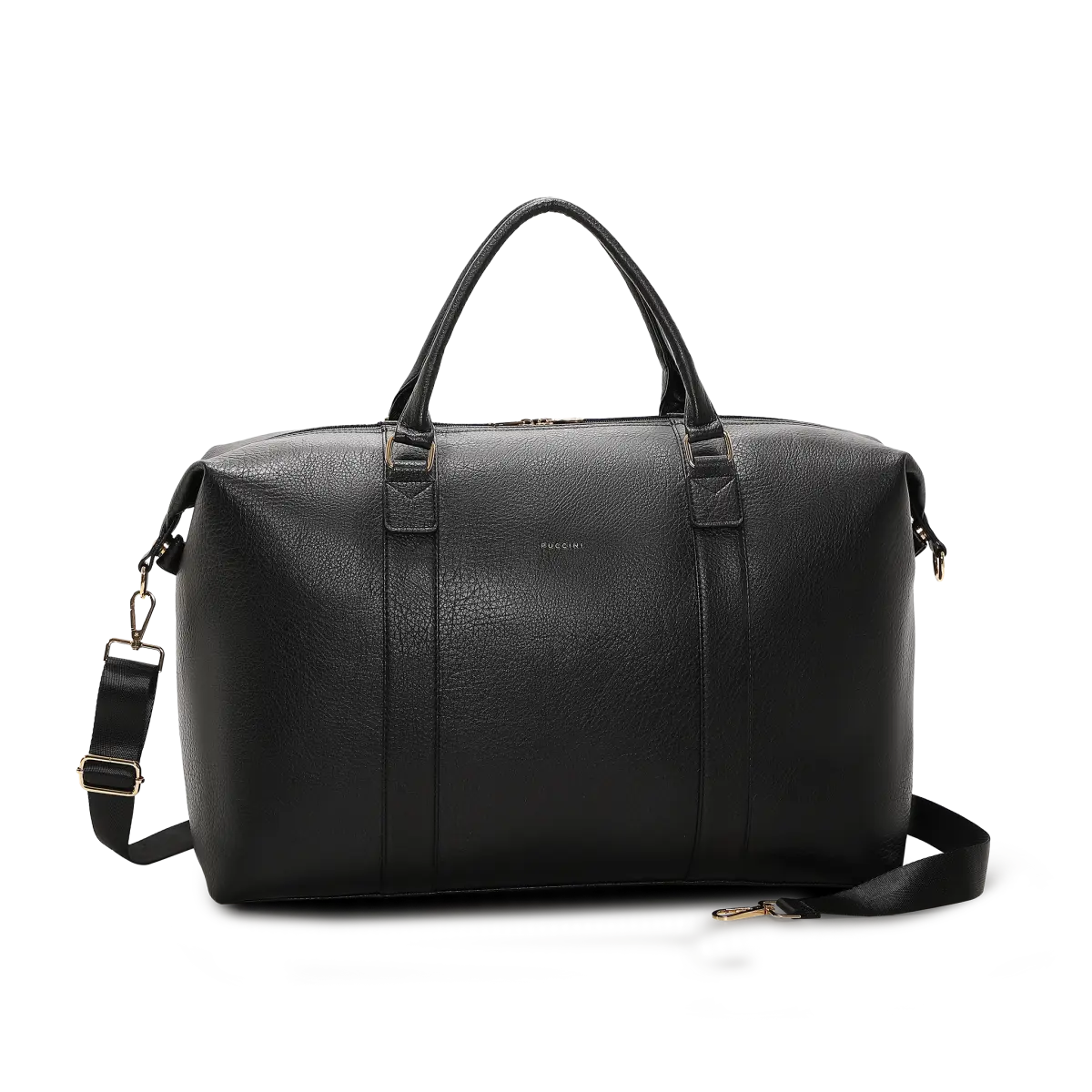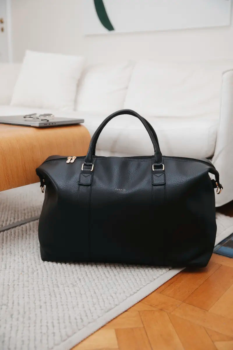 Puccini Disa är en weekendbag som kombinerar rymlighet med en elegant design. Tillverkad i mjuk, veganvänlig skinnimitation, erbjuder denna bag en sofistikerad look med guldfärgade metalldetaljer. Den är idealisk för weekendresor, övernattningar eller som kabinväska, och ger dig möjlighet att packa allt du behöver utan att kompromissa med stilen.