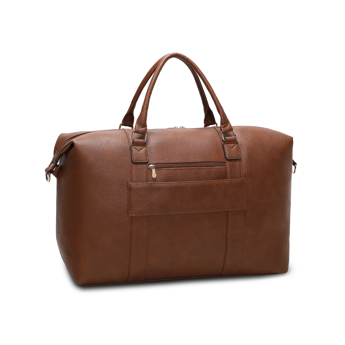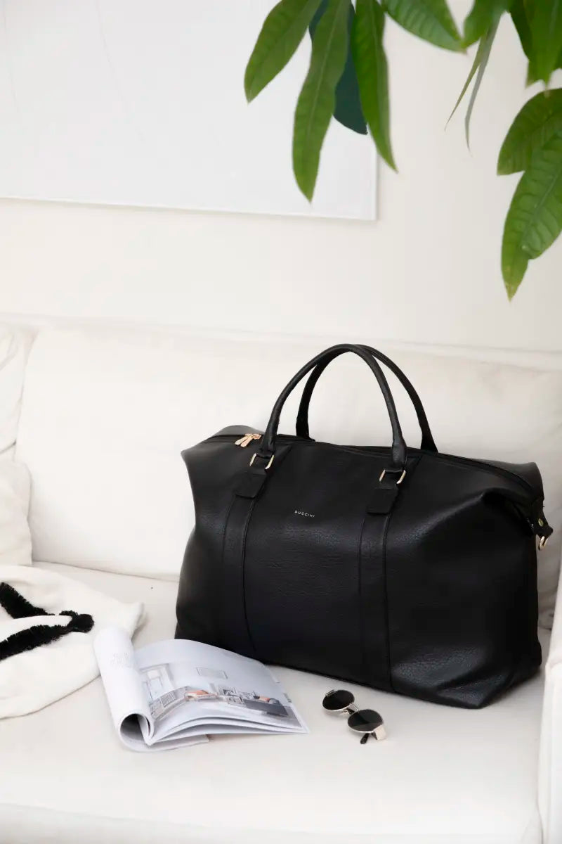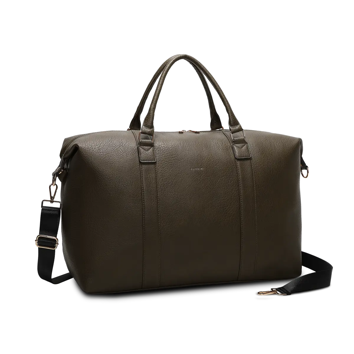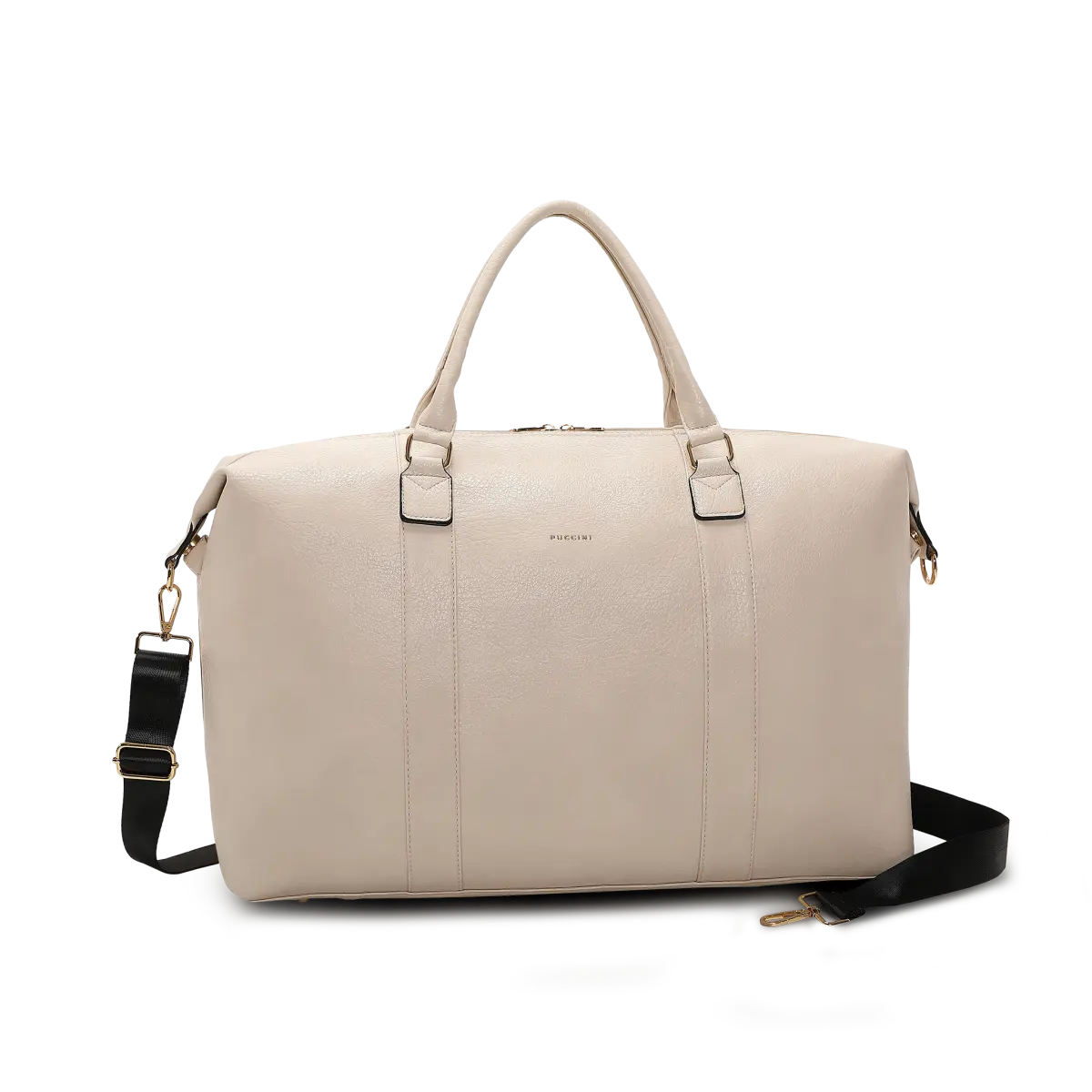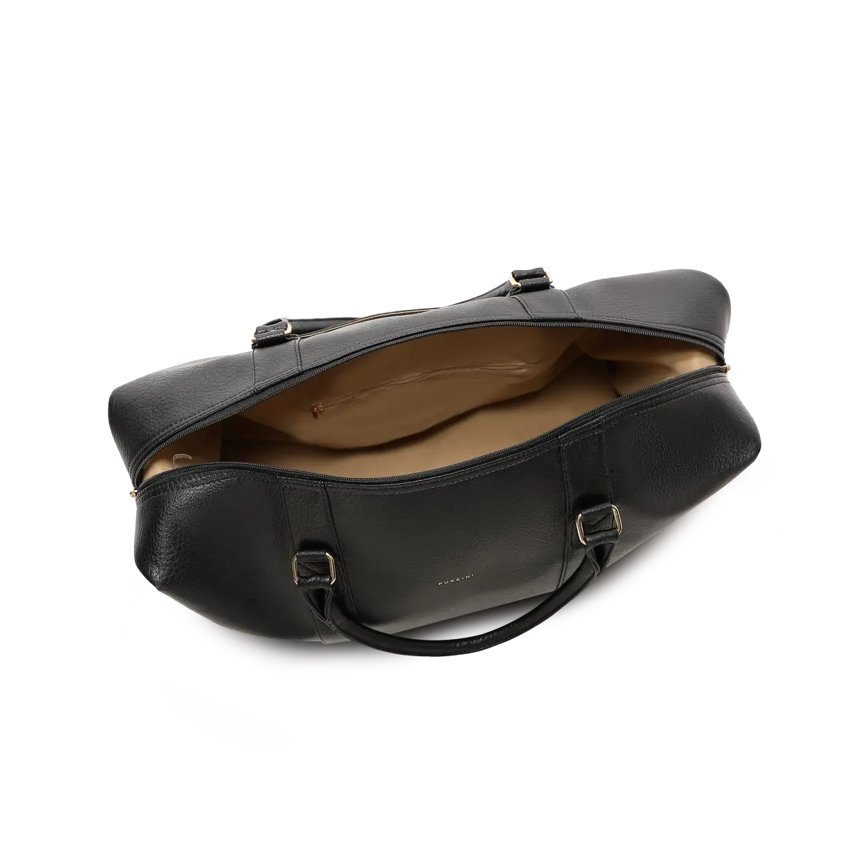 Puccini Disa är en weekendbag som kombinerar rymlighet med en elegant design. Tillverkad i mjuk, veganvänlig skinnimitation, erbjuder denna bag en sofistikerad look med guldfärgade metalldetaljer. Den är idealisk för weekendresor, övernattningar eller som kabinväska, och ger dig möjlighet att packa allt du behöver utan att kompromissa med stilen.