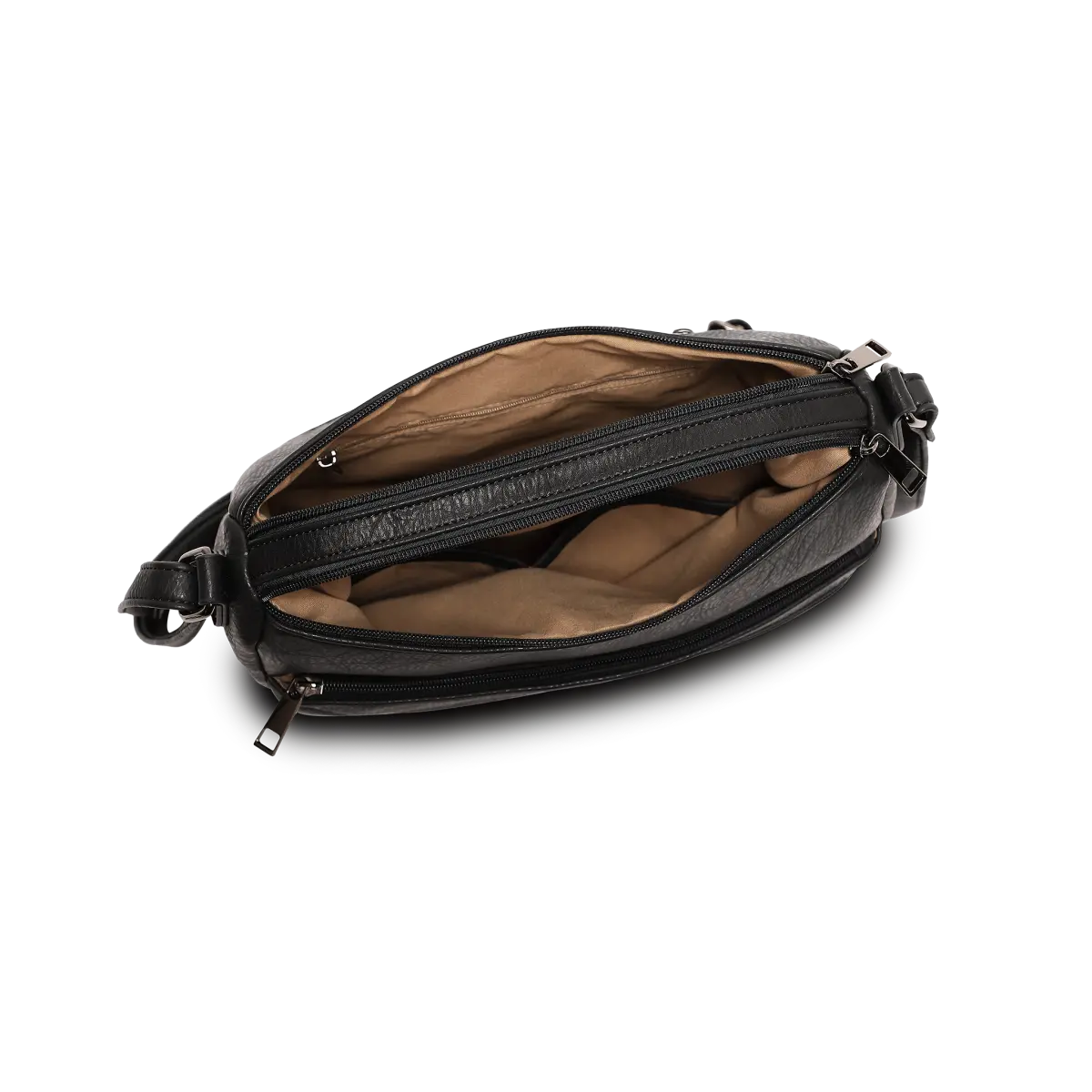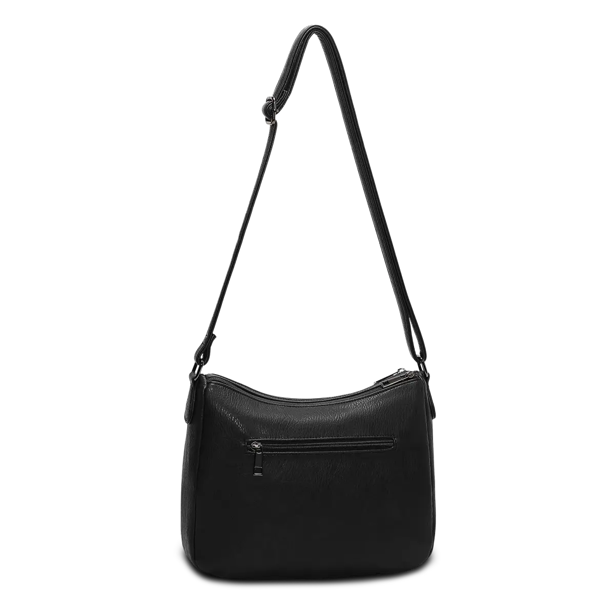 Väskan har två separata huvudfack med dragkedjor som gör det enkelt att hålla ordning och få en tydlig överblick över dina saker. Invändigt finns ett blixtlåsförsett sidofack samt två öppna fack – perfekta för mobil, nycklar och andra småsaker. På framsidan finns två praktiska fickor med dragkedja (25 cm och 13 cm) för snabb åtkomst, och på baksidan ytterligare ett 18 cm långt fack för säker förvaring. En idealisk väska för dig som värdesätter ordning och funktion.